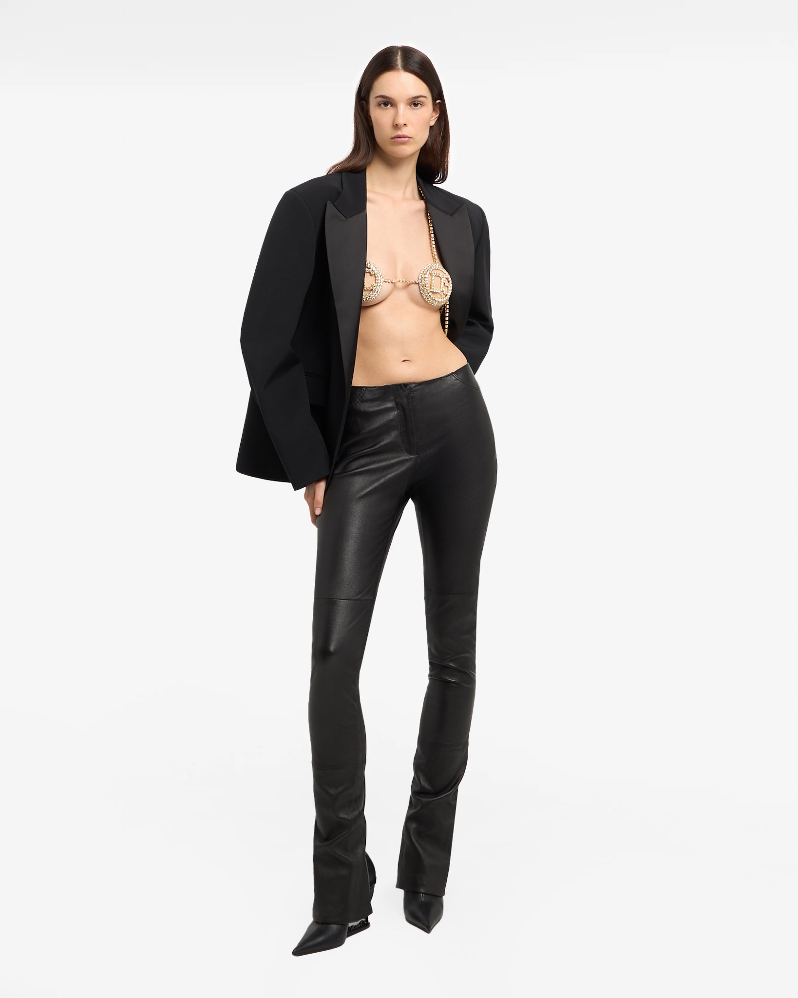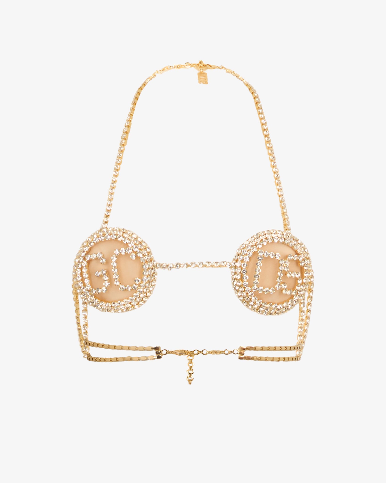 GCDS bra with rigid cups adorned with three rounds of rhinestones and logo letters. Cups internally lined with flesh-colored tulle with crystals cup chain.