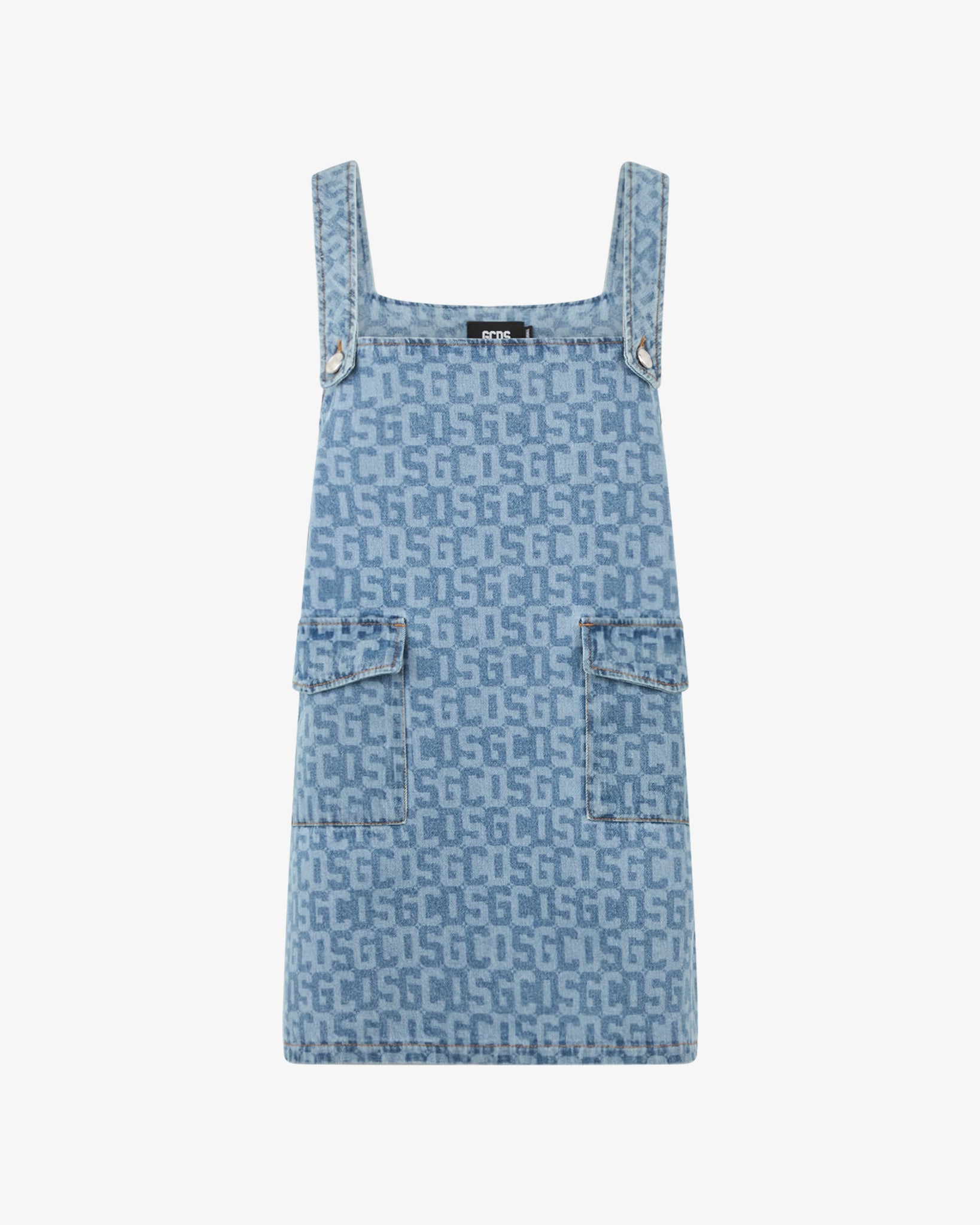 Mini overall dress crafted from light blue stonewashed denim. It features a laser-etched monogram design, contrast tobacco stitching, and sandblasted nickel stud buttons on the straps. The dress includes a double compact pocket applied on the front.