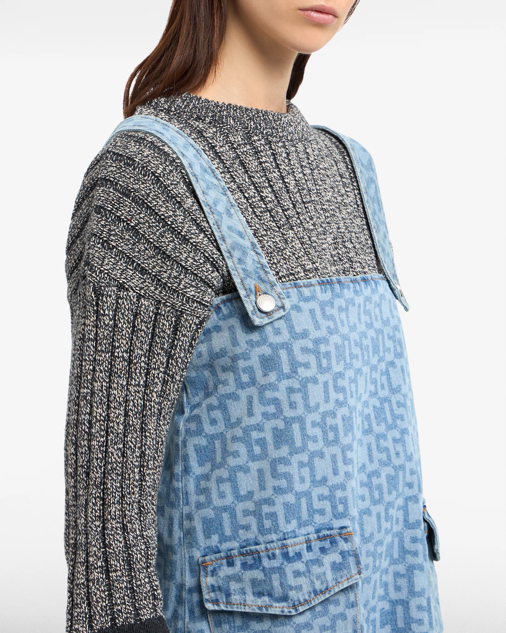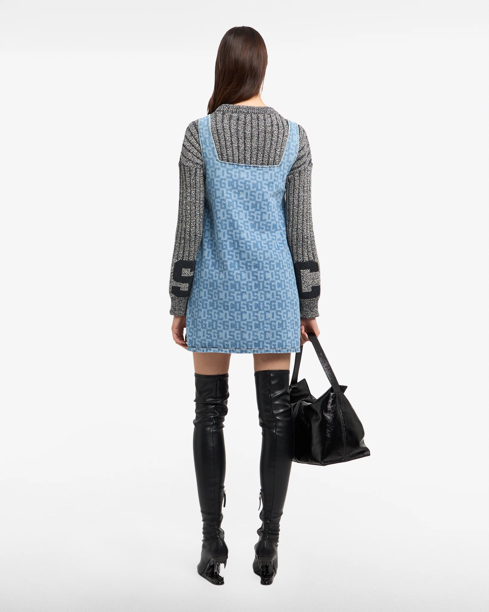 Skip to contentMini overall dress crafted from light blue stonewashed denim. It features a laser-etched monogram design, contrast tobacco stitching, and sandblasted nickel stud buttons on the straps. The dress includes a double compact pocket applied on the front.