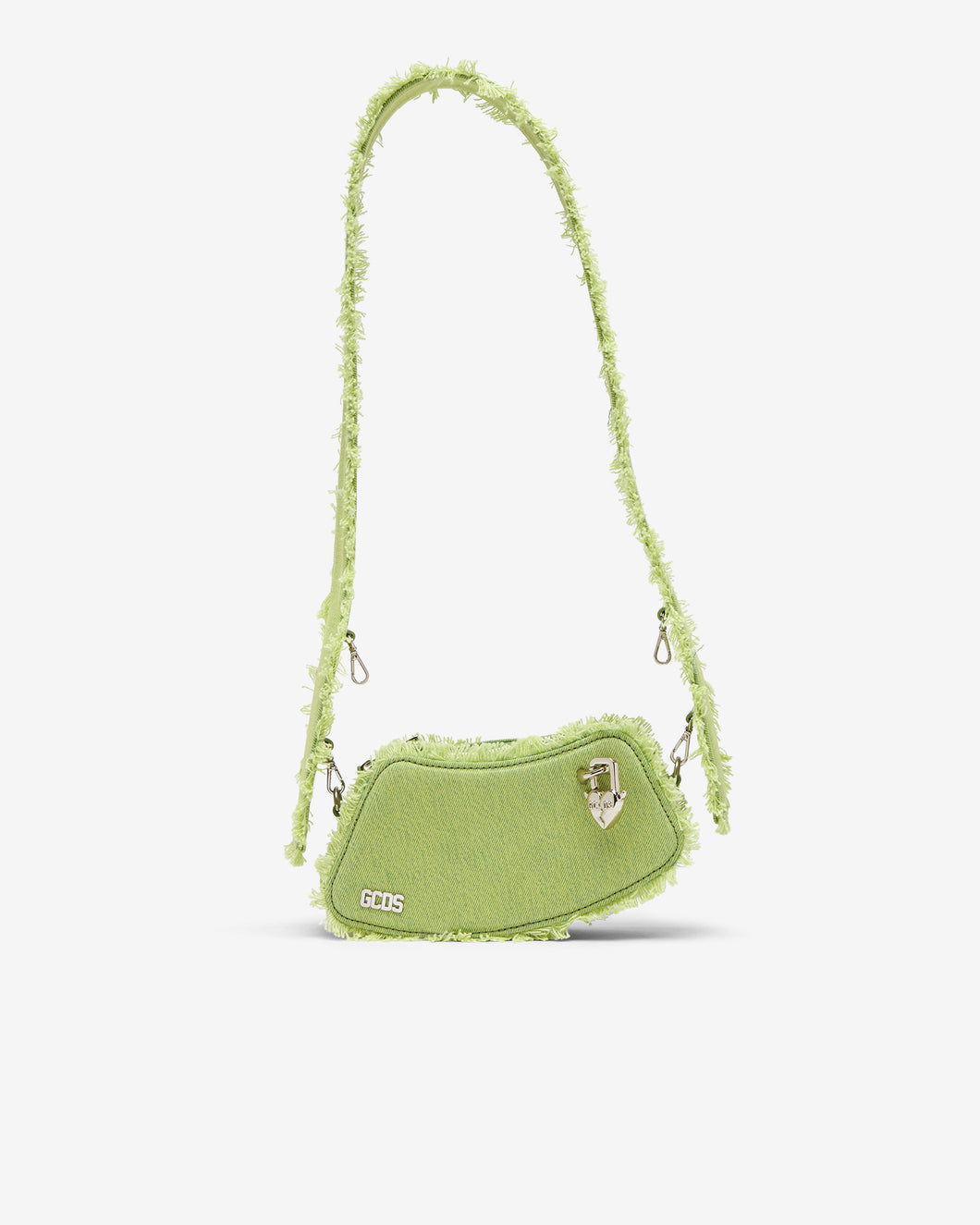 Small curve-shaped overdyed bleached denim structured crossbody comma bag with a distressed effect. Adjustable denim handle with 4 semi-hidden snap hooks. Two leather loops on the back of the bag allow it to be worn on the belt. Polished nickel logo plaque and GCDS “piercing cuore” snap hooks on the front. Jacquard logo lining and leather trim with heat-embossed logo on the inside.