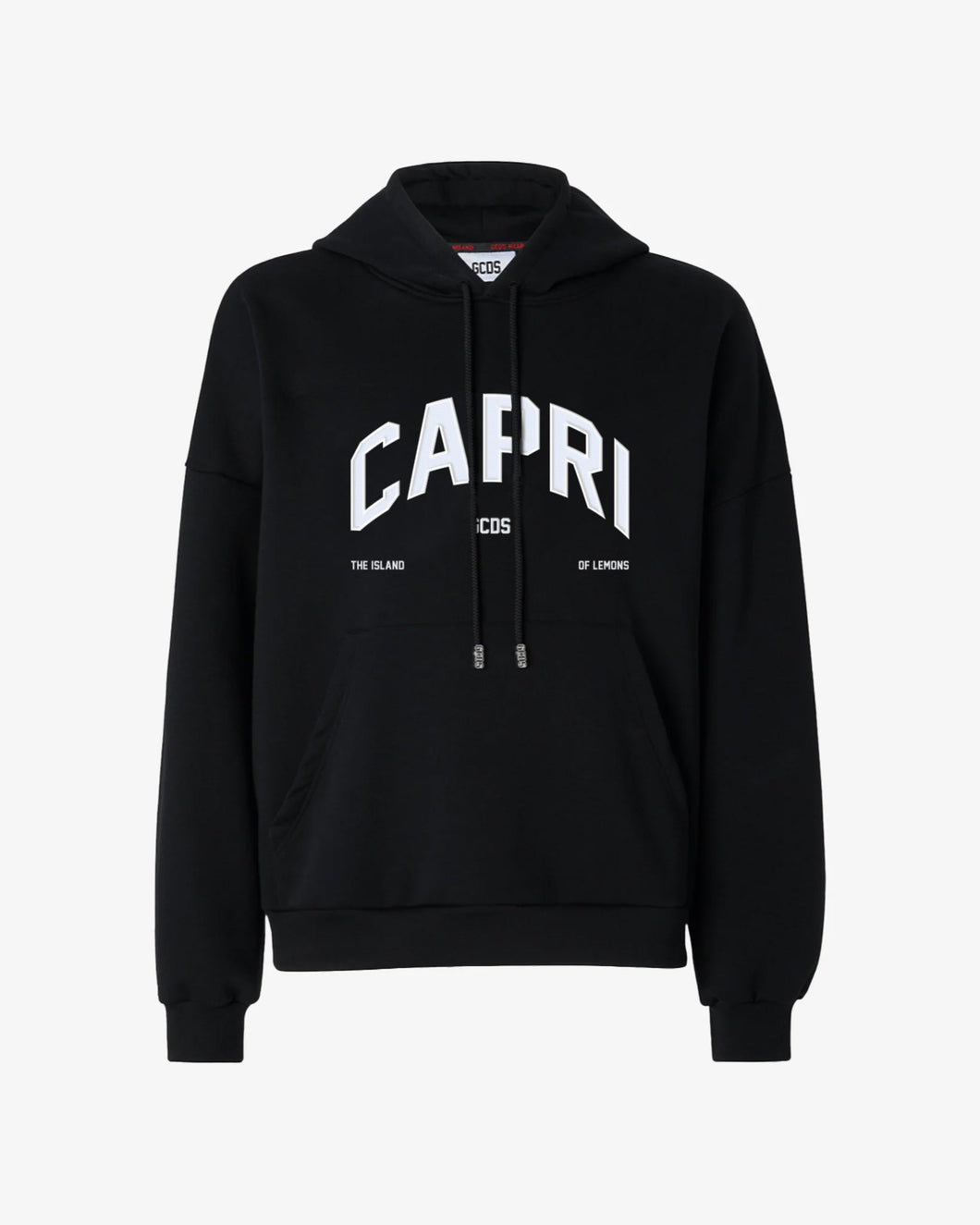 Oversized hoodie made from cotton jersey. Adjustable hood with logoed cord aglets. Long sleeves with cuffs and pouch pocket. The hoodie features the contrasting lettering CAPRI reapplied on the front