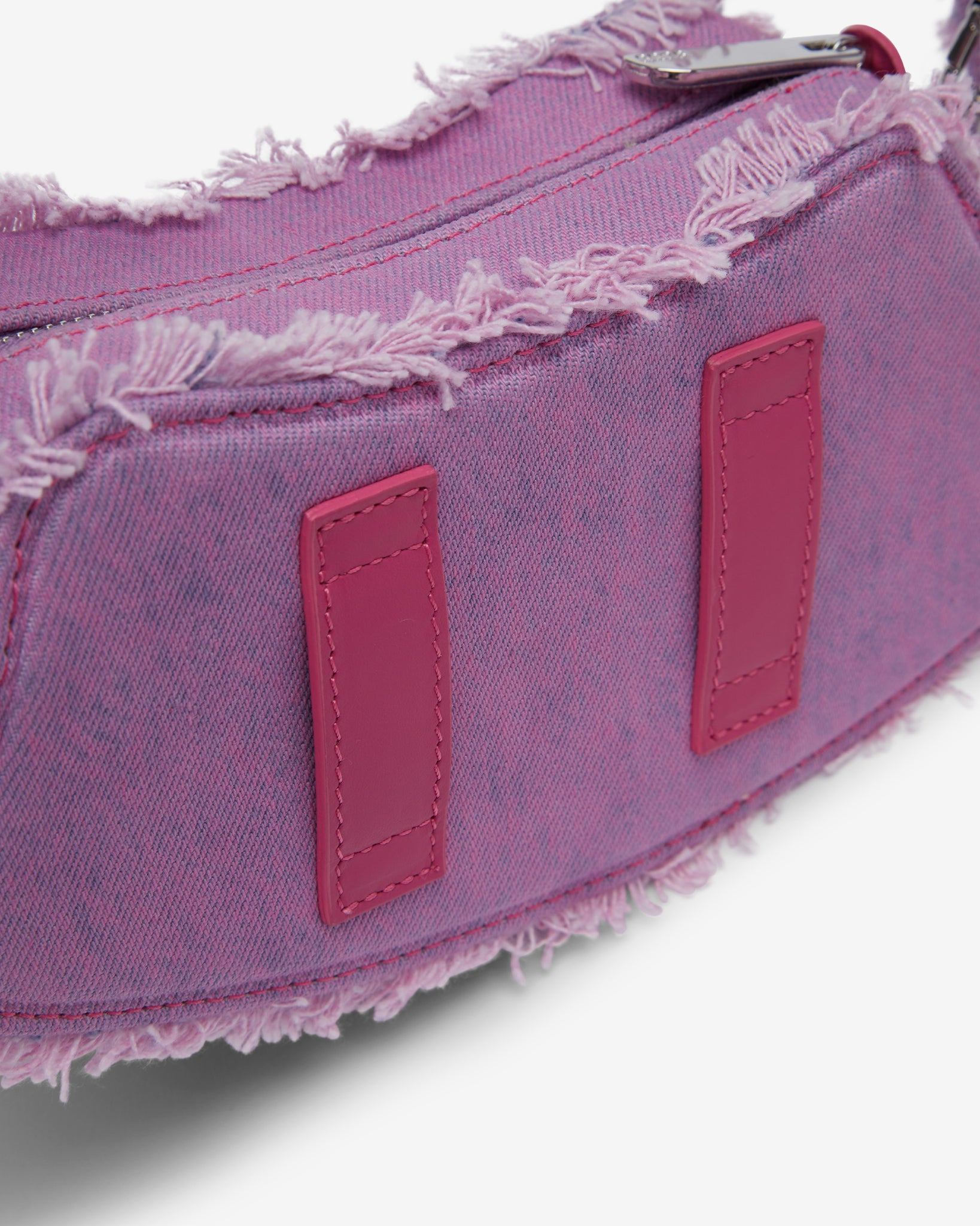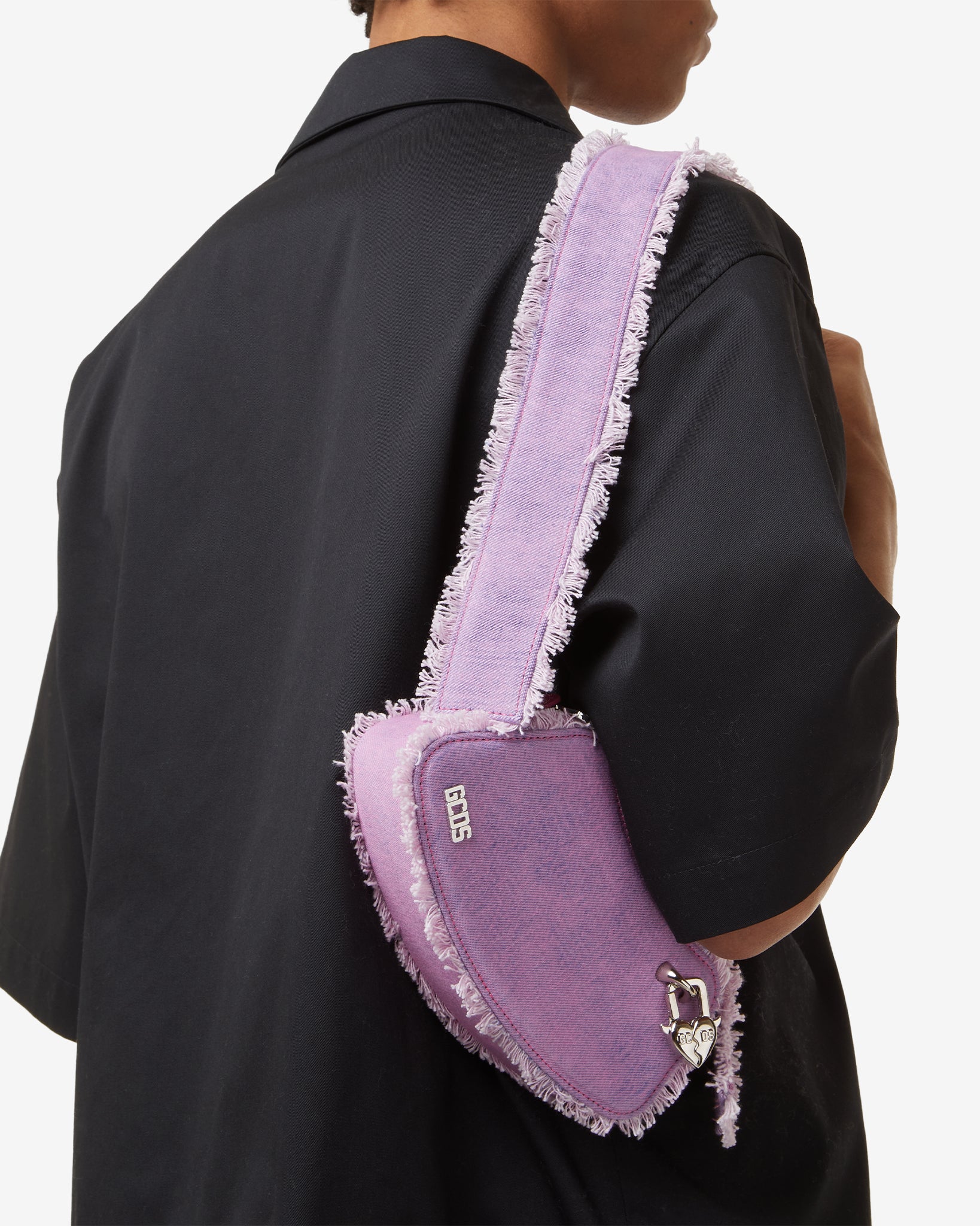 Small curve-shaped overdyed bleached denim structured crossbody comma bag with a distressed effect. Adjustable denim handle with 4 semi-hidden snap hooks. Two leather loops on the back of the bag allow it to be worn on the belt. Polished nickel logo plaque and GCDS “piercing cuore” snap hooks on the front. Jacquard logo lining and leather trim with heat-embossed logo on the inside.