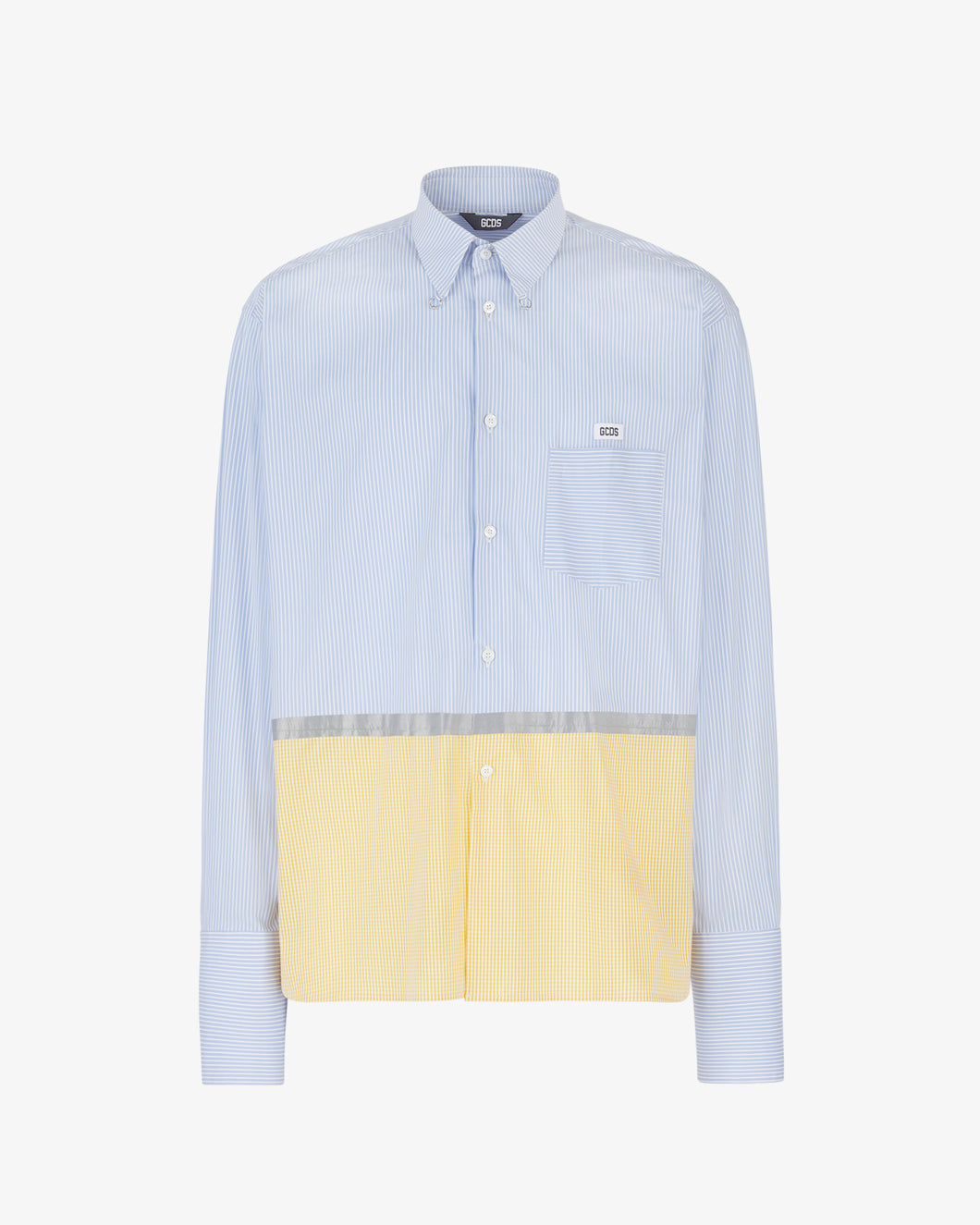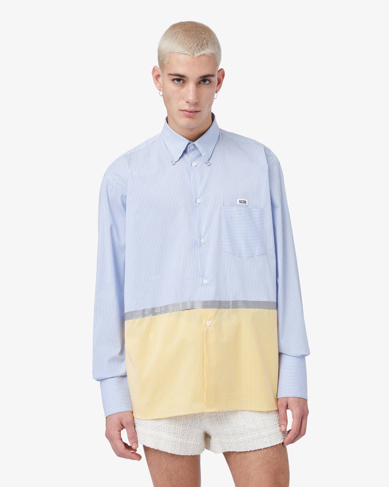 Relaxed fit shirt made of cotton blend. Bowling collar and long sleeves with double button cuff. Front closure with buttons. The garment features a double pattern, stripes and checks are embellished with Framis reflective ribbon.