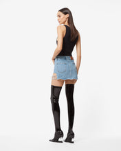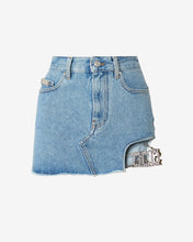 Light bleached stone washed denim low-waisted mini skirt. Tobacco-colored top-stitching. Side slit on the left leg with crystal GCDS logo choker detailing. Raw-cut at the bottom.