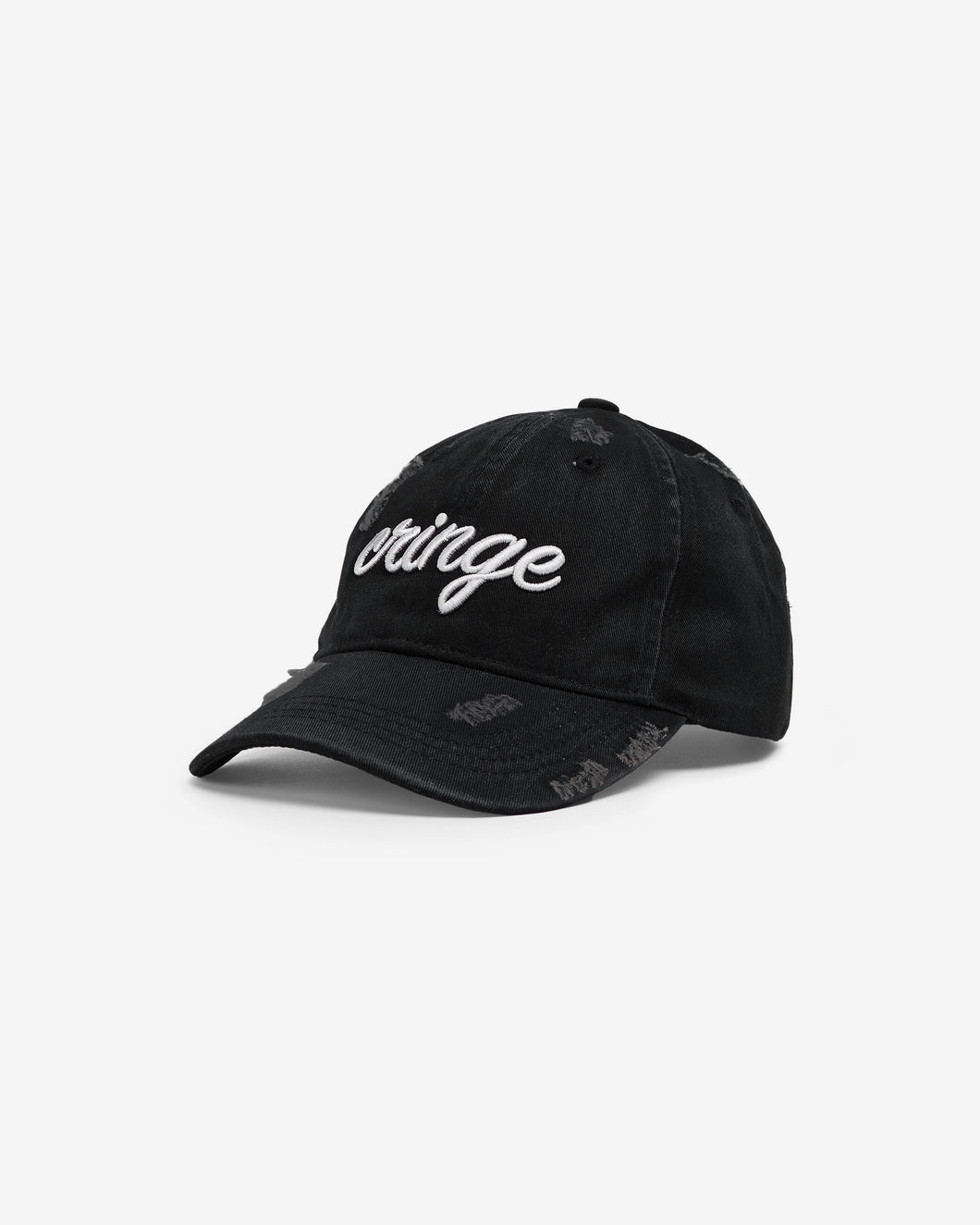 Cotton gabardine baseball cap with visor. Contrasting embroidered Cringe lettering and scattered breaks. Adjustable at the back.