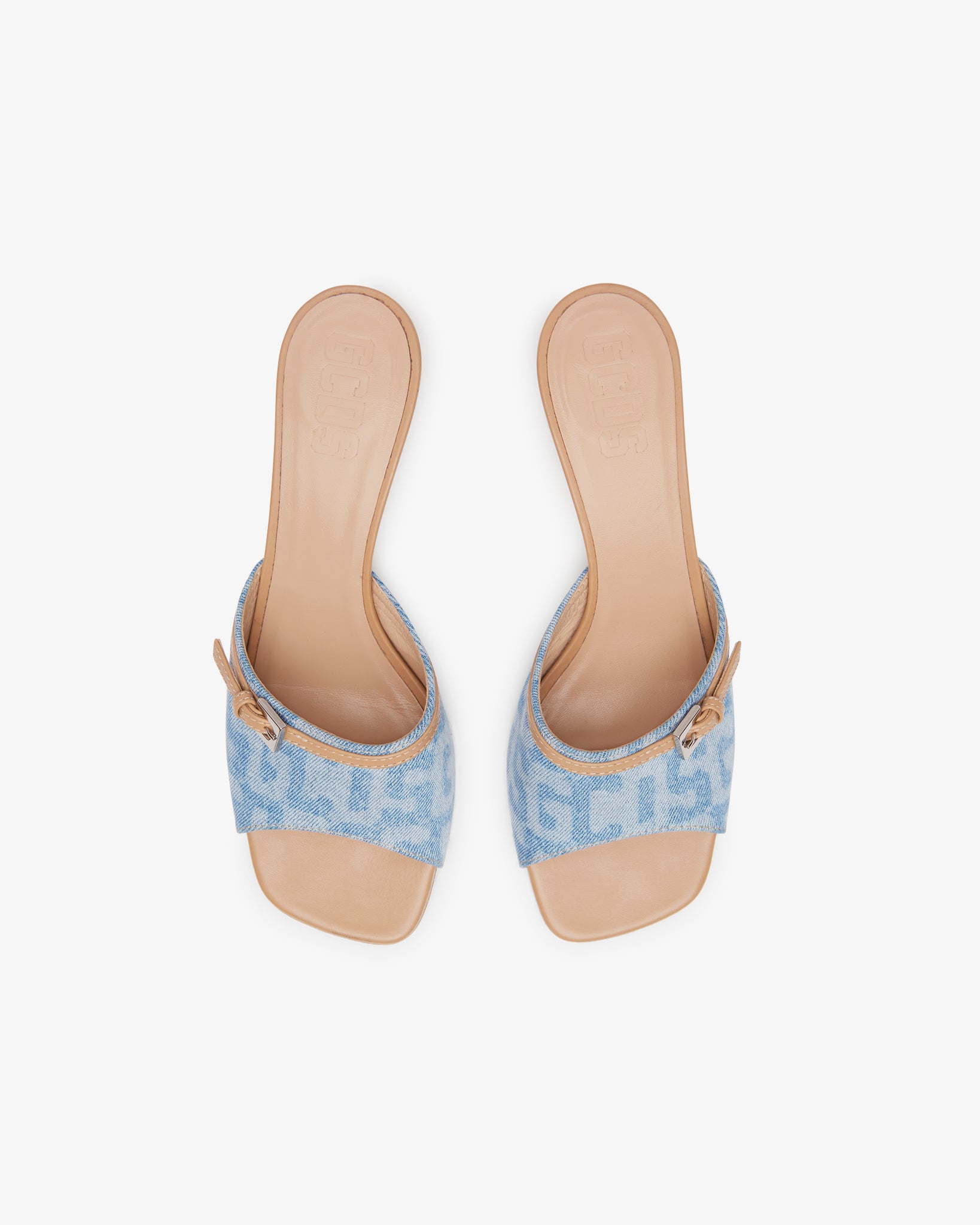 Sandali in tela GCDS Monogram Denim laserato con cinturino in pelle e dettaglio metalleria argentata. Tacco kitten con modulo con catena "GCDS Cube" metallizzato che conferisce alla calzatura un tocco distintivo.