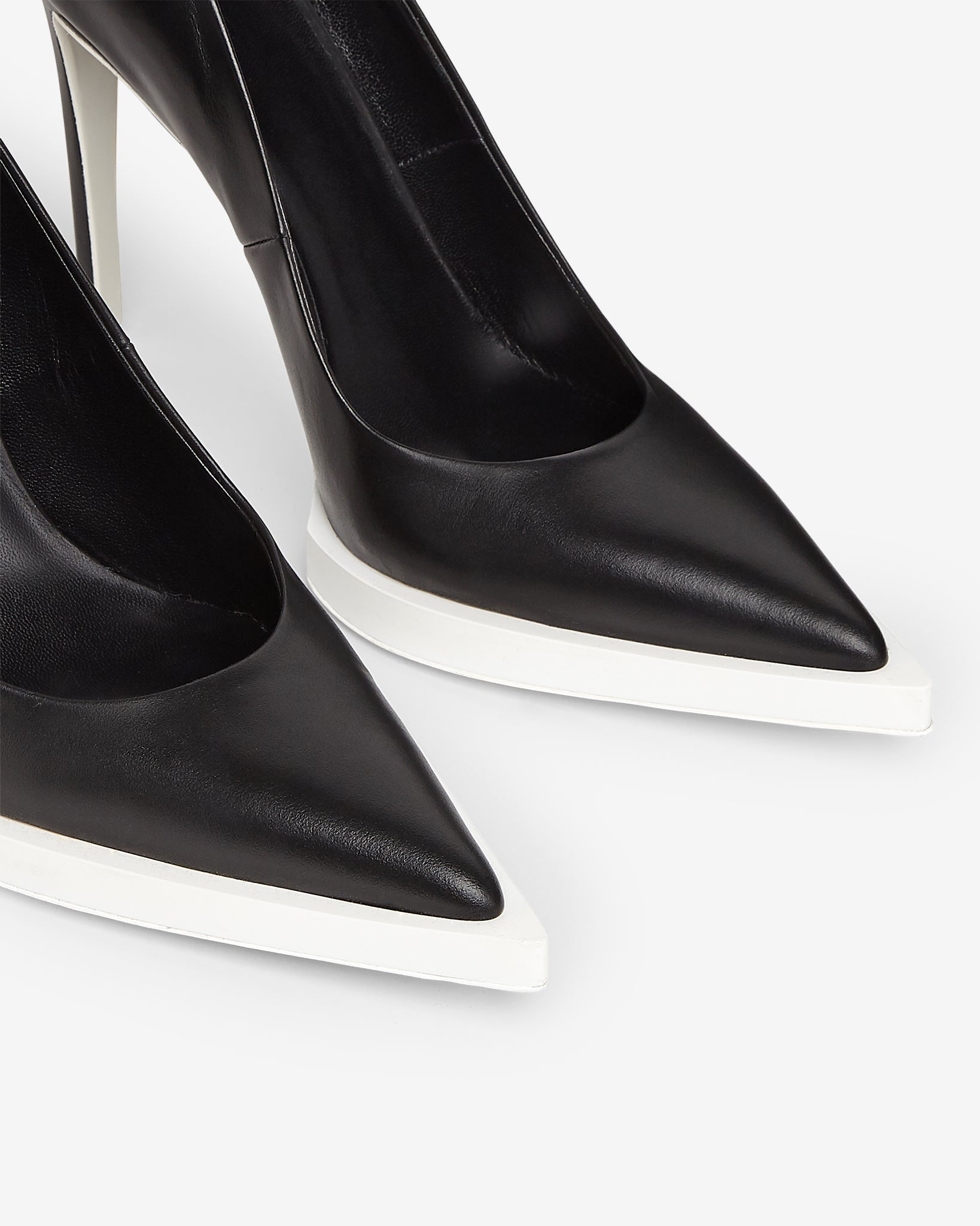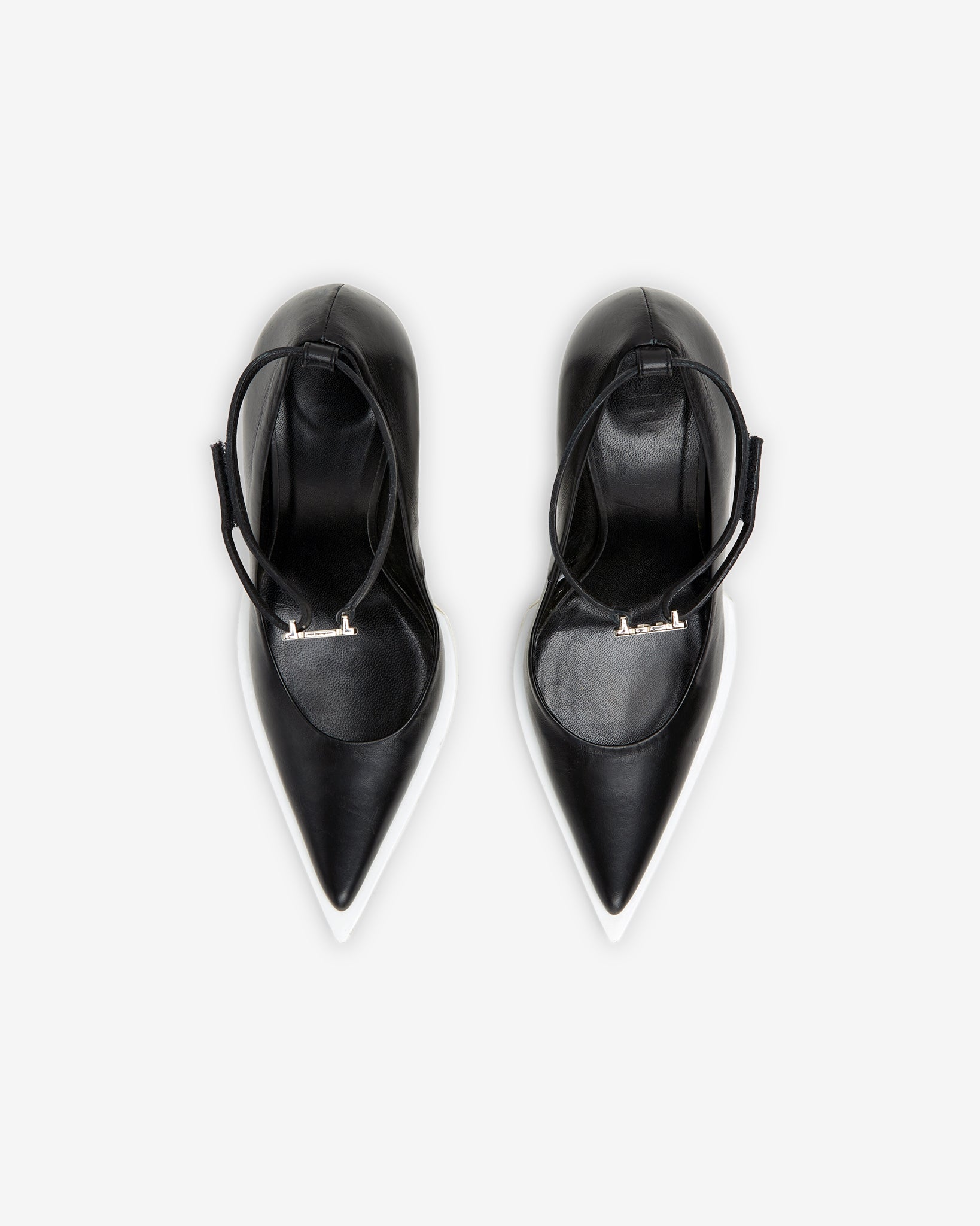 Decolleté in pelle con tacco a stiletto caratterizzata da plateau sporgente che accentua la linea della punta. Cinturino alla caviglia con logo GCDS in nichel lucido e chiusura velcro.