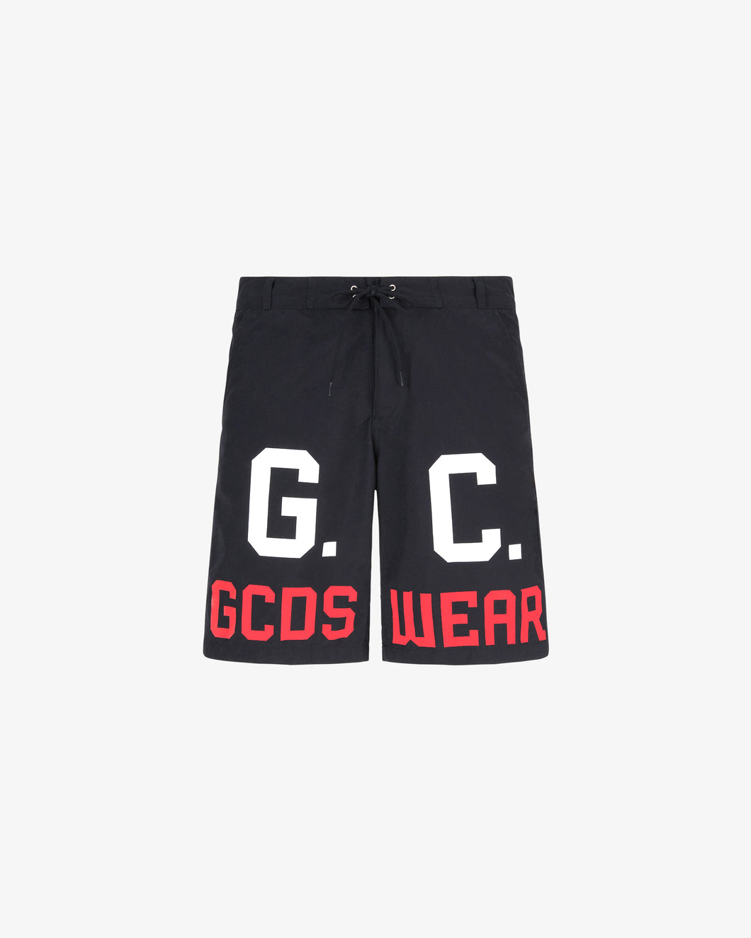 Swim shorts with "G.C Wear" logo on the front. Elasticized waist with loops and adjustable with drawstrings. On the back, detail of applied pockets.