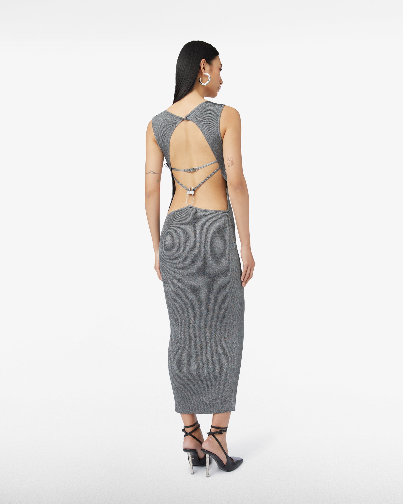 Long sleeveless dress in metallic-effect rib with built-up cup on the front. The feminine silhouette is further accentuated by the deep neckline on the back enriched by a knitted braid with shiny nickel logo hoop.