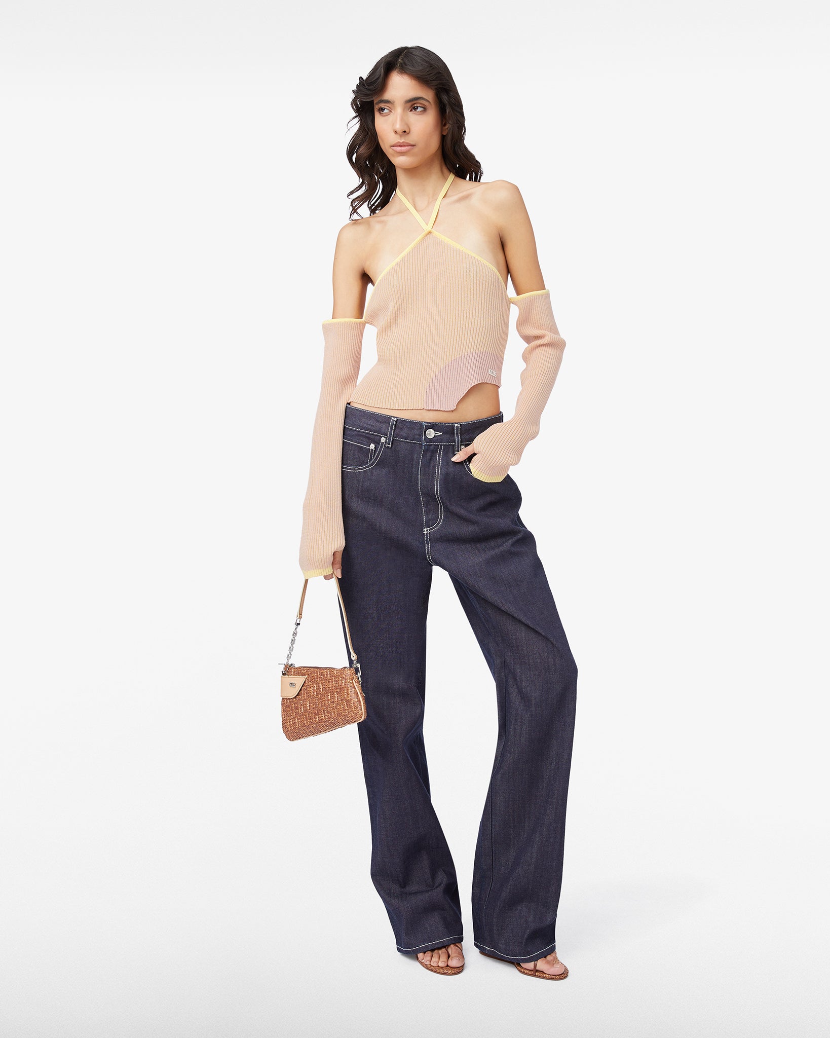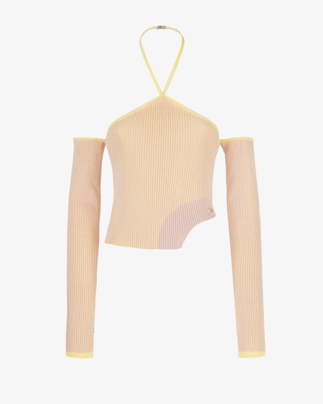 Bicolor ribbed vanisé viscose top. Crossed neckline with a closure at the back with a shiny nickel logo clip. Glove-like sleeve. Contrast yellow trim. Hem with comma detail and shiny nickel logo plaque.
