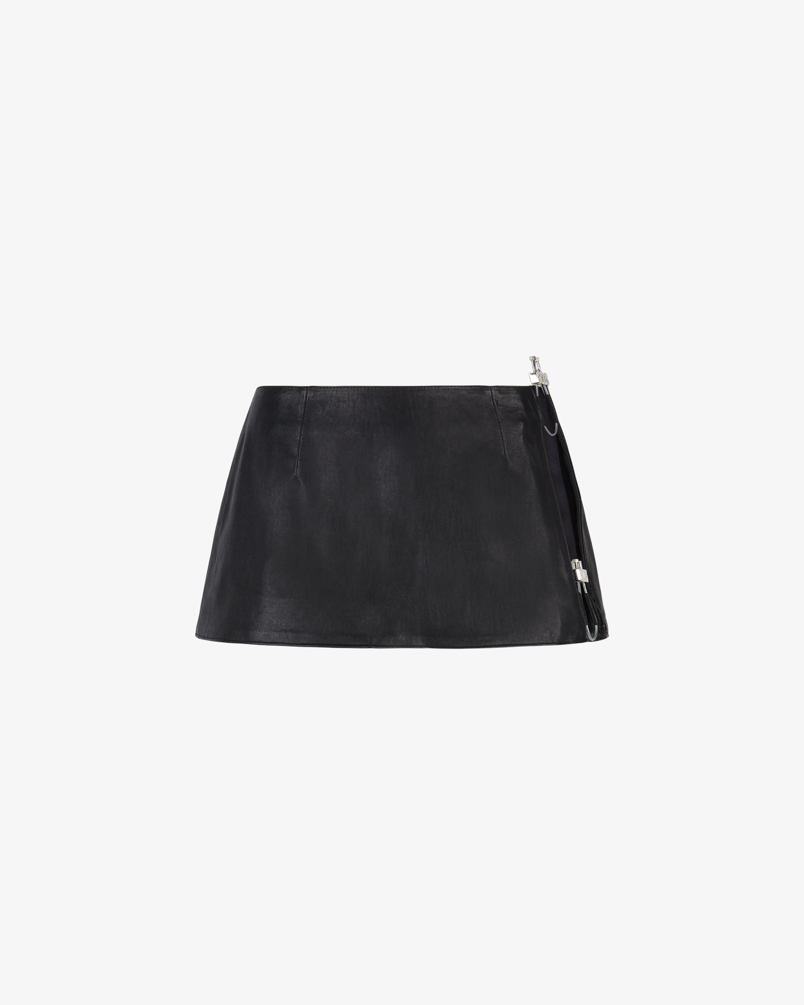 Medium-rise black nappa leather miniskirt. Detail of double logoed Hoop. Side closure with concealed zipper in the seam.
