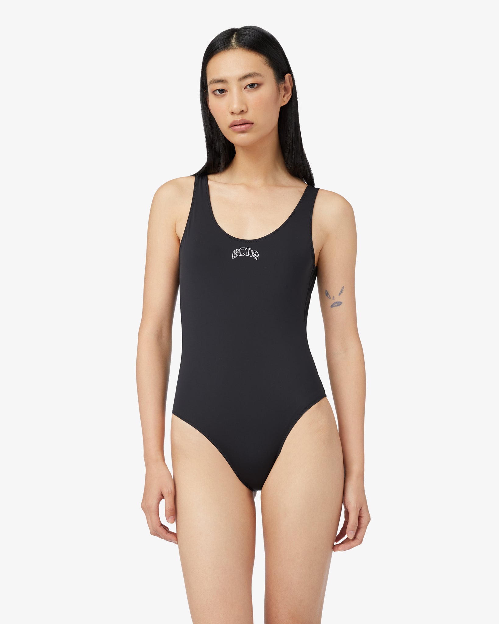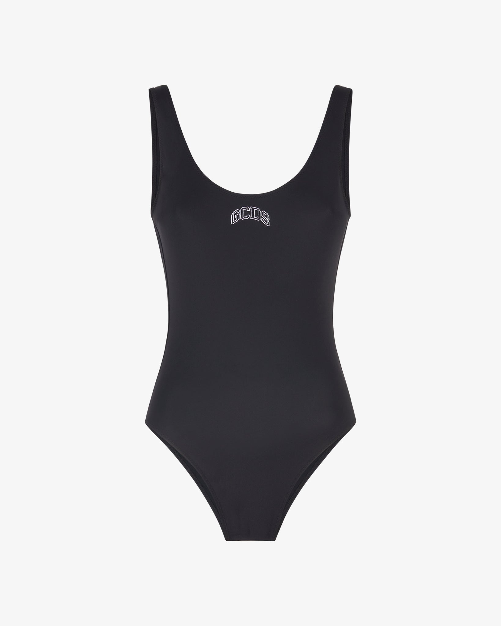 One-piece swimsuit with a form-fitting silhouette and a back neckline. Contrast embroidered "GCDS Lounge" logo on the center front.