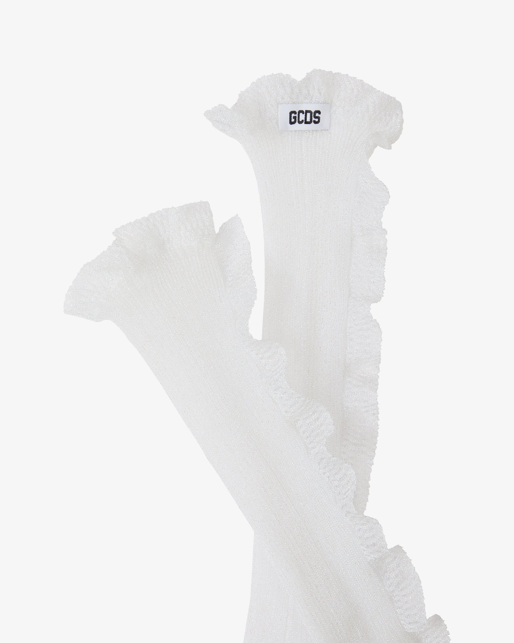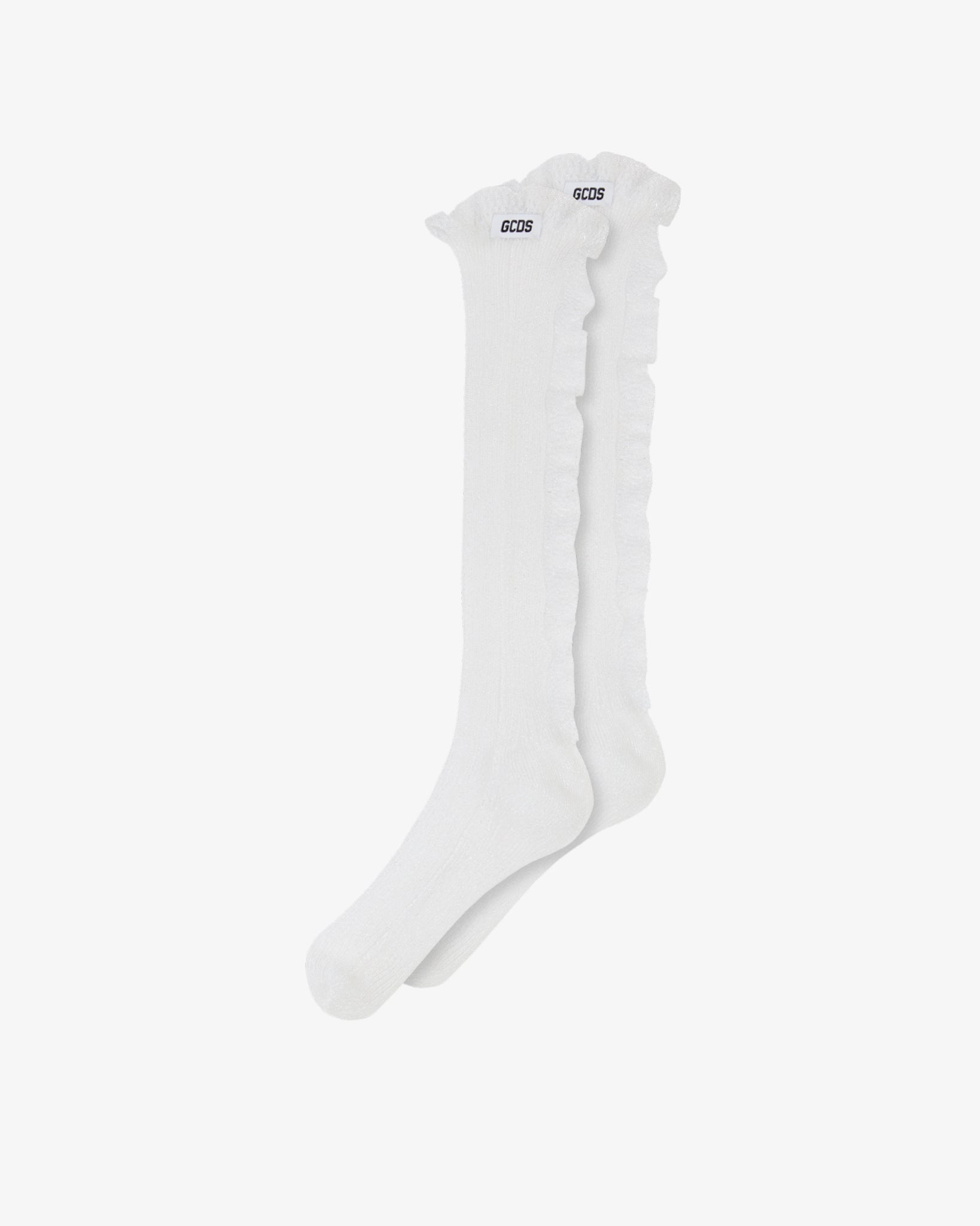 Long socks in lightweight stretch fabric, characterised by a ribbed knit and embellished with a bright lurex yarn. Wavy profile detail and Jacquard label with GCDS logo.