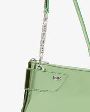 Comma Notte bag, small size, made of green laminated material. Asymmetric silhouette enhanced by piping and silver metallic details.