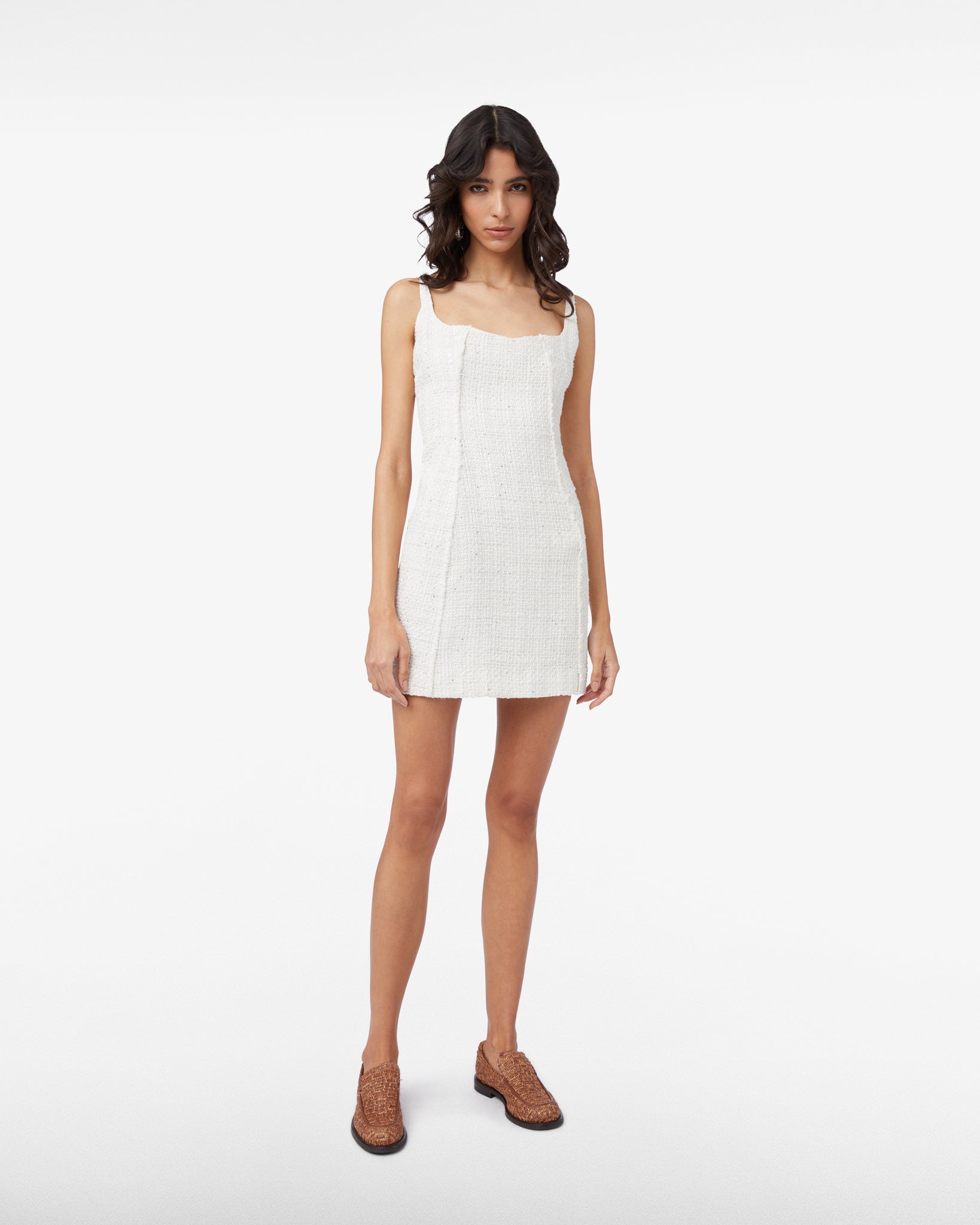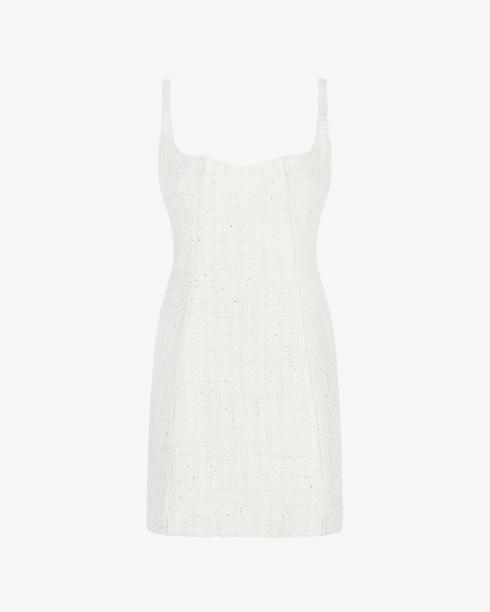 Mini dress made of cotton-blend tweed, embellished with bright sequins and characterized by a square neckline. The feminine silhouette is accentuated by the bell-shaped skirt and deep neckline on the back.