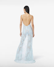 Long one-piece jumpsuit made from lace with floral decorations and GCDS logo. The uniqueness of the garment is accentuated by the train and deep neckline on the back, enriched with a tonal ribbon and logo clip.