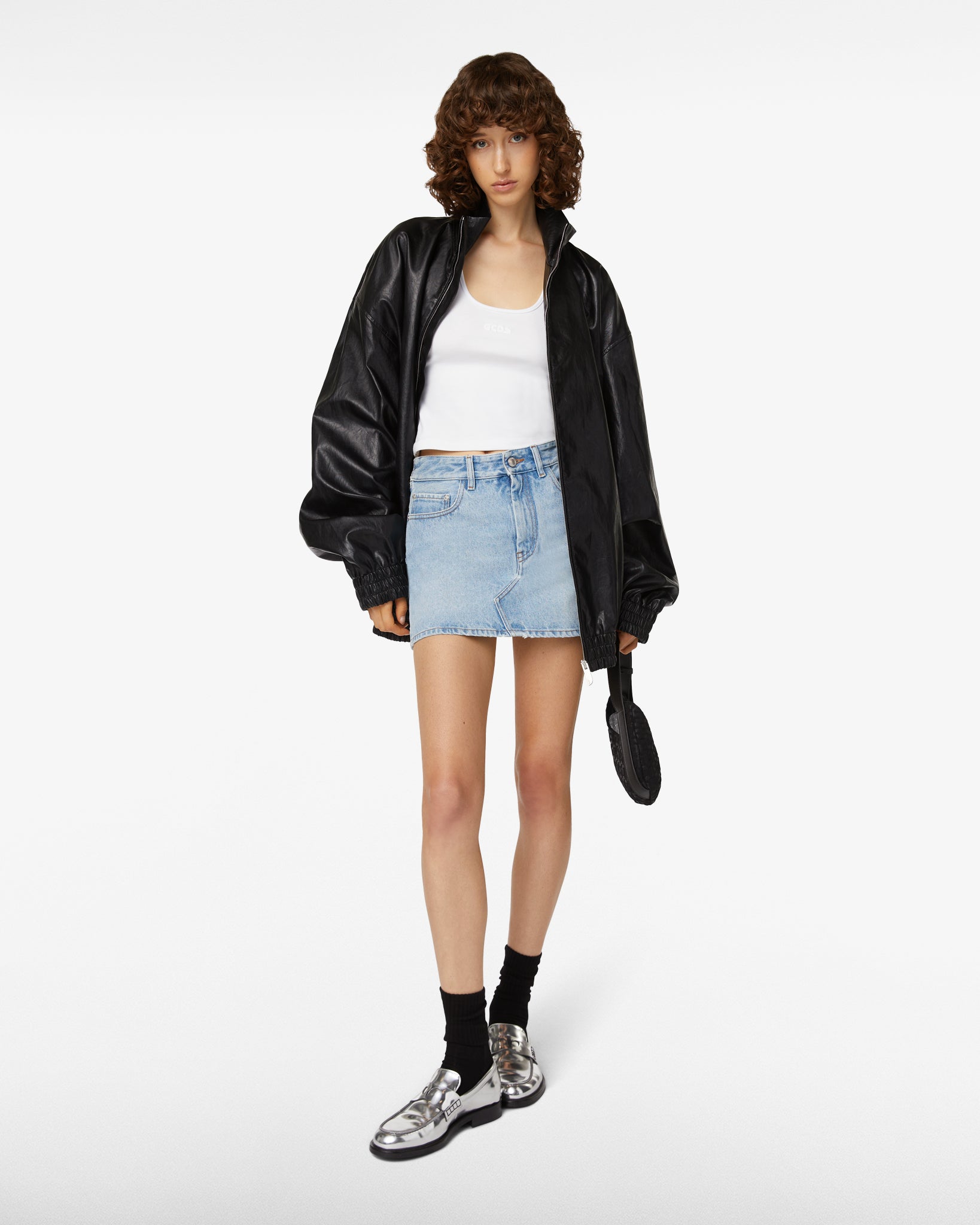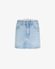Low waist miniskirt in light denim with washed-out effect. Front zipper and metal button closure. Enriching the garment is the iconic rhinestone GCDS logo choker on the back.
