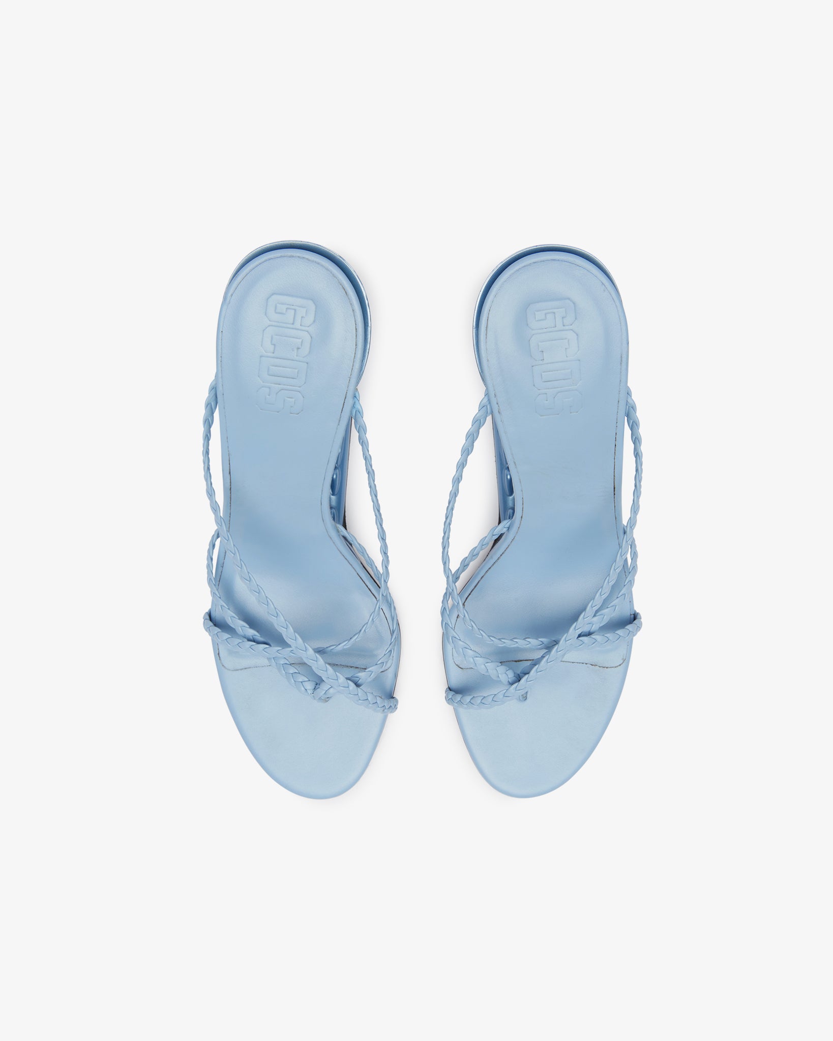 Sandals featuring the iconic Morso heel with an enamelled finish. Upper enriched matching criss-cross straps with braid detail and flip-flop slinging. Rounded toe.