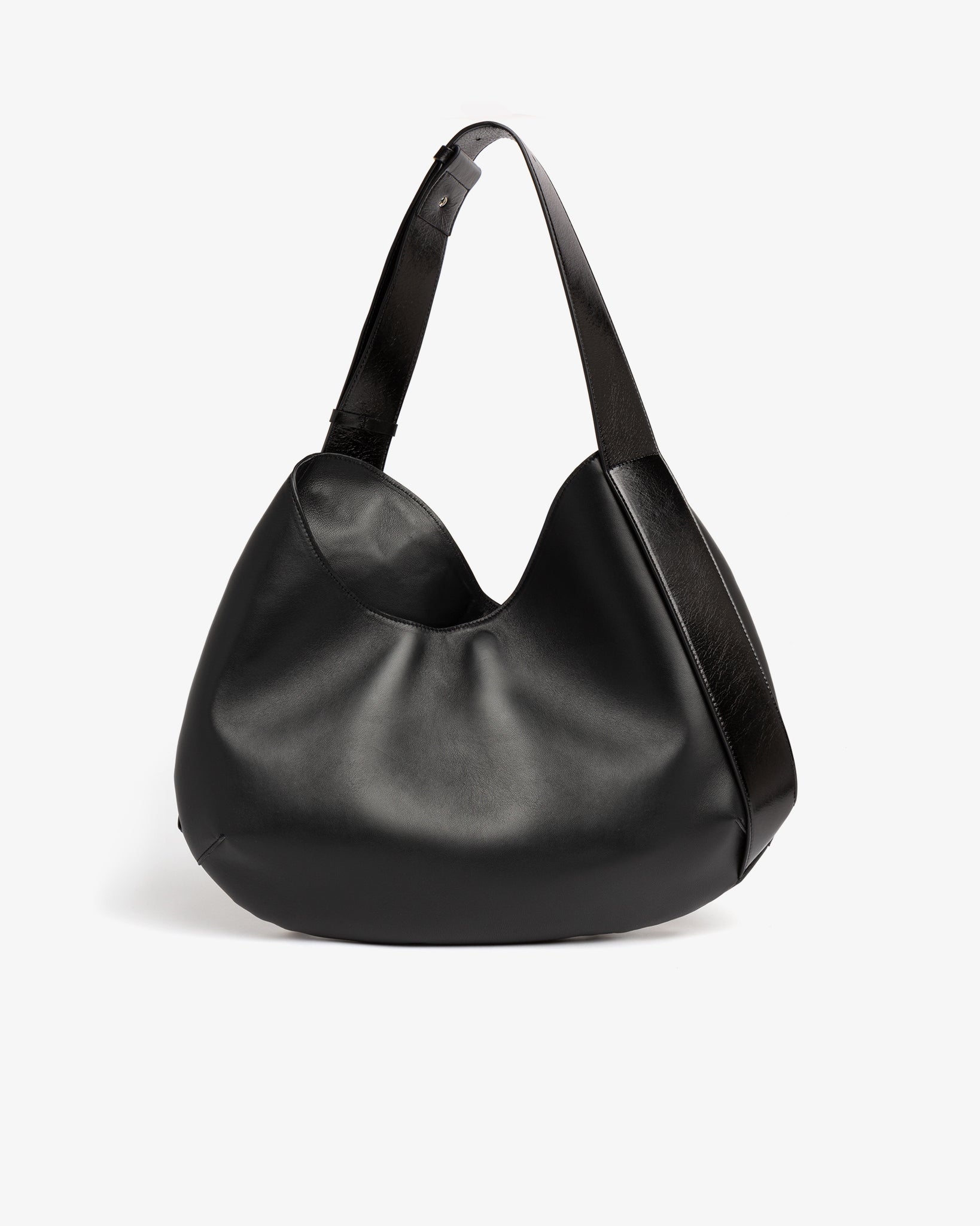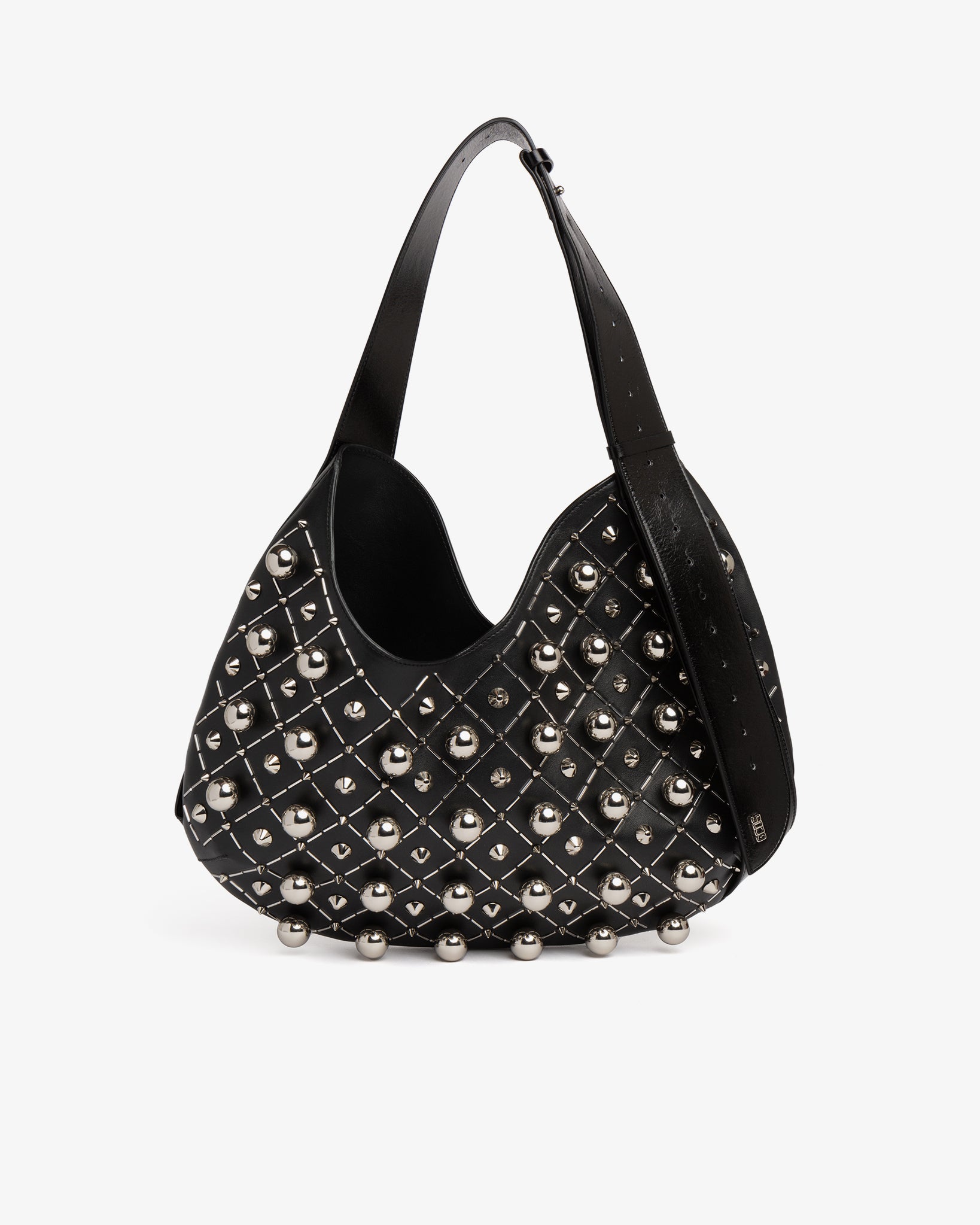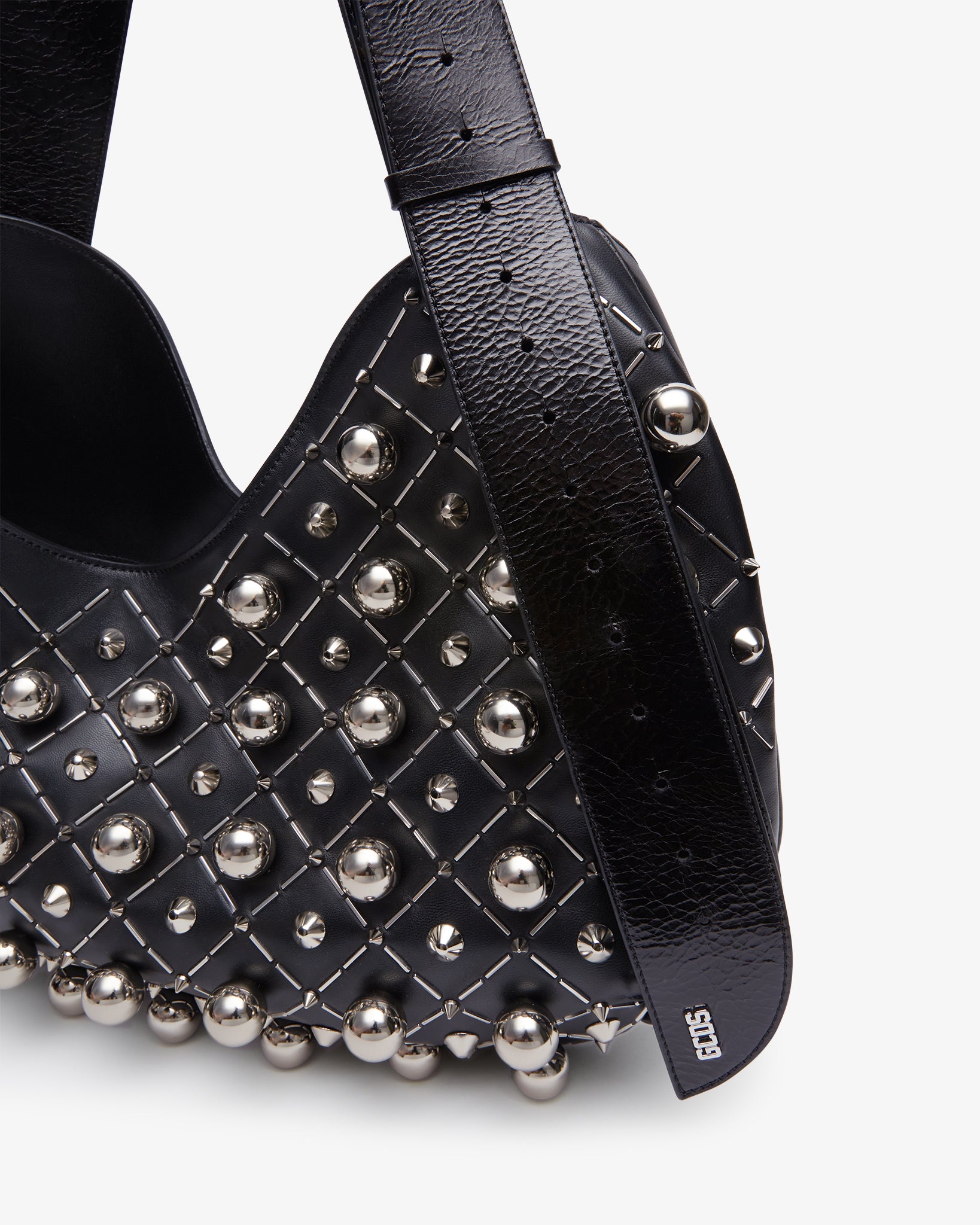 Hobo bag, large size, featuring a curved mirrored shape and an adjustable asymmetrical handle. Made of nappa leather. Magnetic closure and shiny nickel GCDS logo plaque applied to the end of the patent leather handle. Features checkerboard-effect patchwork studding.