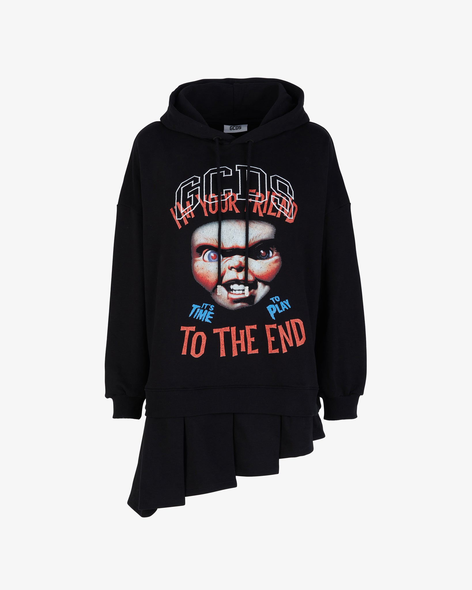 Cotton fleece hoodie dress featuring an asymmetric pleated mini skirt. This piece showcases a screen-printed Chucky design and GCDS embroidery.