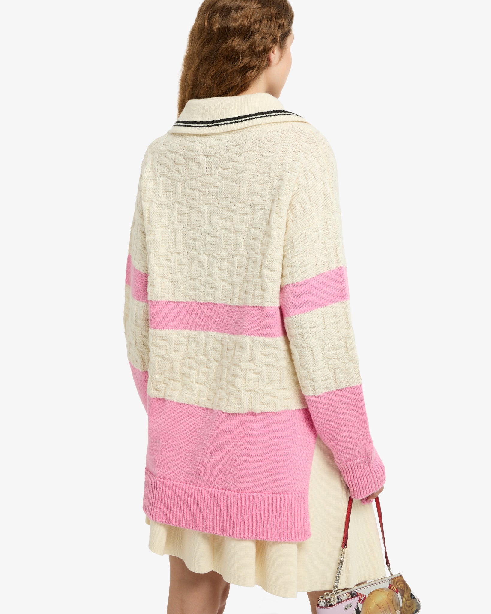 Skip to contentOversized V-neck sweater featuring a polo collar with logo. The body is crafted with a monogram using jacquard technique on both sides, interspersed with pink knit bands.