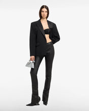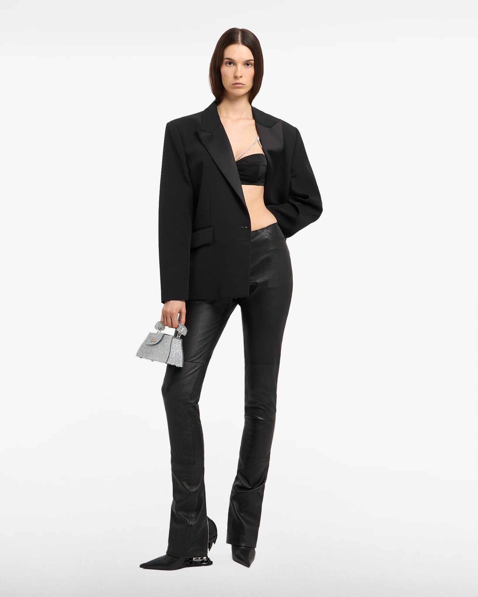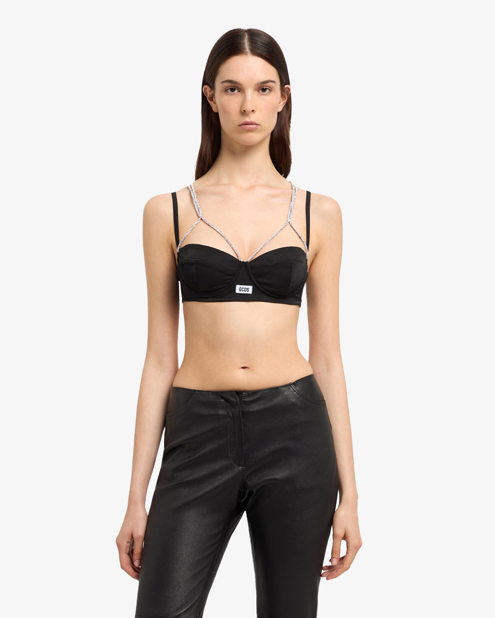 Black satin balconette bra featuring detachable, crisscross rhinestone straps. It includes a front logo label.