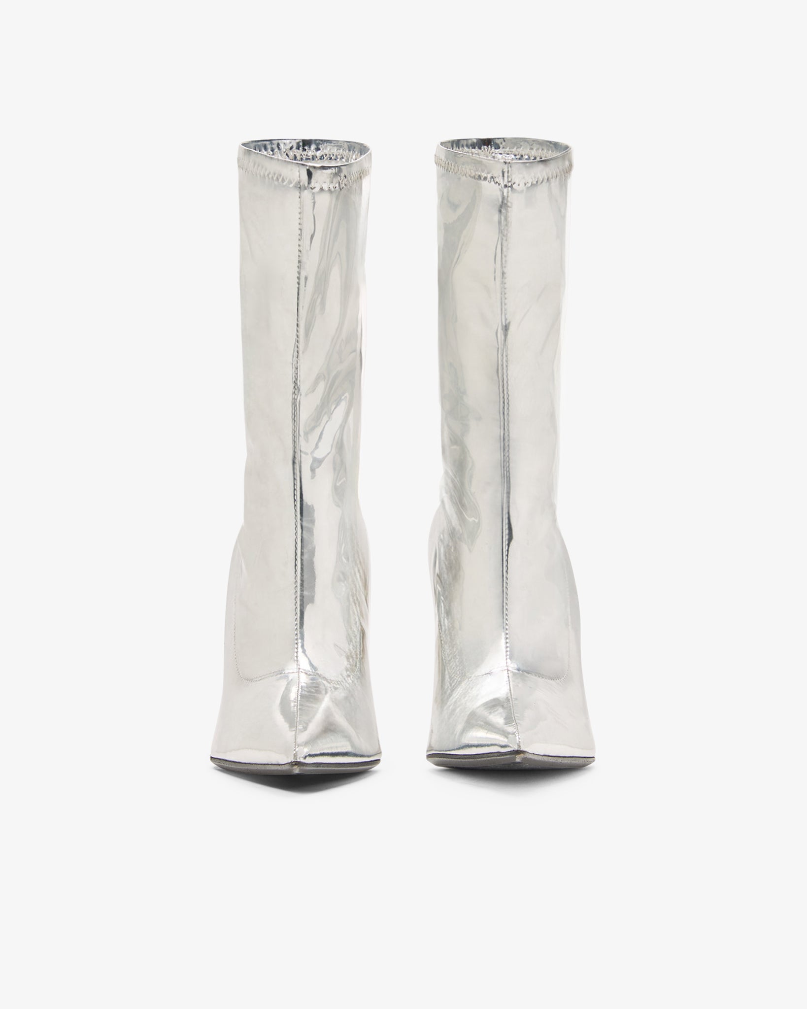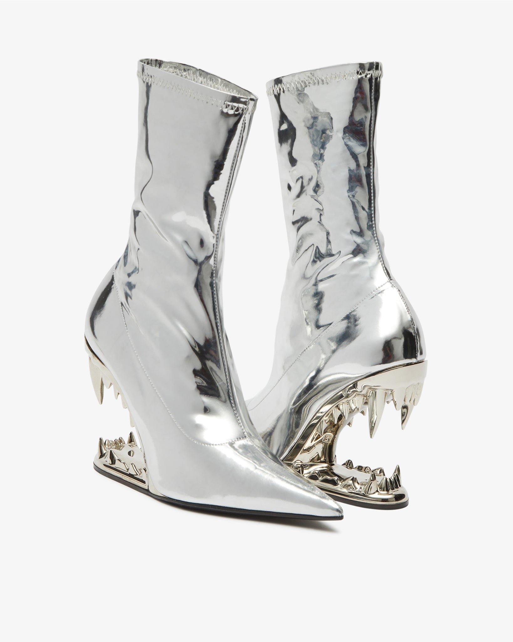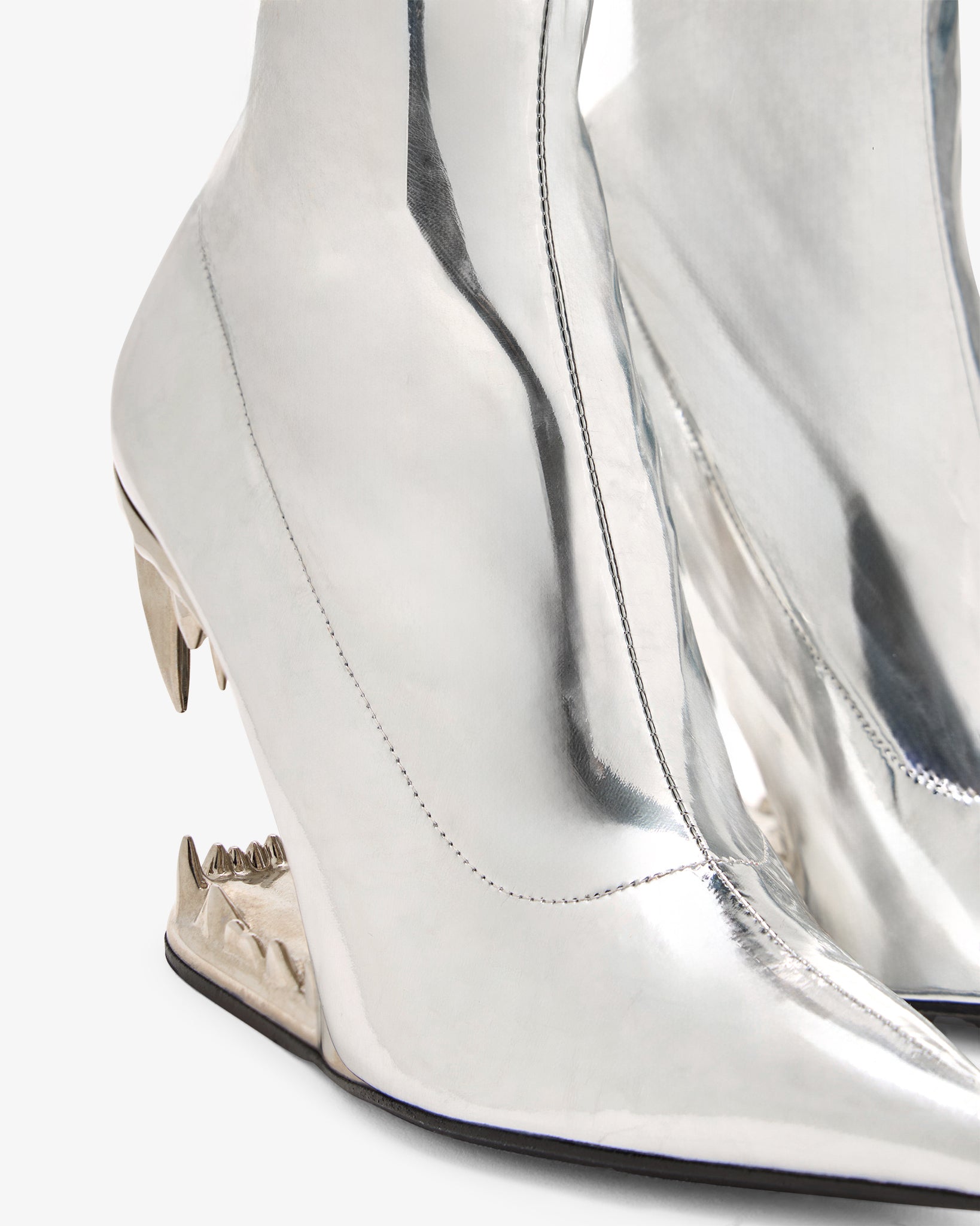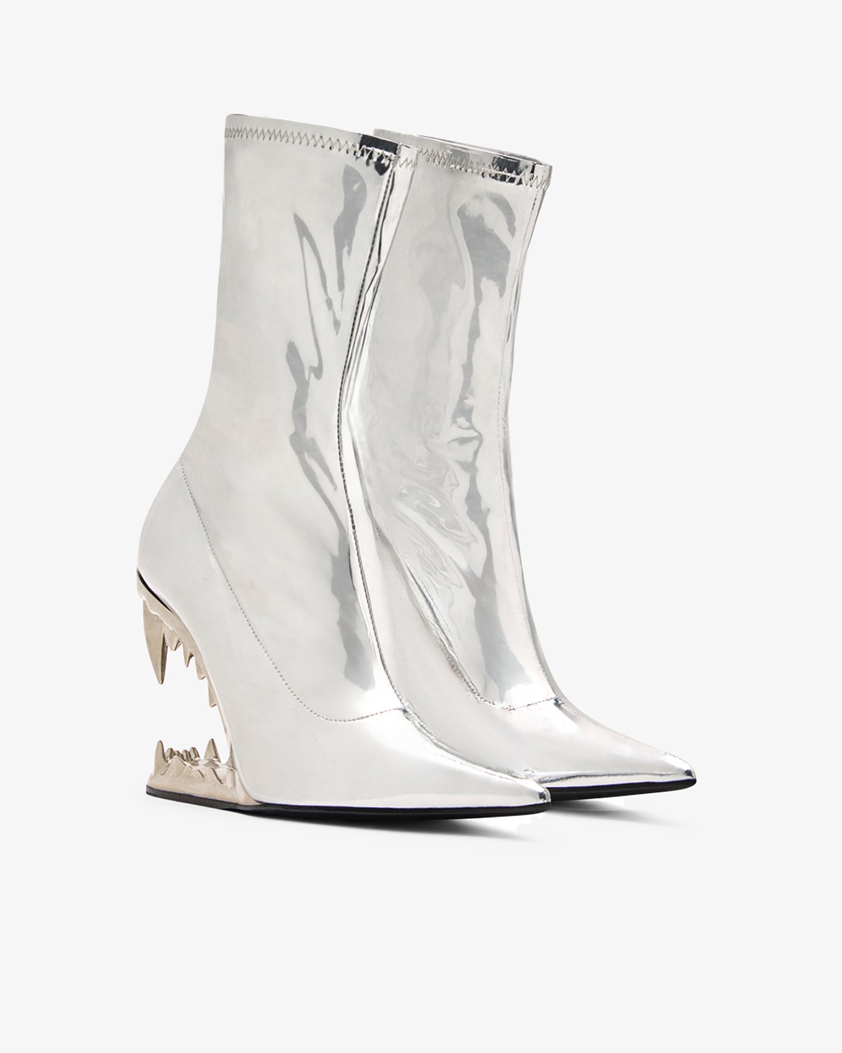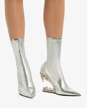 Stretch vinyl ankle boots in striking silver featuring the iconic "Morso" silver heel with a mirrored finish. The boots are completed with a leather sole and a form-fitting upper.