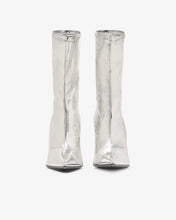 Skip to contentStretch vinyl ankle boots in striking silver featuring the iconic "Morso" silver heel with a mirrored finish. The boots are completed with a leather sole and a form-fitting upper.
