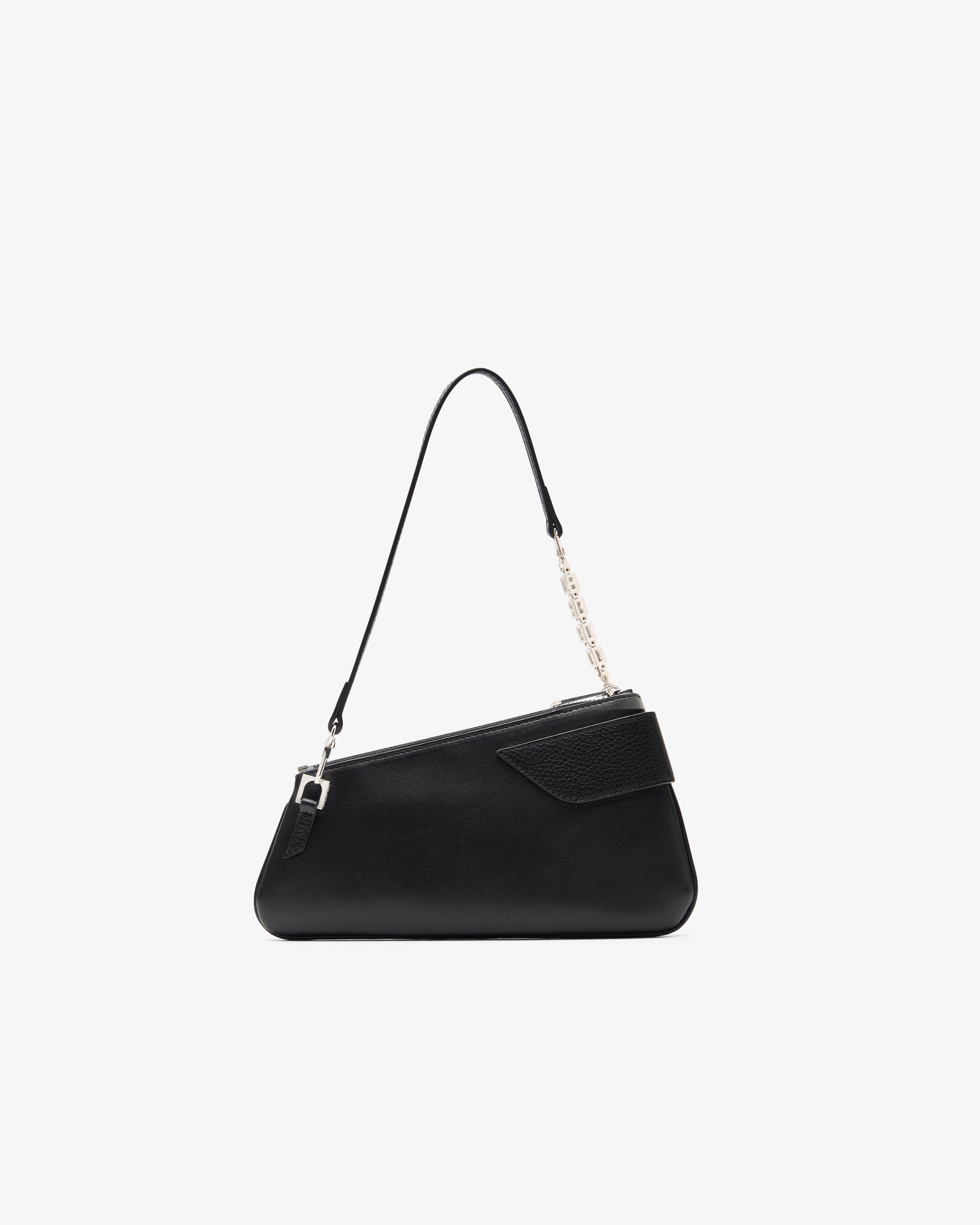 Comma Notte bag, small size, made of black leather. Asymmetric silhouette enhanced by piping and leather with black metallic details. Removable thin calfskin leather handle with metalized "GCDS Cube" chain module. Internally, black jacquard logo lining and asymmetrical card pocket.