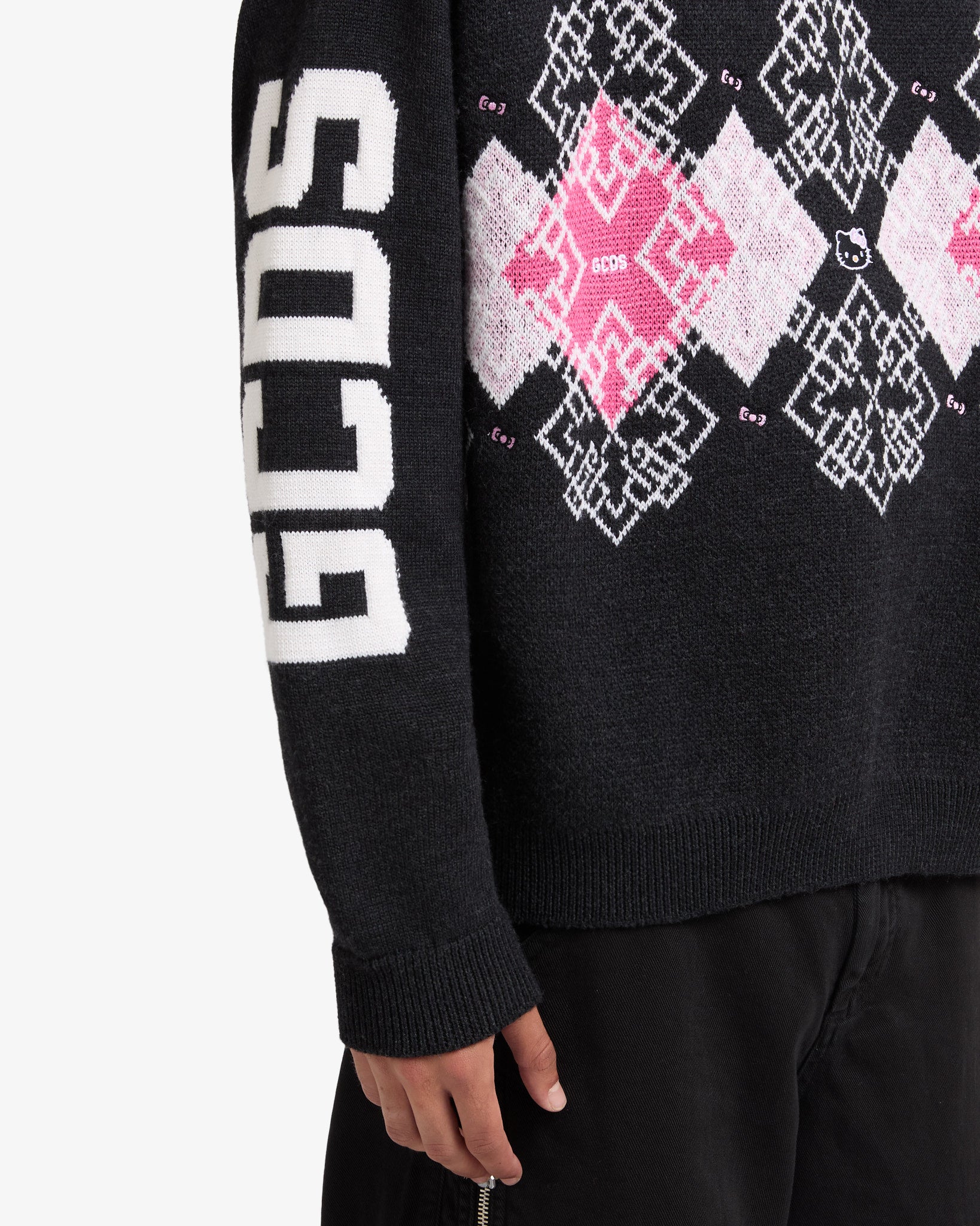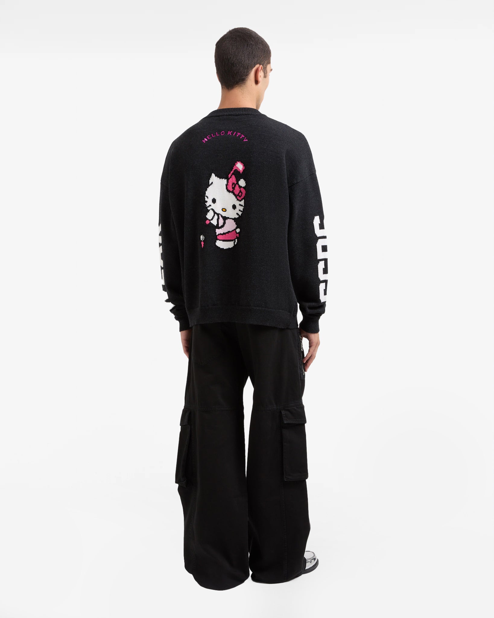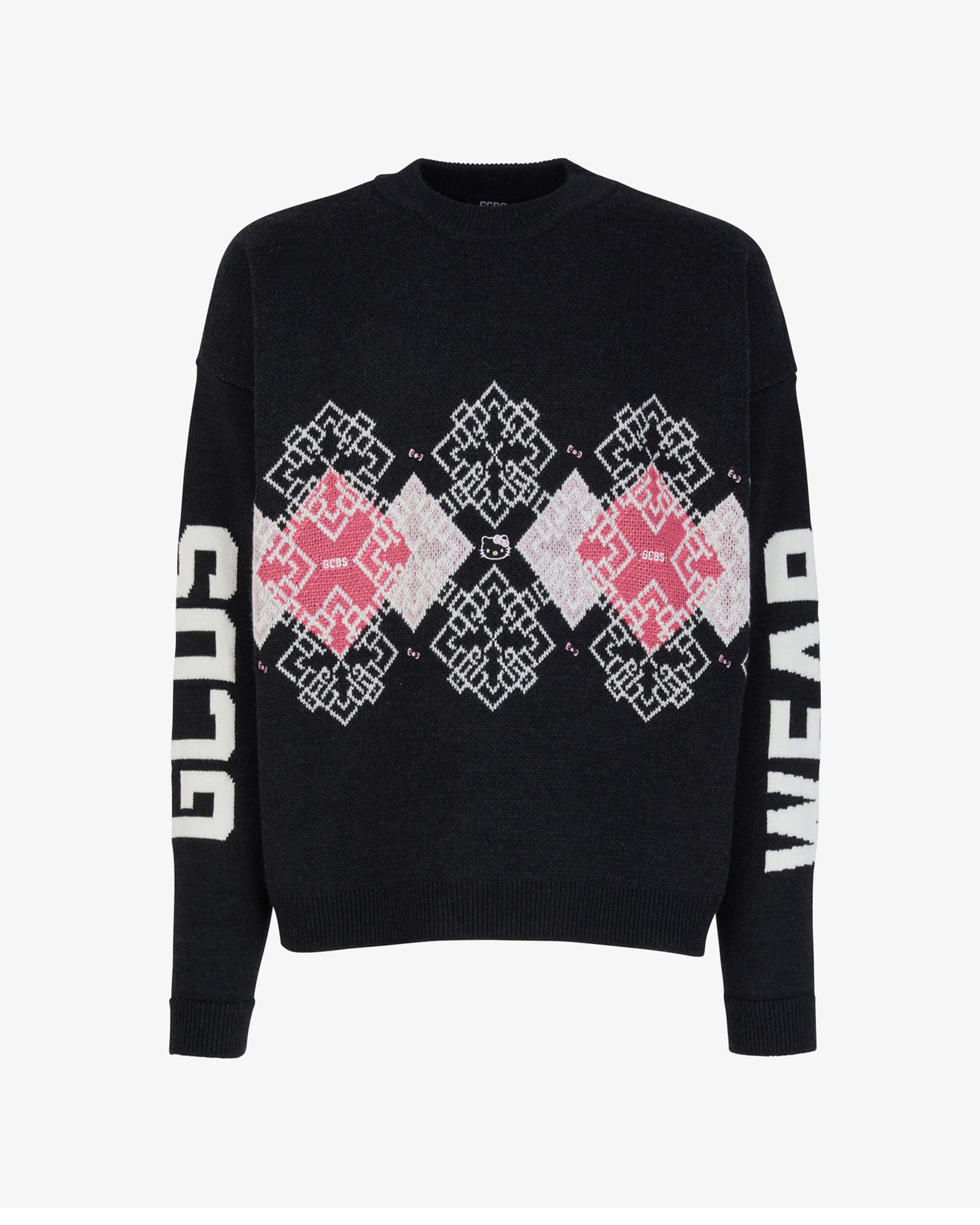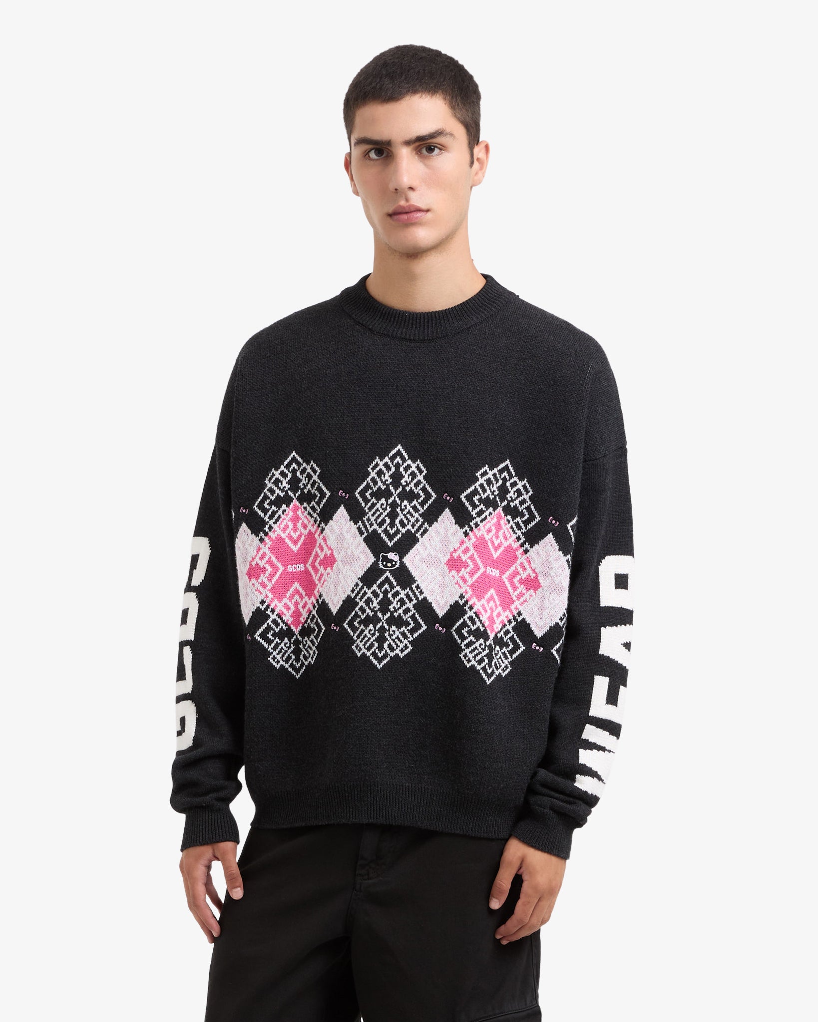 Skip to contentWool blend sweater featuring jacquard graphics and embroidered Hello Kitty designs. This loose-fit piece is adorned with an intarsia GCDS logo on the sleeves.