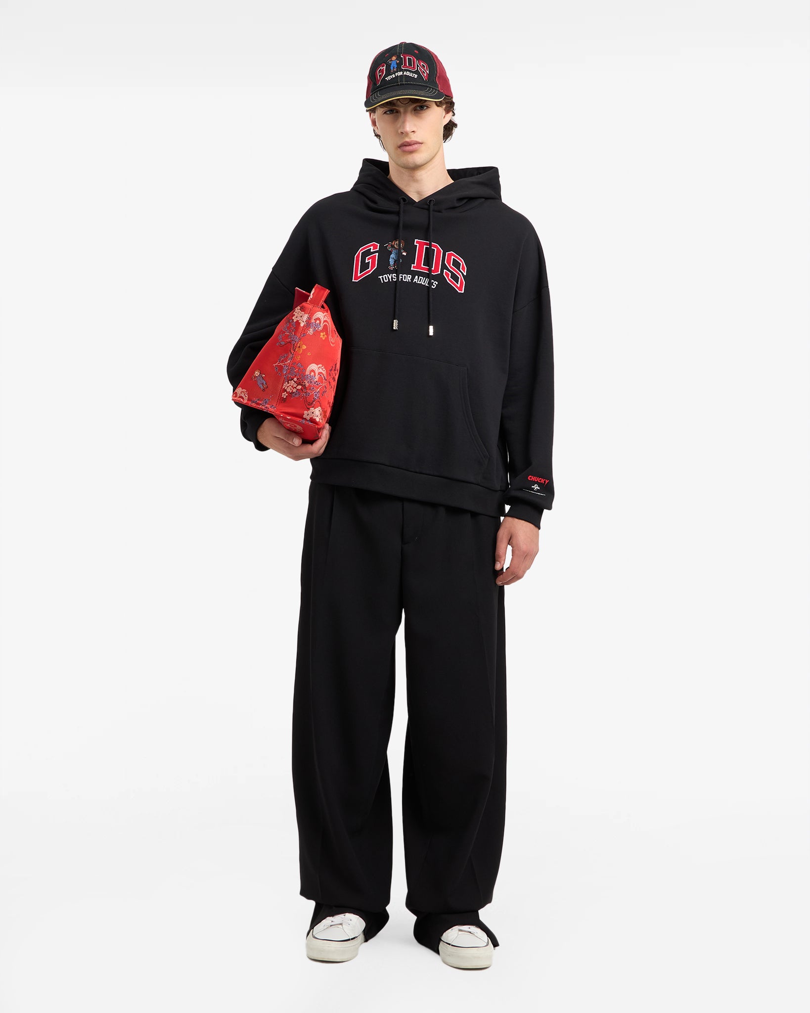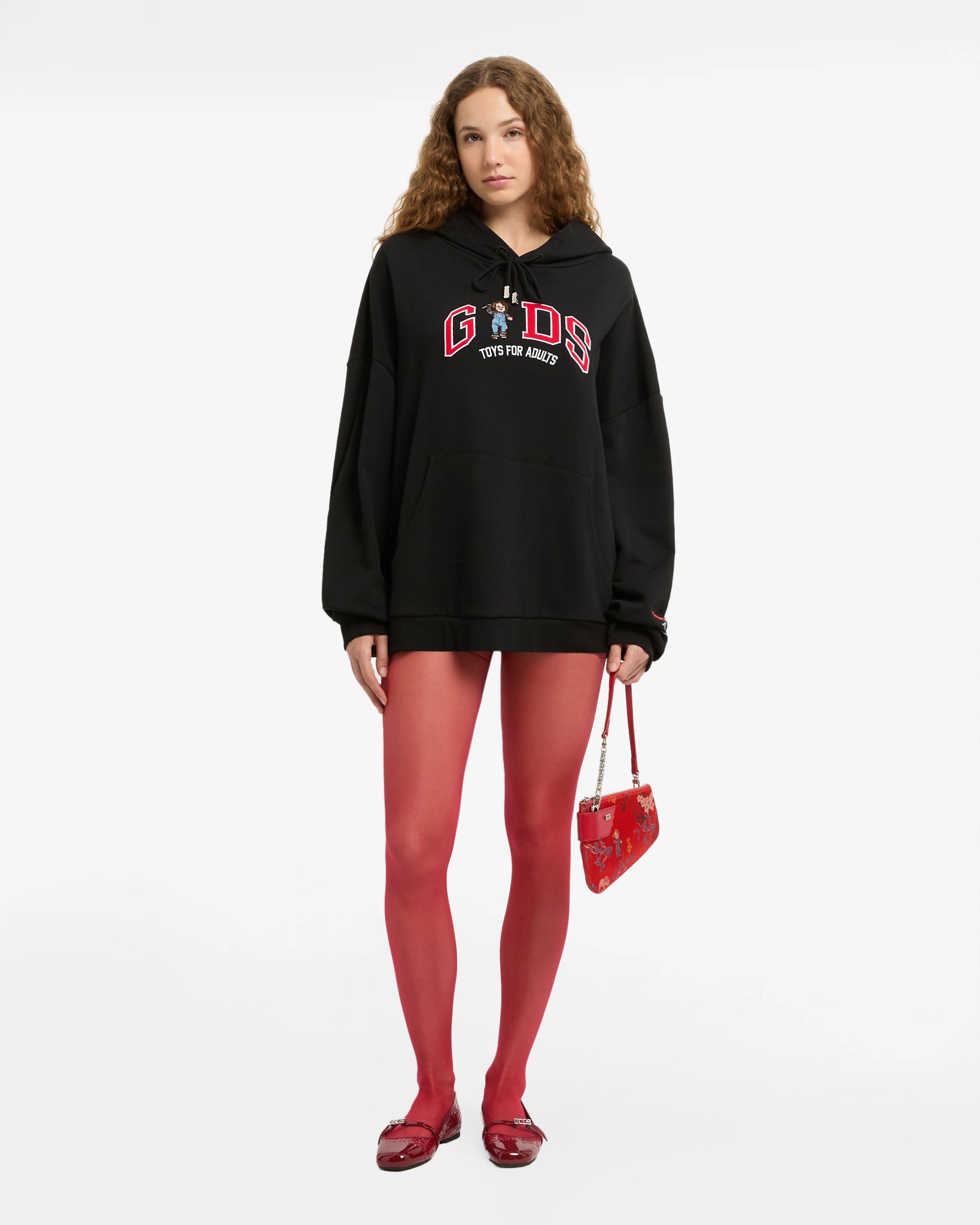 Oversized sweatshirt made of cotton jersey. Adjustable hood with logoed laces and finecord. Long sleeves with cuffs and pouch pocket. Sweatshirt features contrasting "GCDS Lounge Chucky" logo reapplied on the front.