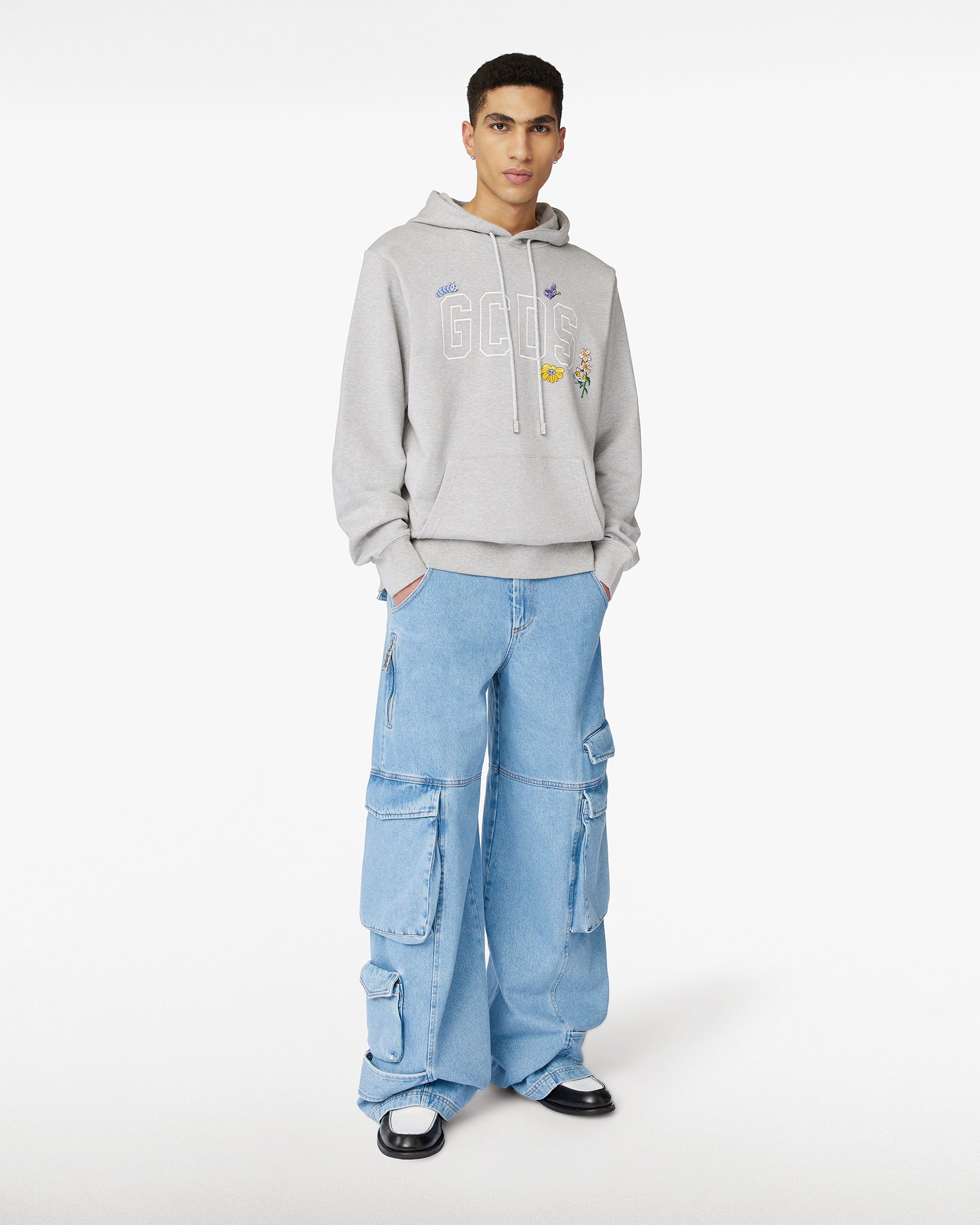 Ultracargo stonewashed denim trousers with light bleached effect and tobacco-colored contrast stitching. Side cargo pockets and logoed back patch. Adjustable bottom with side buckles. Front zipper and stud button closure.