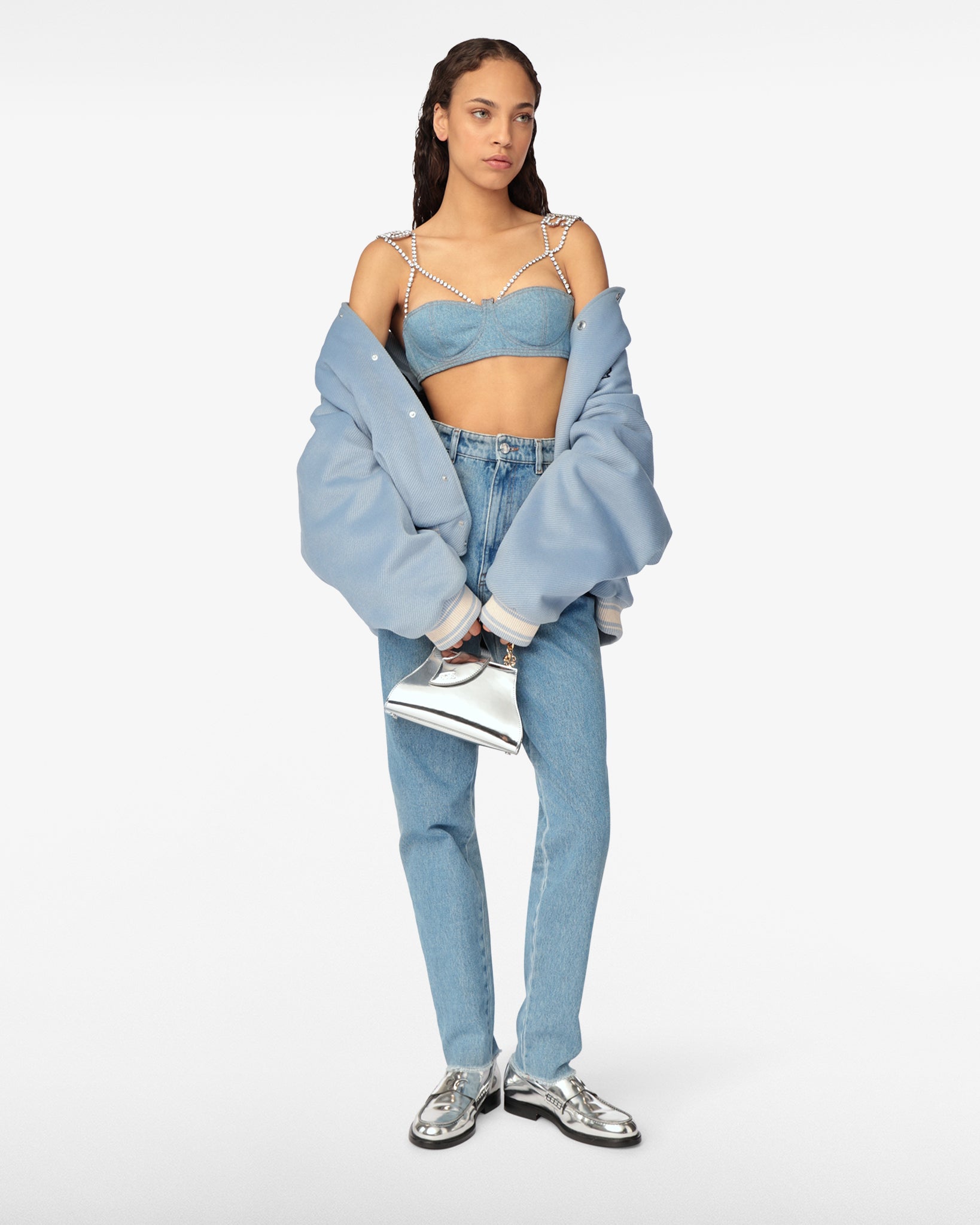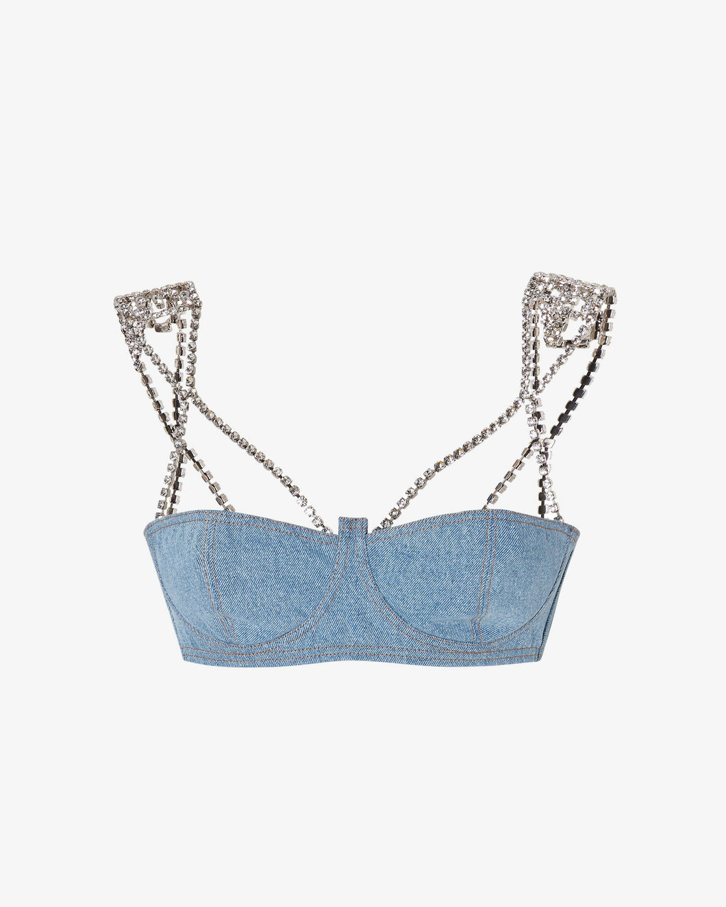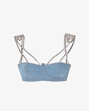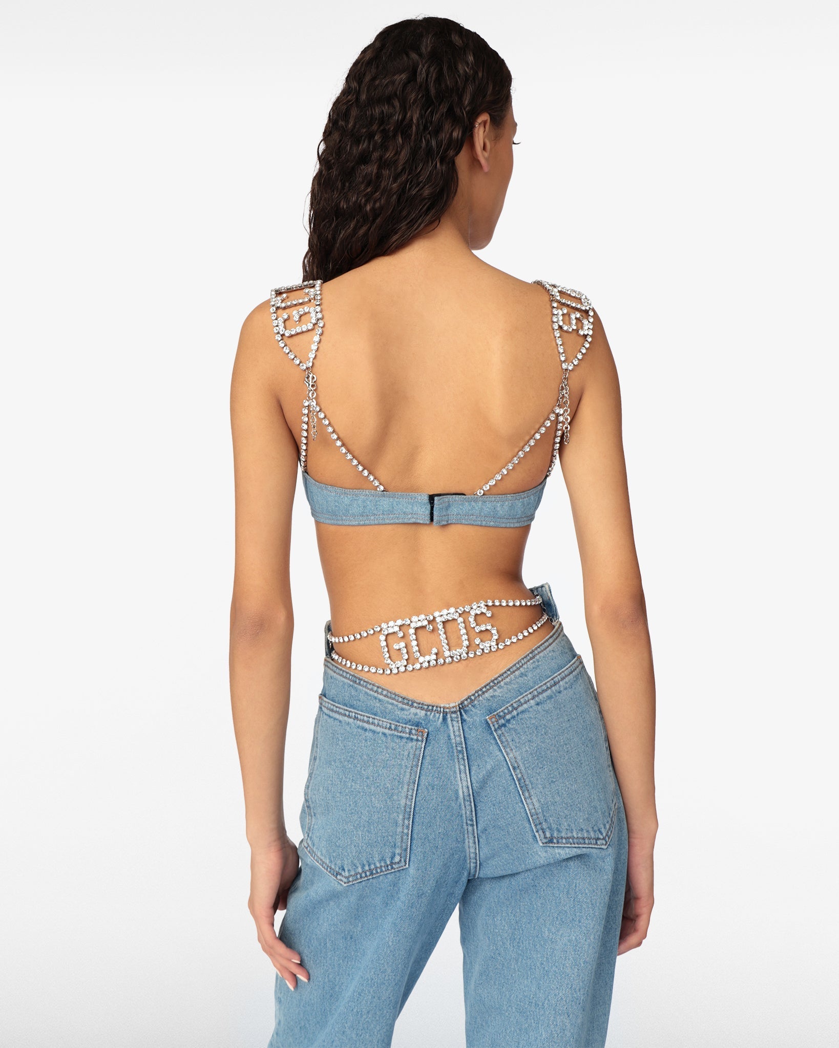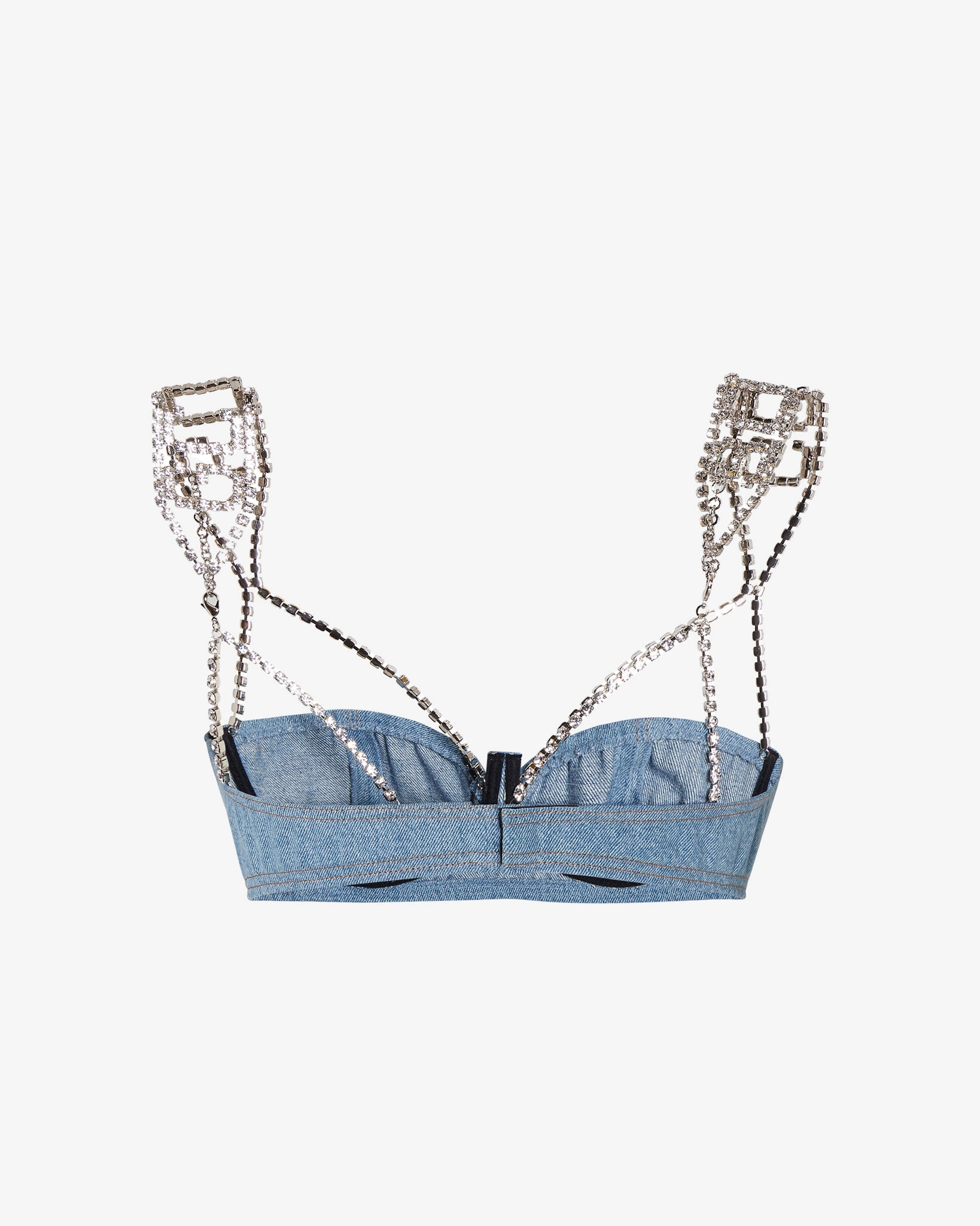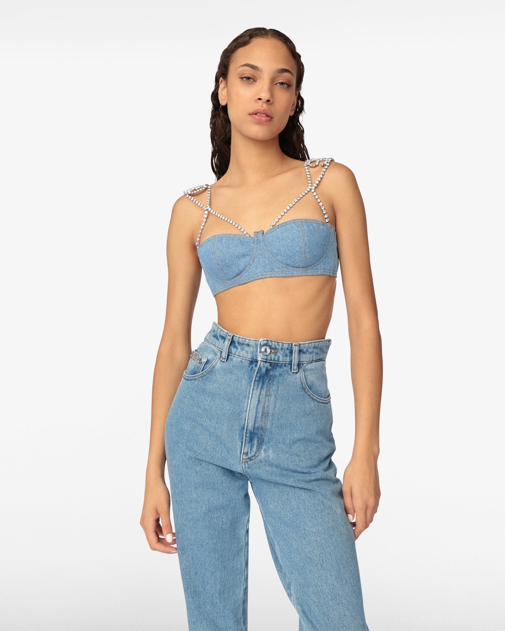Denim mini top with balconette cups in light blue stonewashed denim. The distinctive detail is provided by the jewel straps with crystal logo.