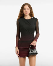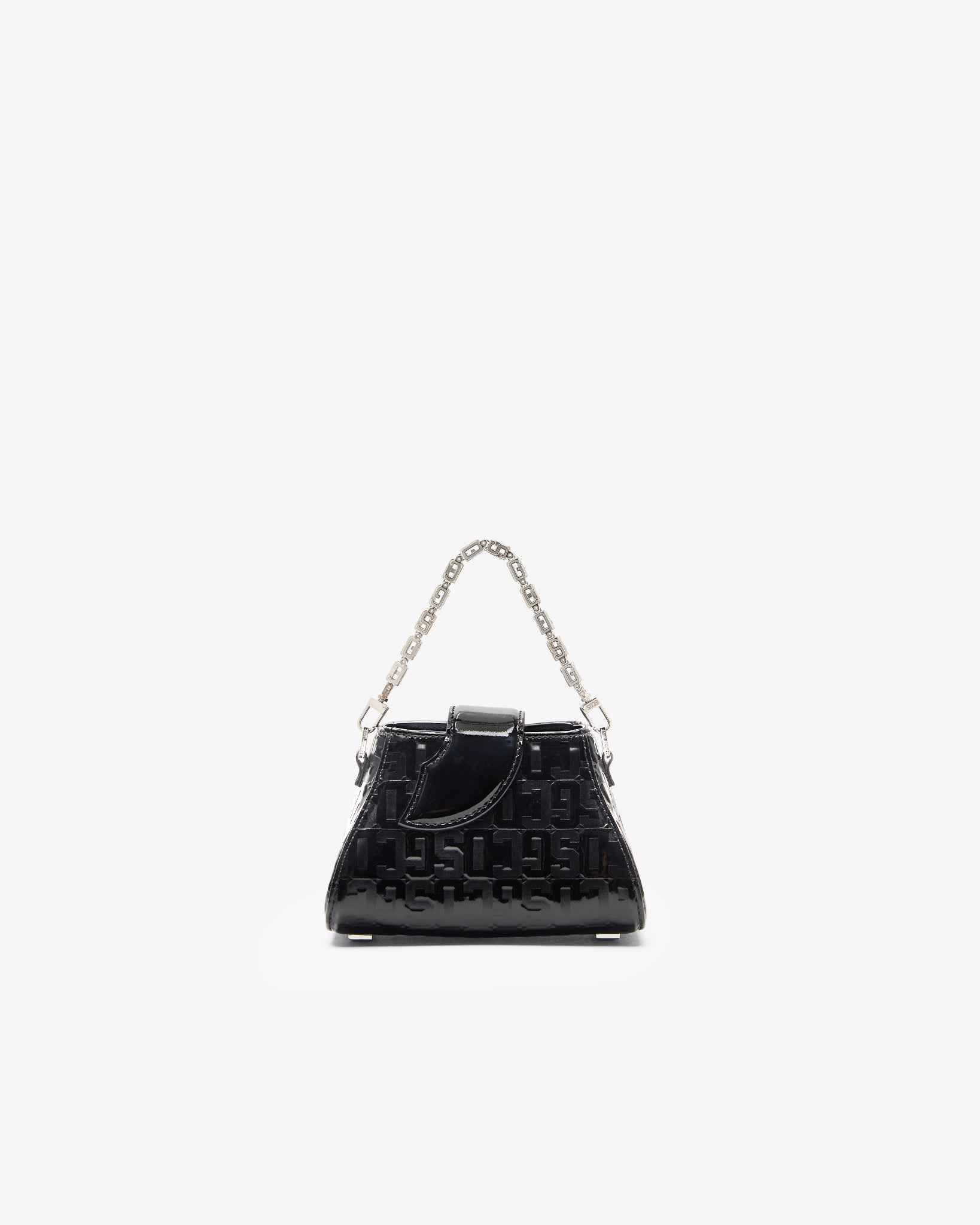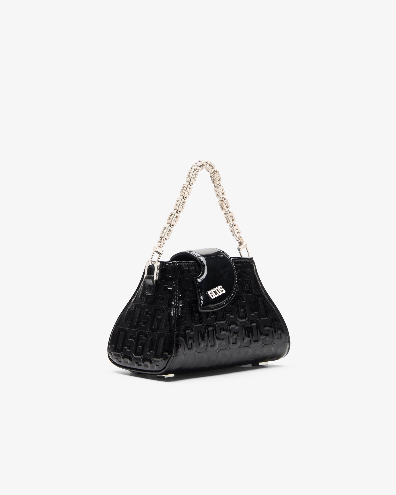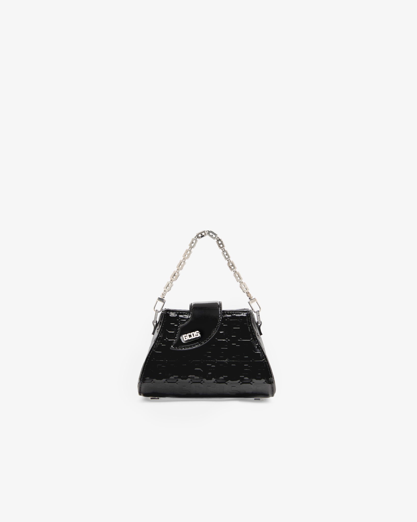 Comma bag, mini version, made of black patent leather, and the carryovers are black smooth patent leather with embossed GCDS Monogram pattern and featuring an asymmetrical curved flap with metallic GCDS logo. Handle with metallic "GCDS Cube" chain module. Inside, black jacquard lining. Bottom with 4 polished nickel feet.