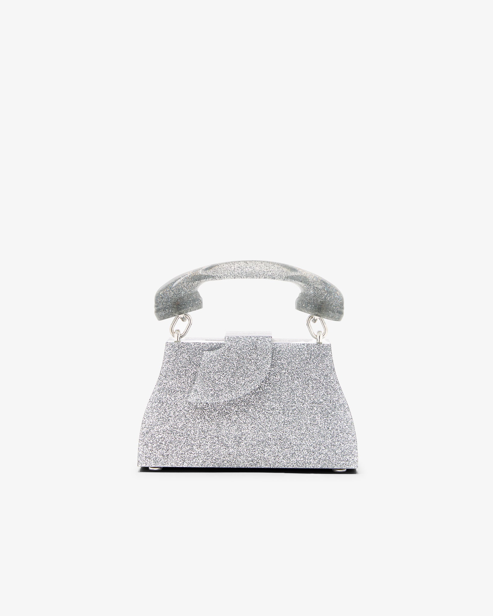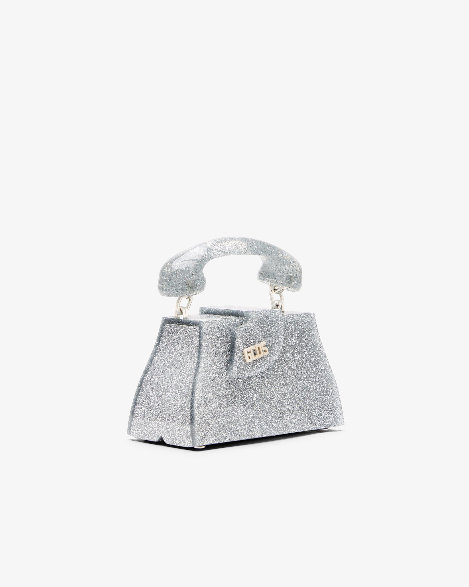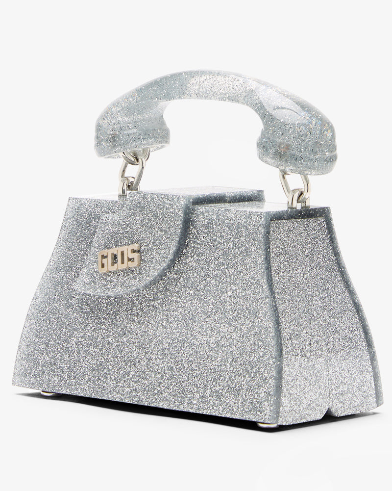 Call-Me Comma bag, small size, made of silver glitter acrylic with distinctive flared shape. Magnetic snap closure. Featuring asymmetrical curved flap made of acetate that simulates the iconic leather bag opening and contrasting GCDS logo. The distinctive feature of the bag is the tone-on-tone cornet-shaped handle.