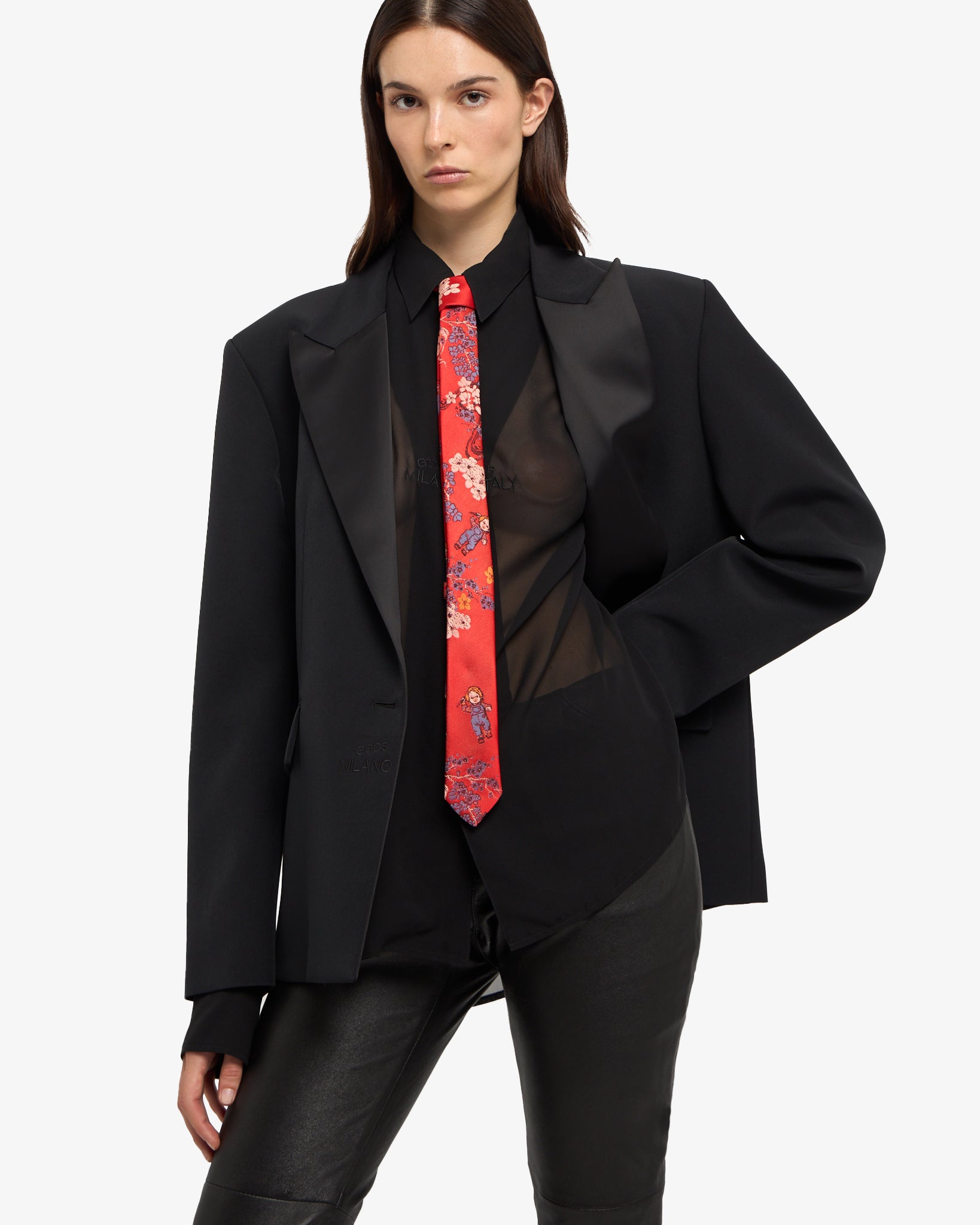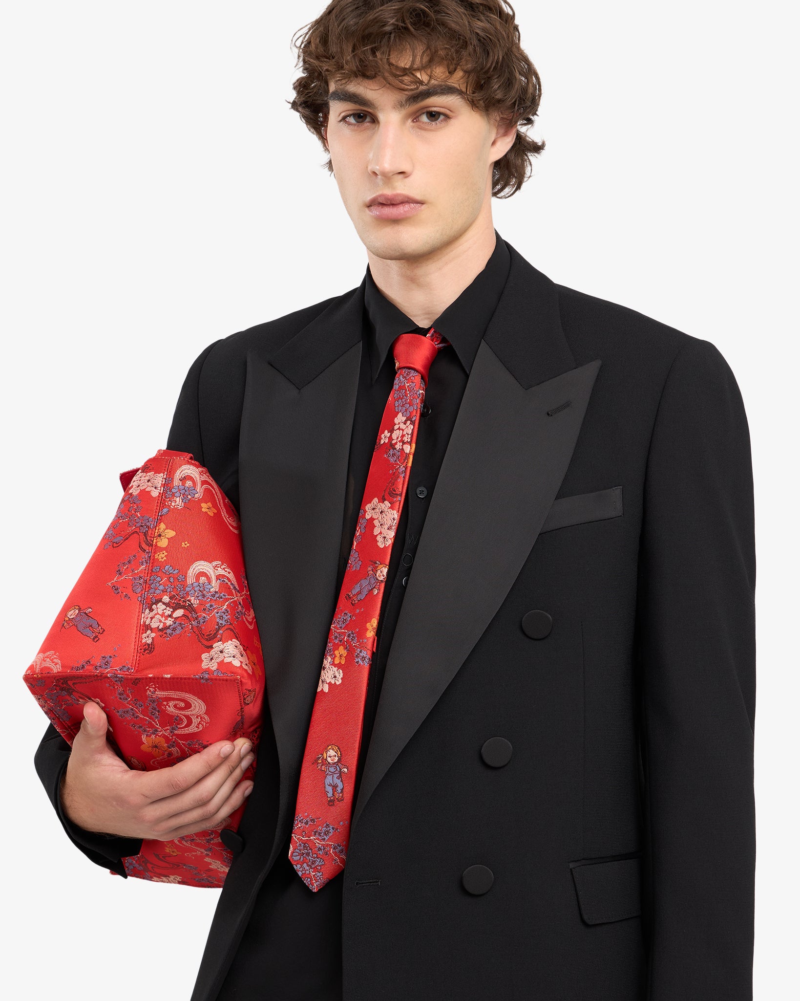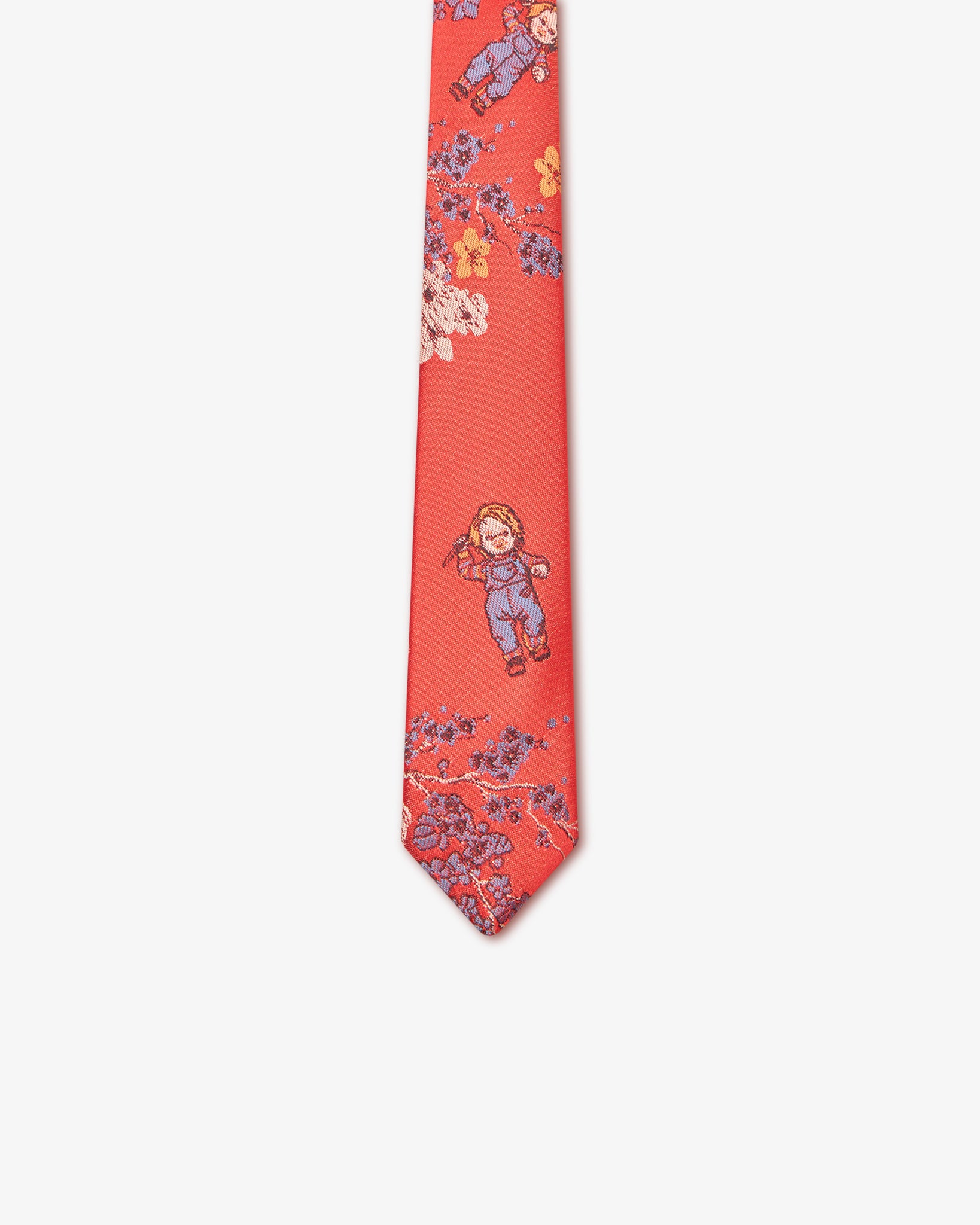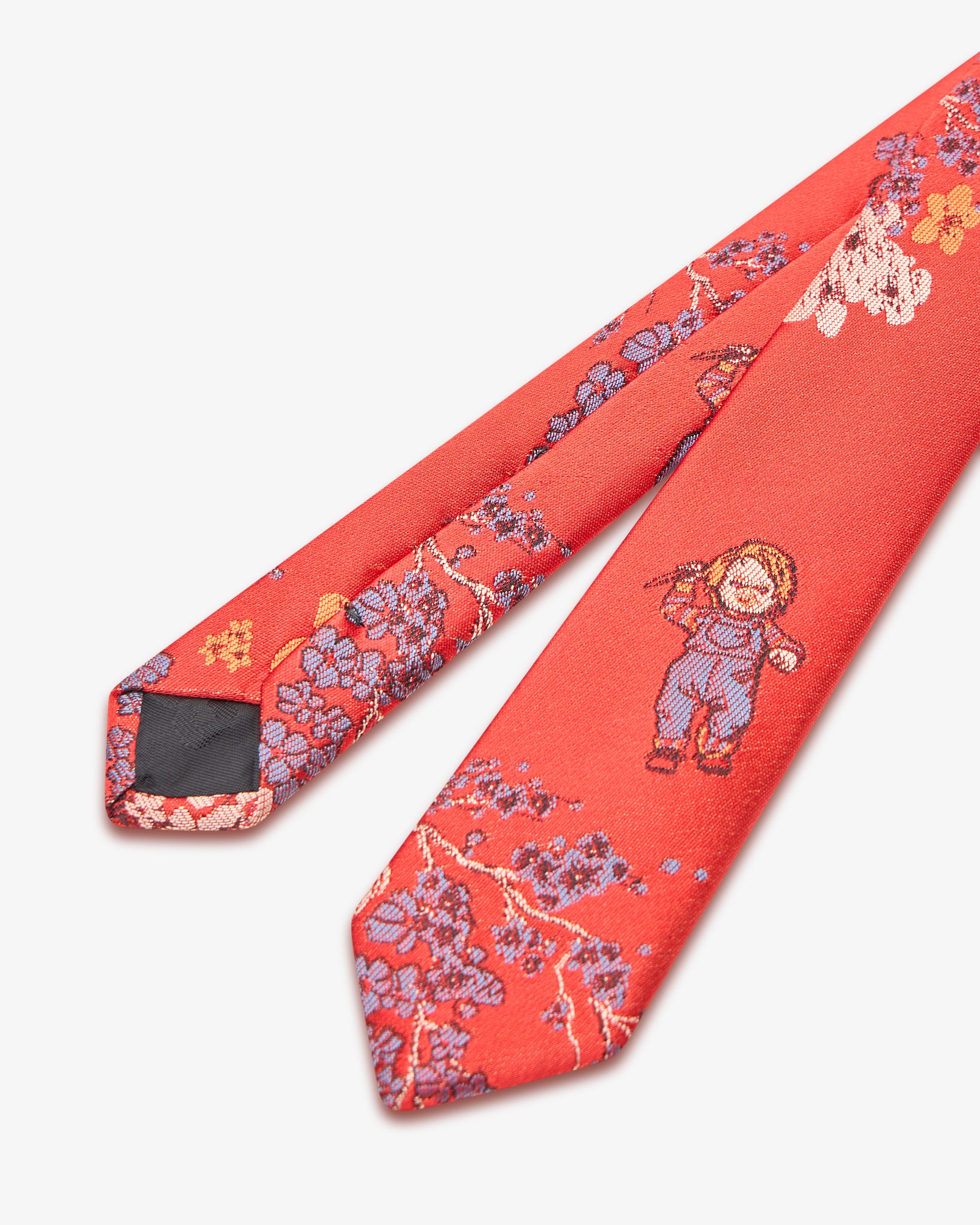 Jacquard fabric tie with floral pattern depicting Chucky.