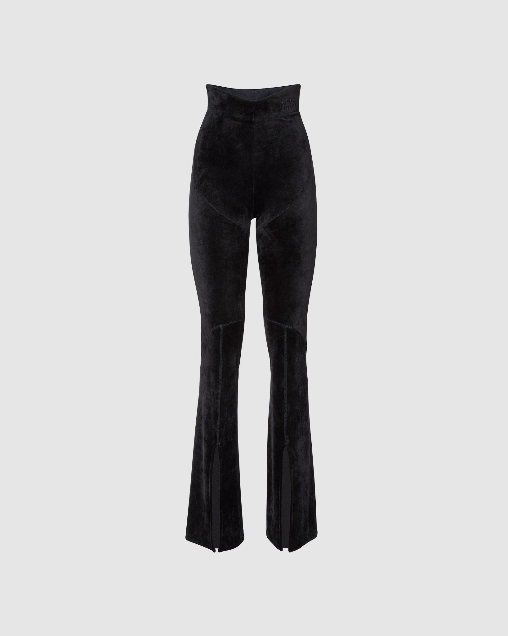 High-waisted black stretch velvet leggings with a waistband on the front and back and coverlock details. Two rubber logo buttons with a golden finish on the center back. Matching GCDS logo embroidery on the waistband. Deep cut at the bottom of the front leg.