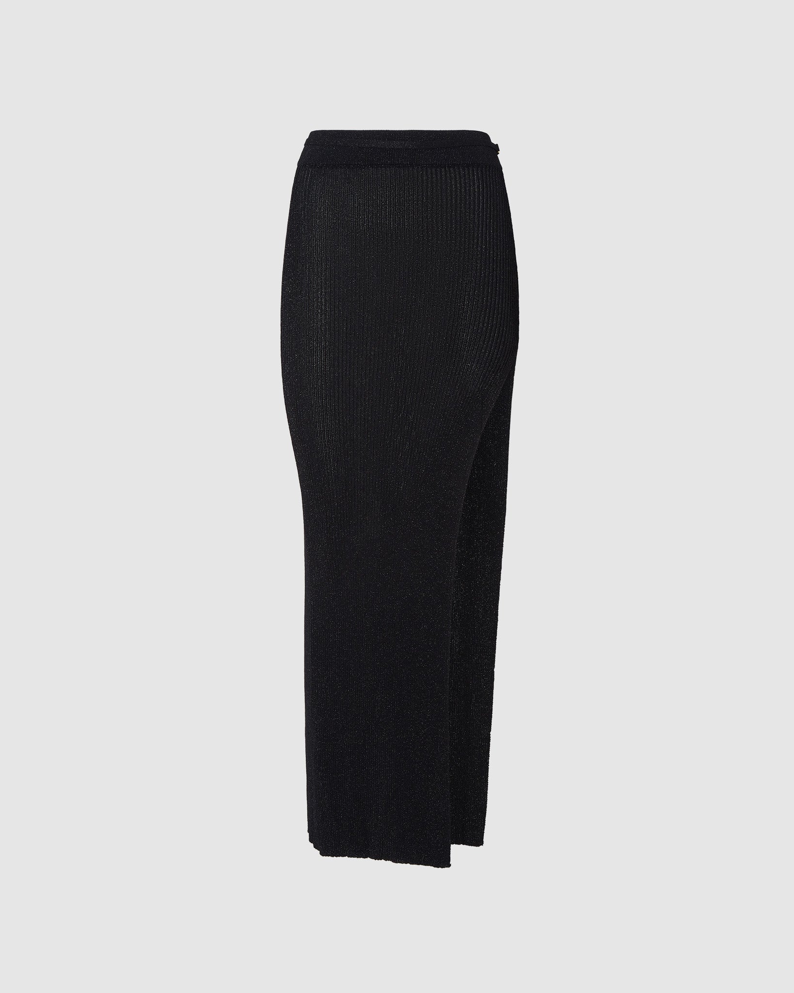 Midi ribbed skirt in single-tone lurex. Deep slit on the left. Knitted band with golden GCDS logo clip around the waist.