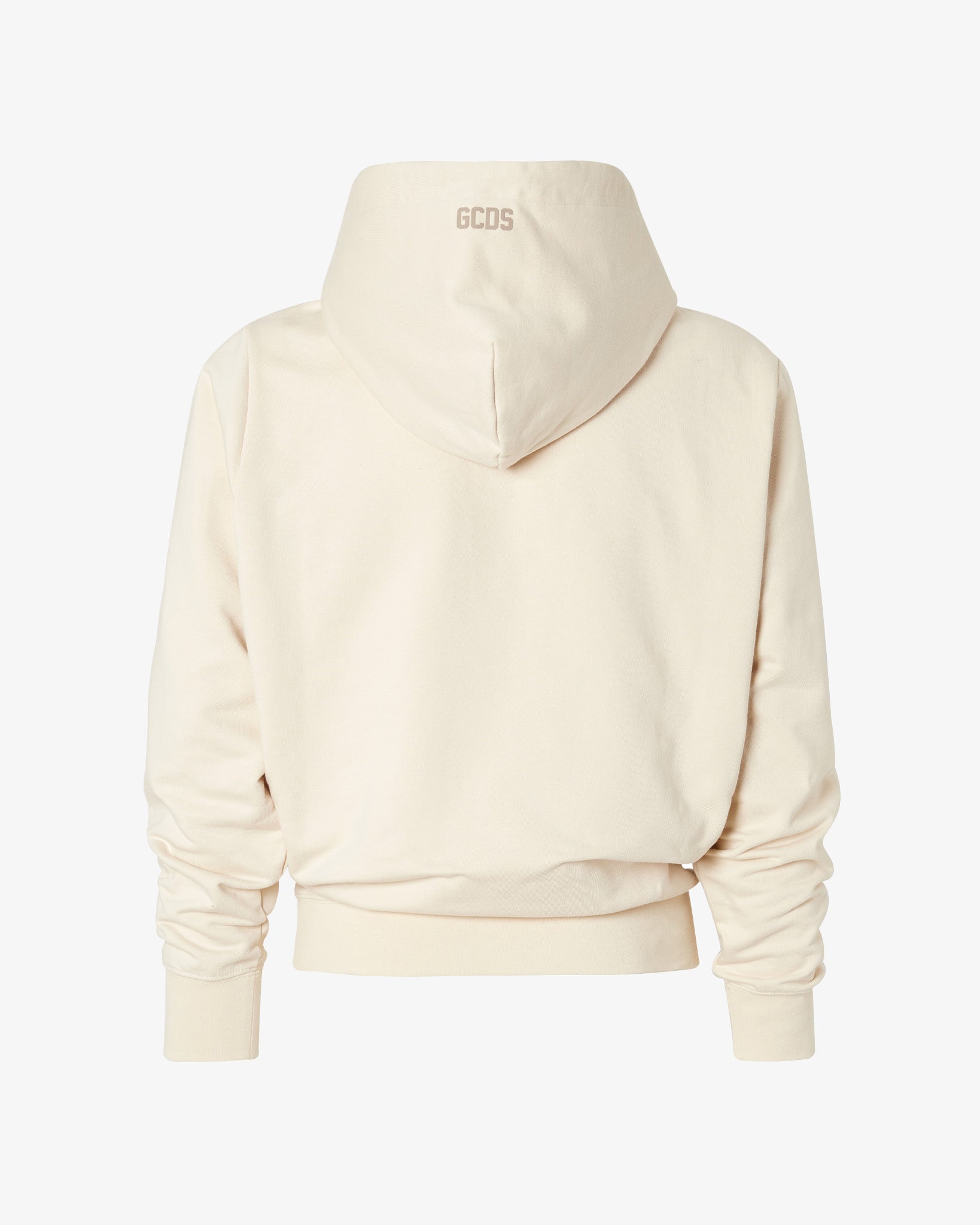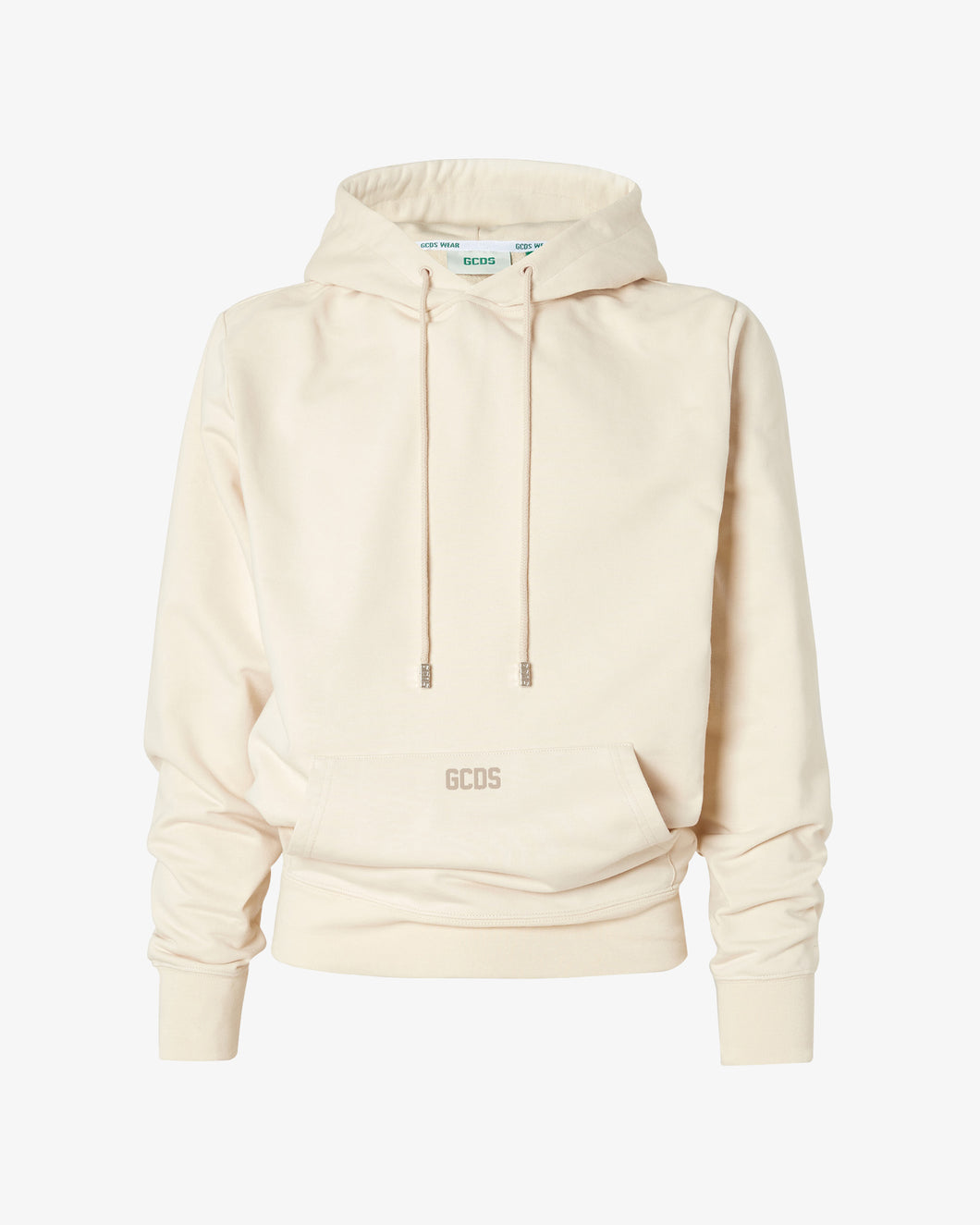 Organic cotton long-sleeved oversized sweatshirt with adjustable hood and logoed cord aglets. GCDS logo applied on the center of the pouch pocket and at the back, on the center of the hood.