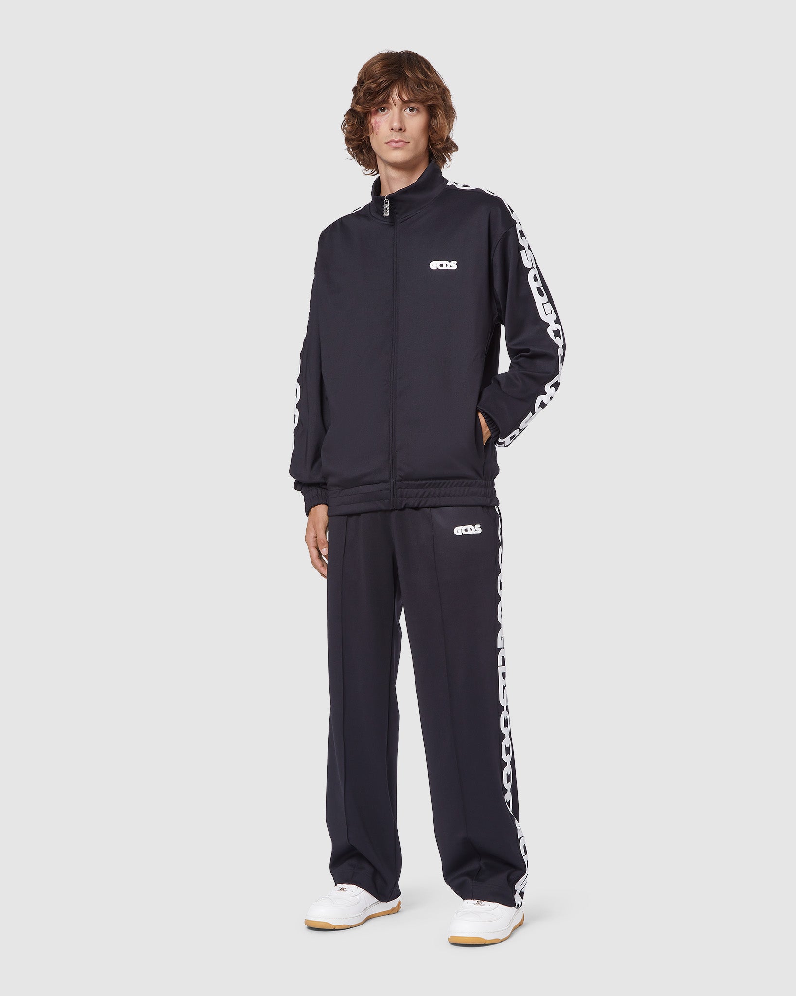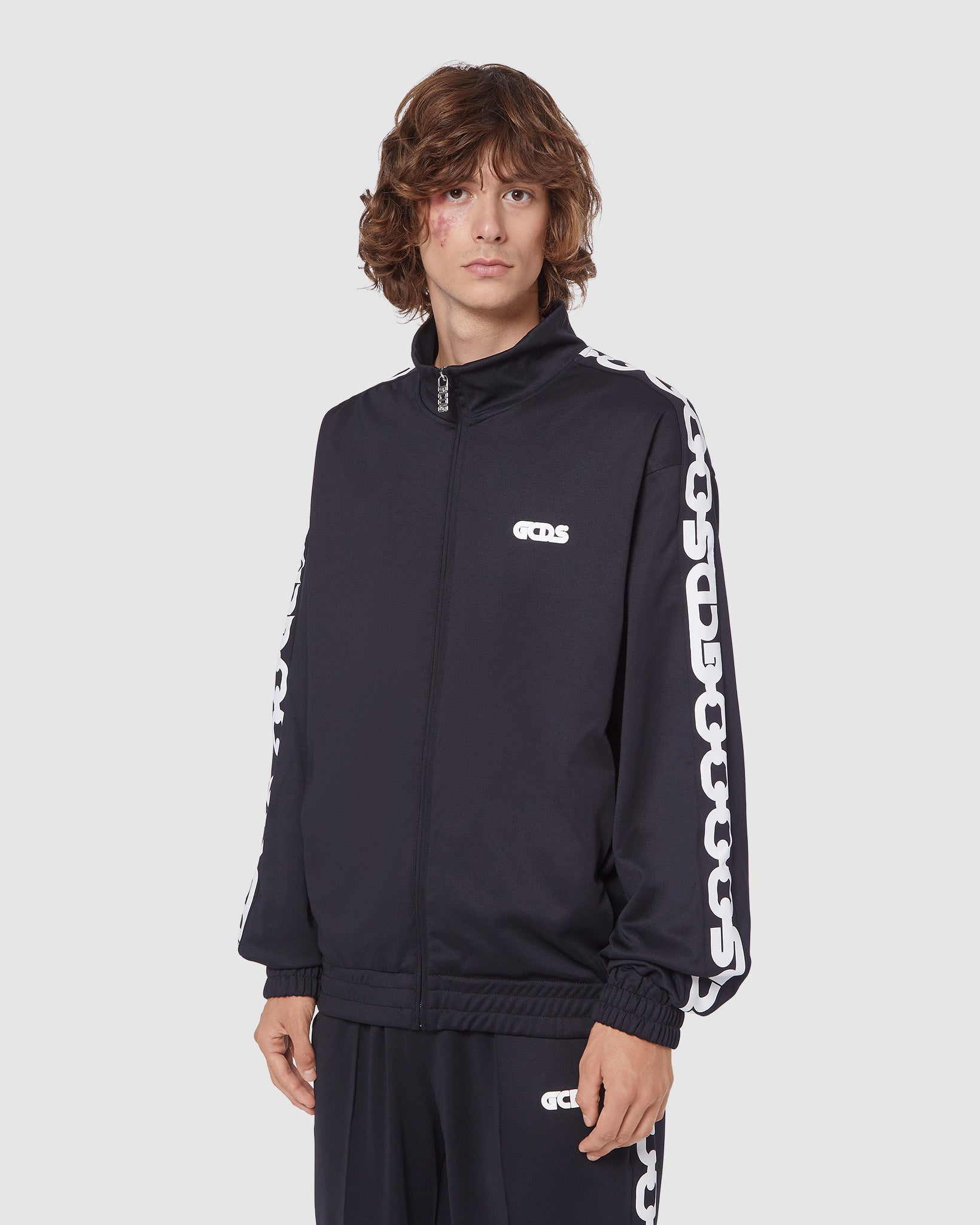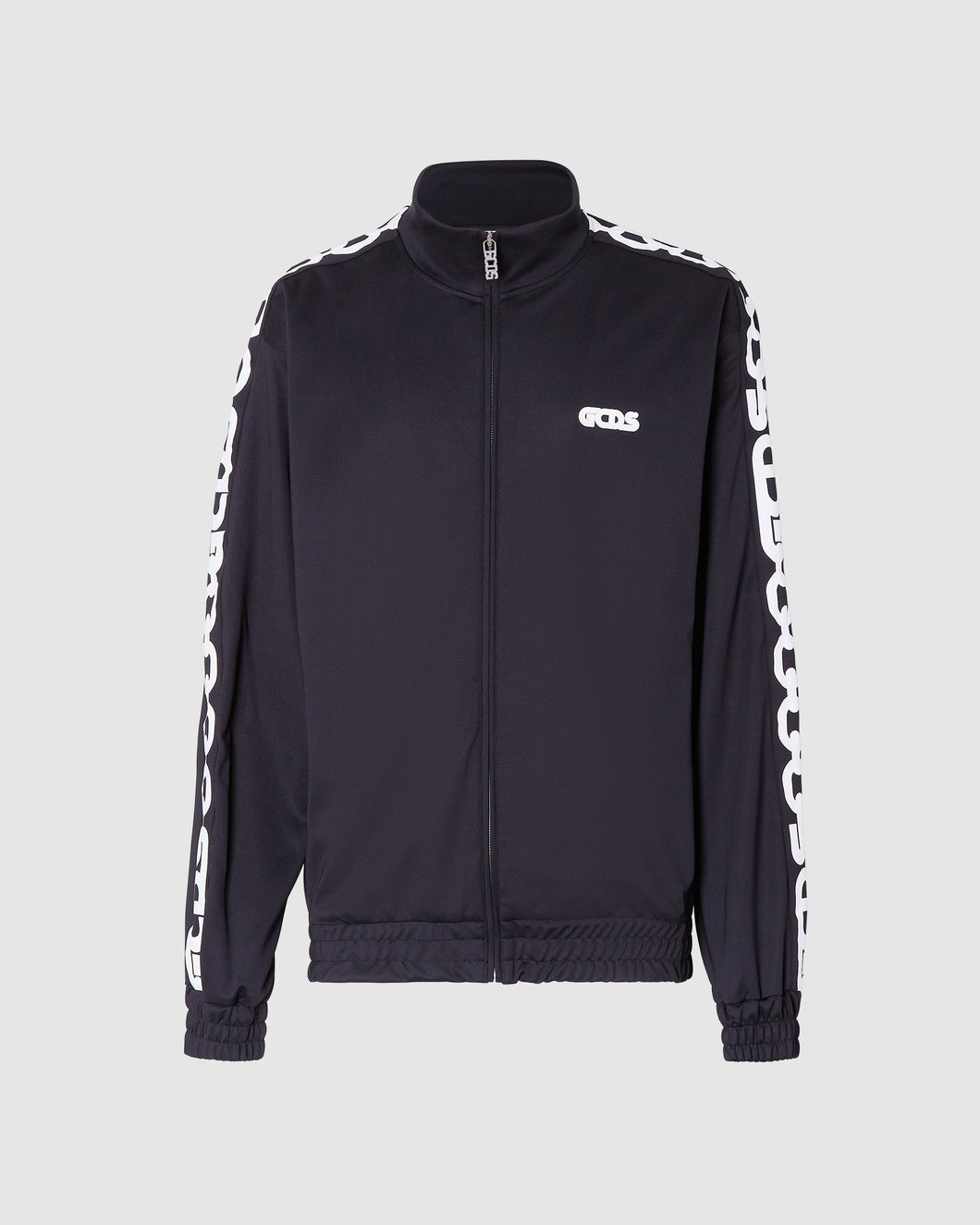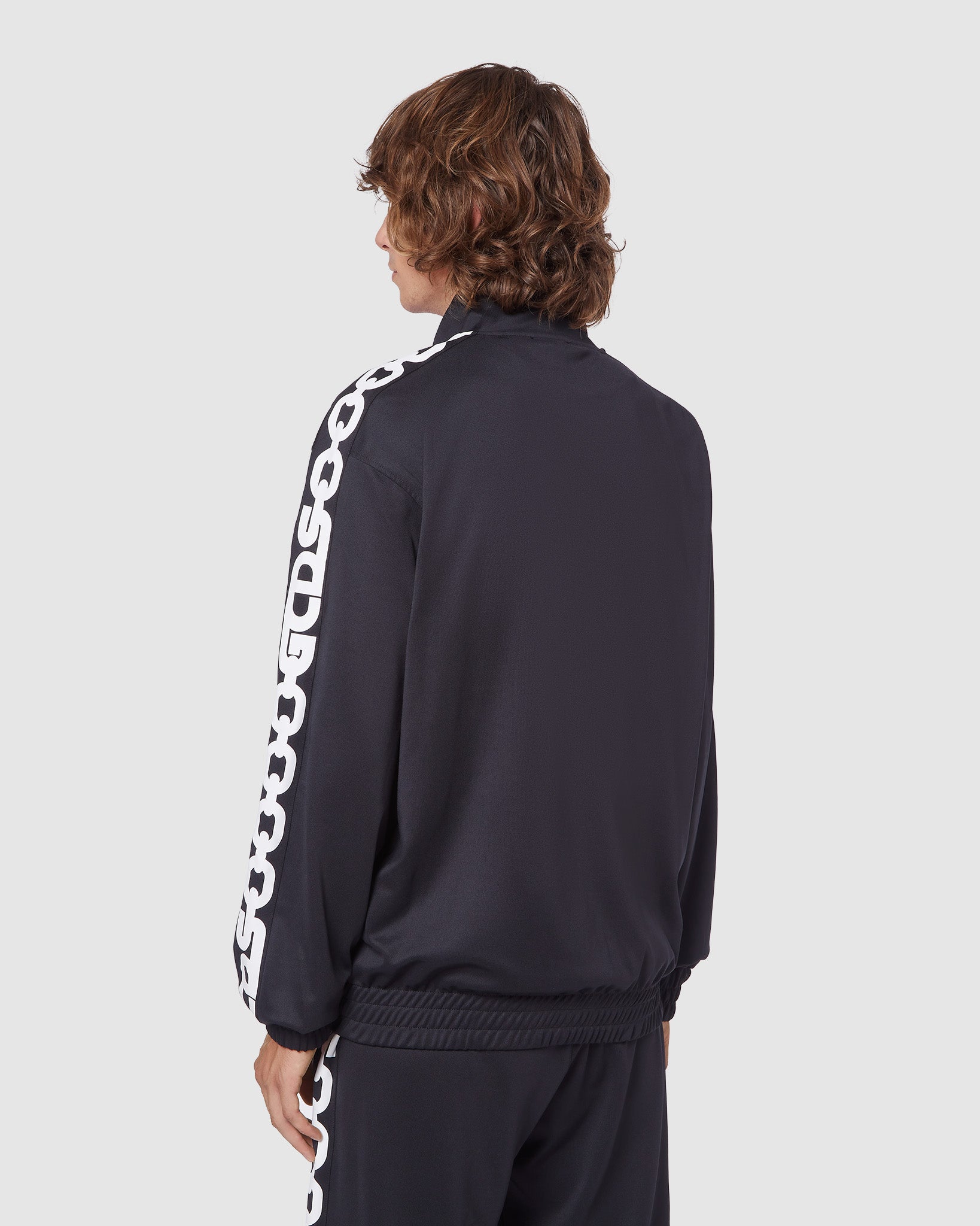 Track top with logo chain pattern band in transfer print on the sleeves. Zipper fastener. Silicone Roundy logo patch on the front pocket. Hidden pockets on the hips. Elastic on the hem and sleeve cuffs.