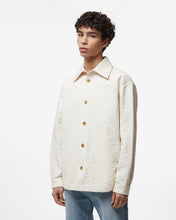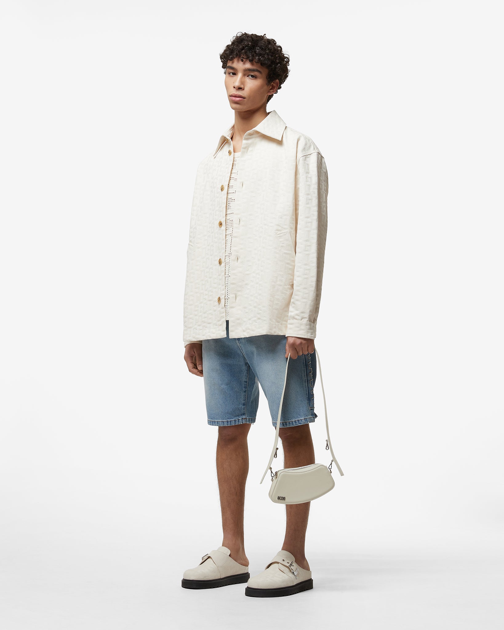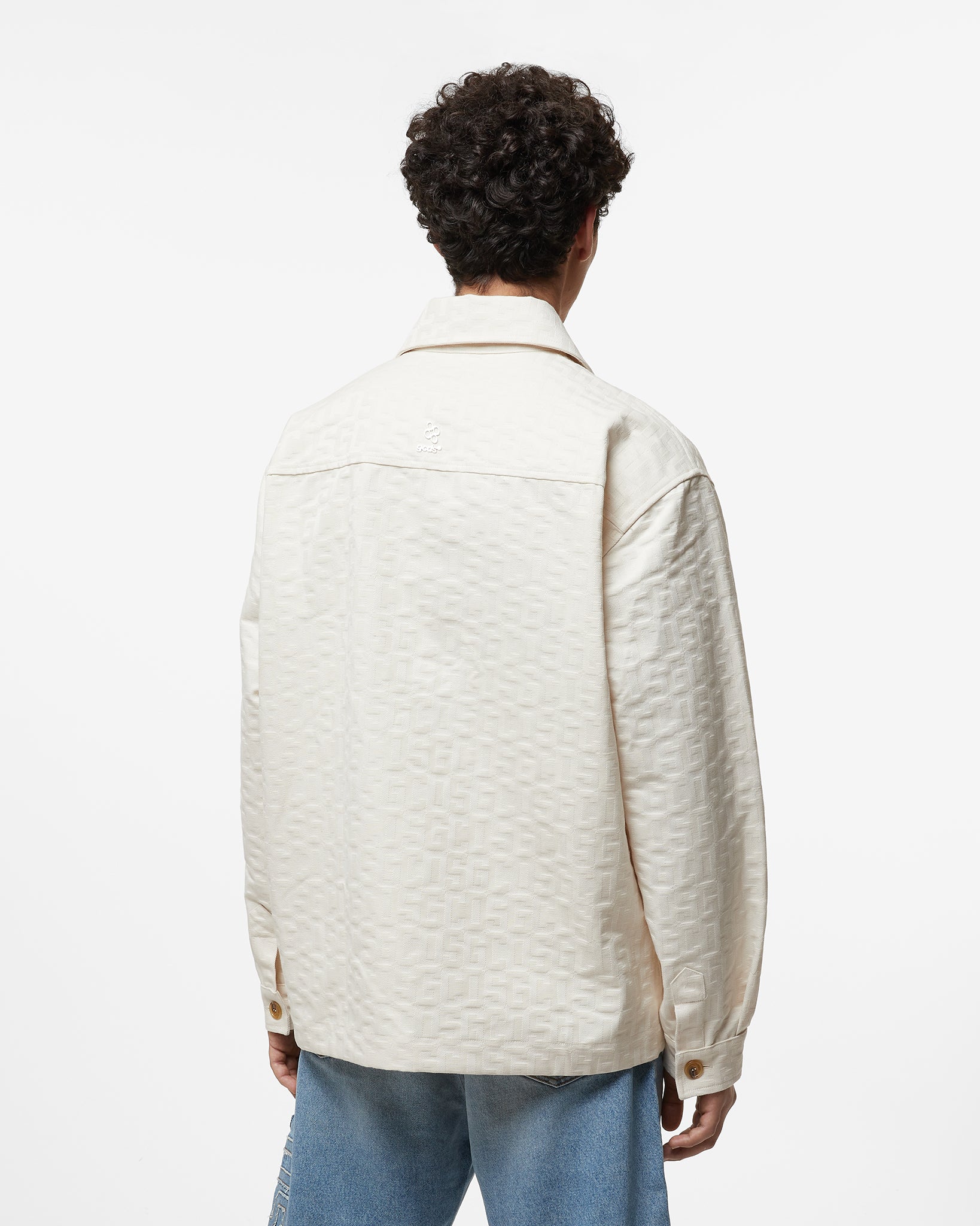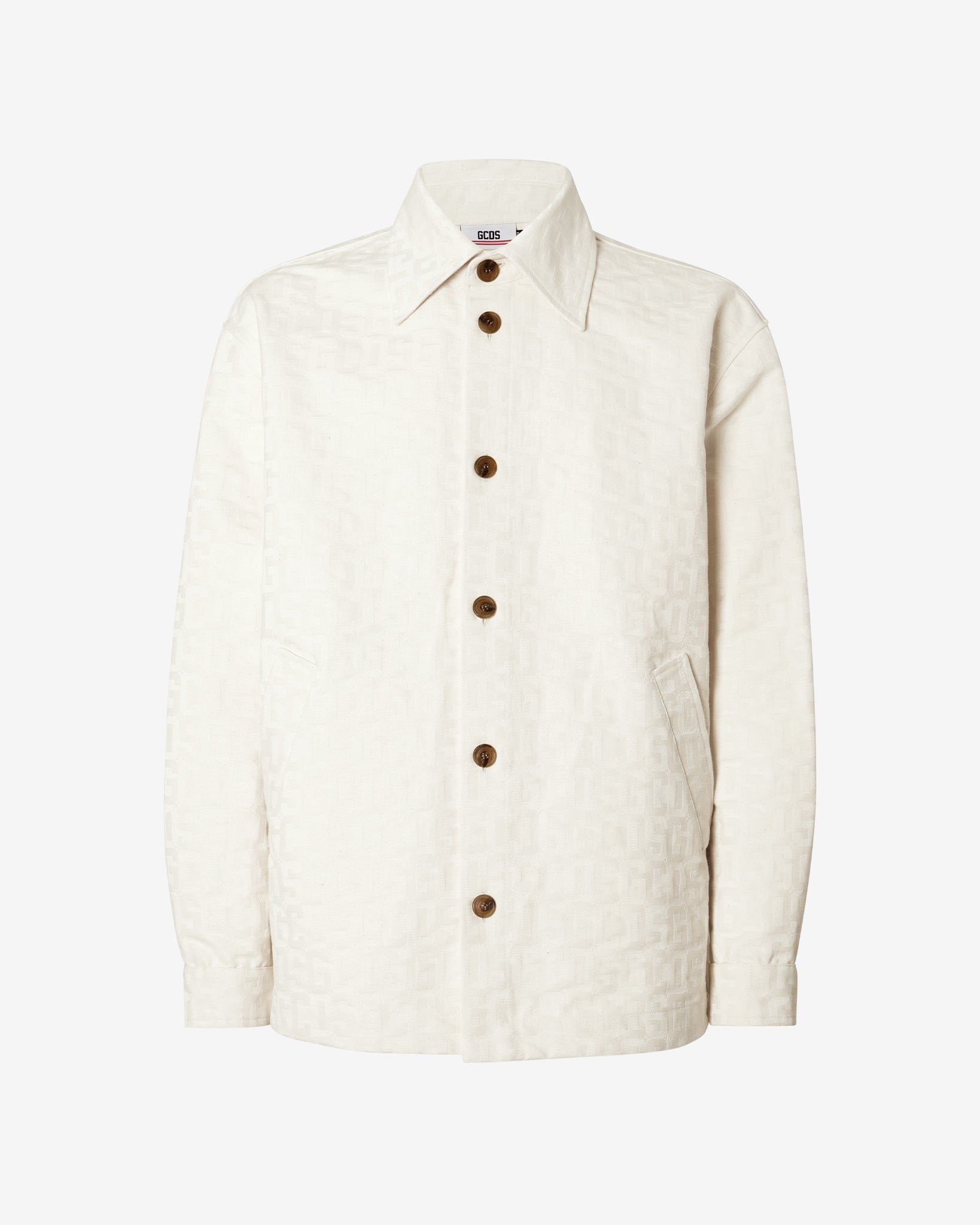 GCDS Jacquard monogram ecru cotton overshirt. Welt pockets. On the back, polished nickel “GCDS Bliss” logo plaque. Loose fit.