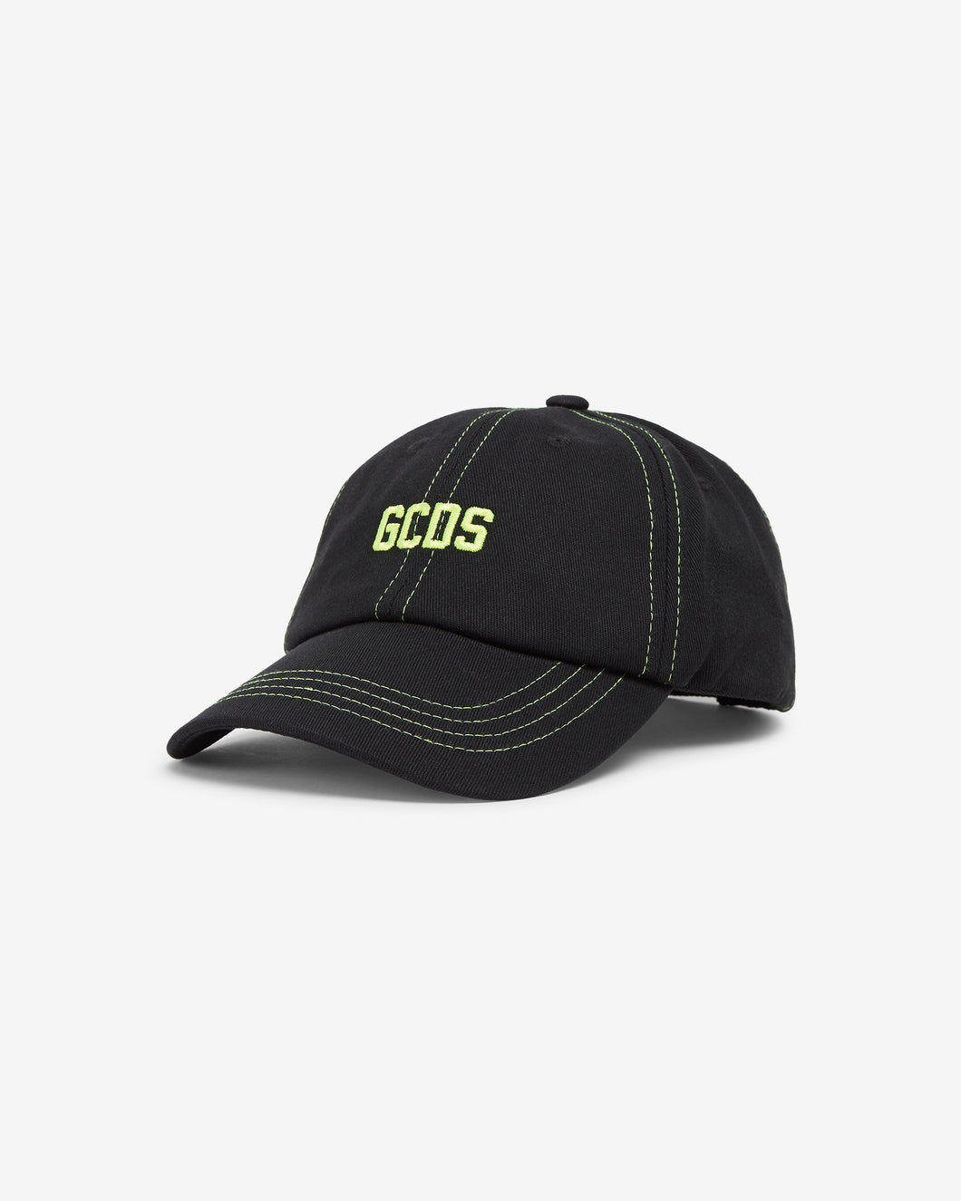 GCDS cotton gabardine baseball cap with logo embroidery on the front. “GCDS Wear Milano” embroidery on the back closure of the cap. Matching lining with grosgrain logo appliqué.