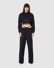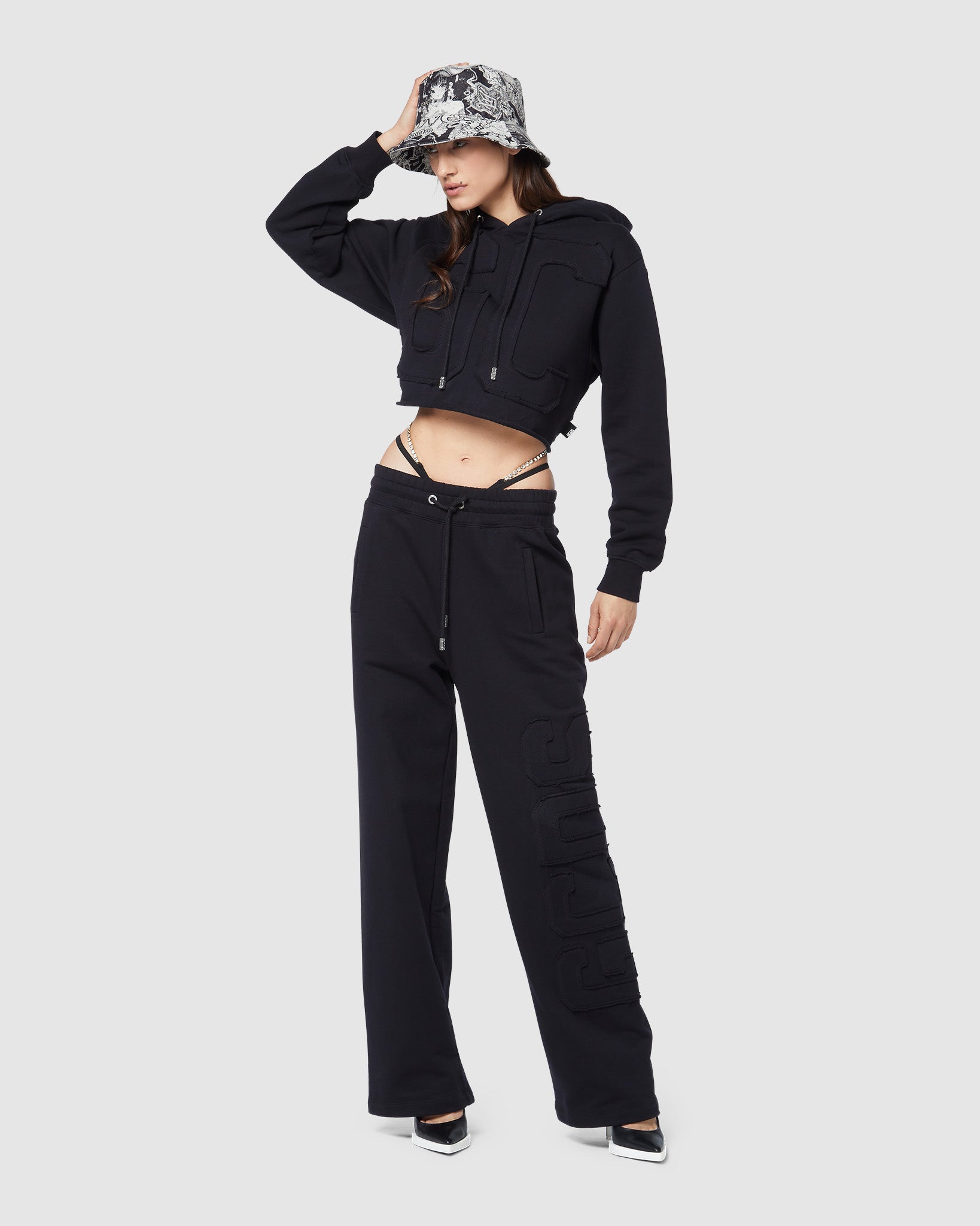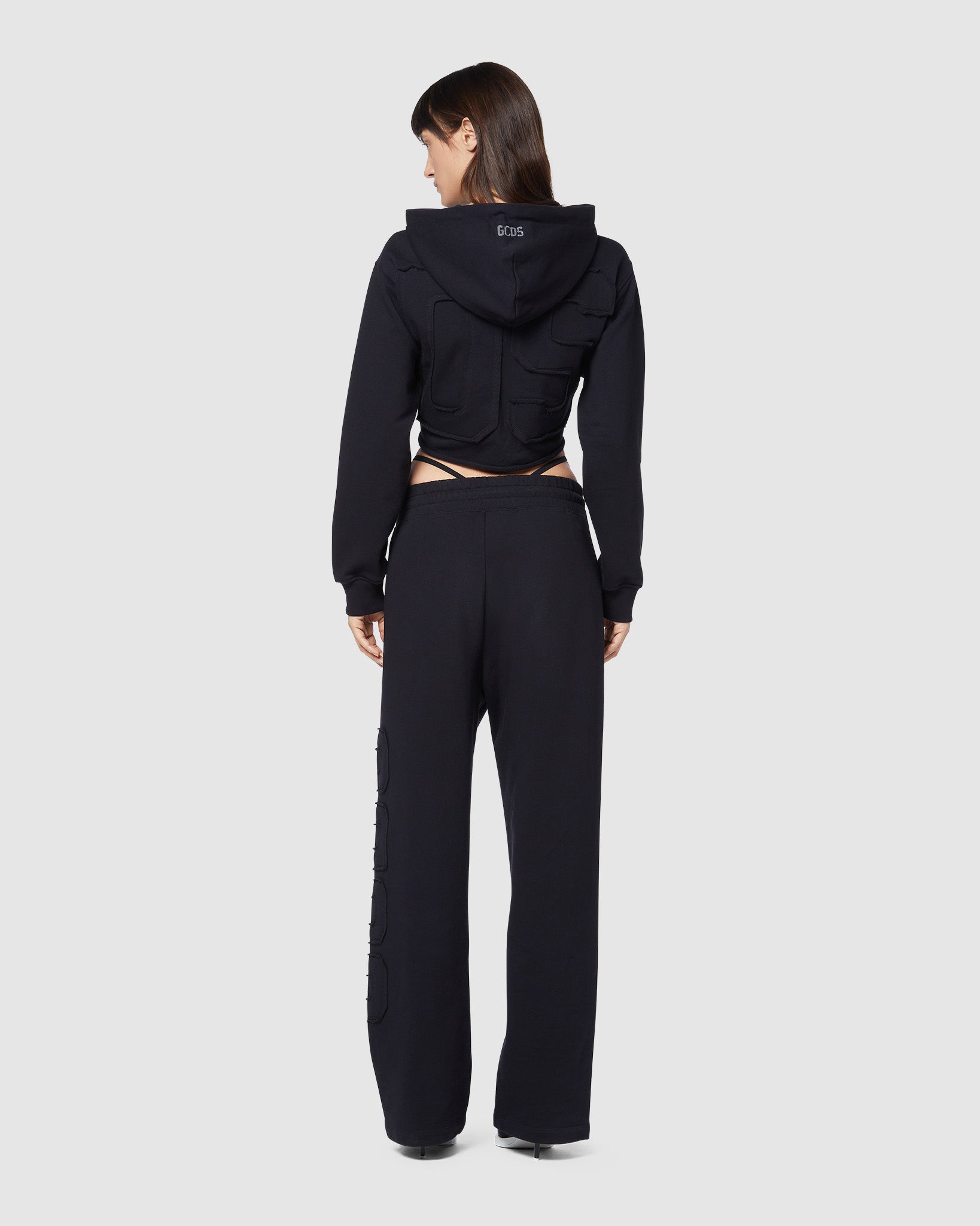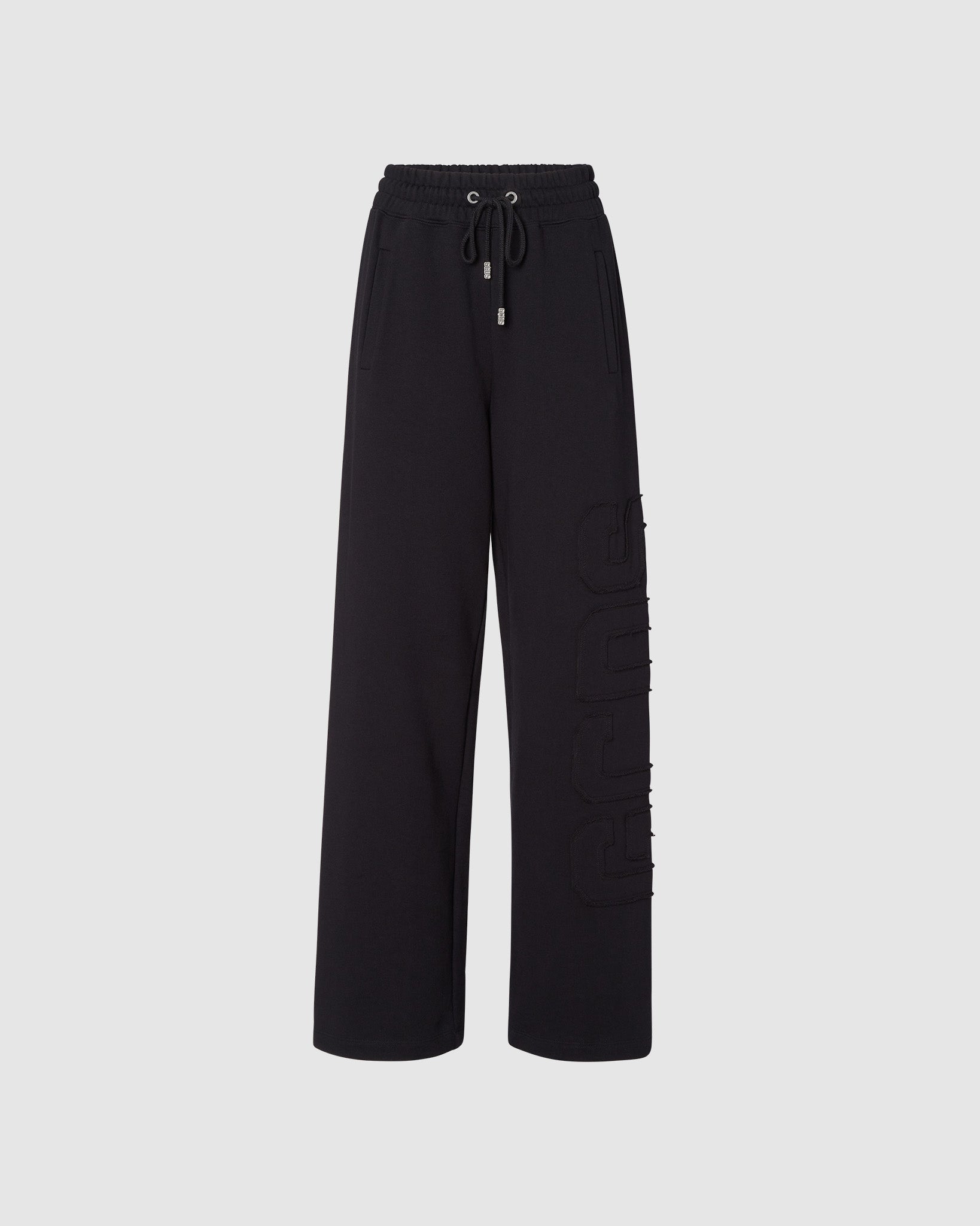 High-waisted cotton sweatpants with appliquéd raw-cut GCDS logo with matching top-stitching on the left leg. Welt pockets and elastic-waistband. Palazzo-leg cut. Seamless on the hip.