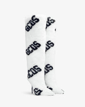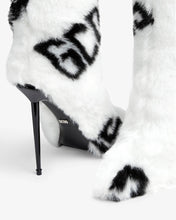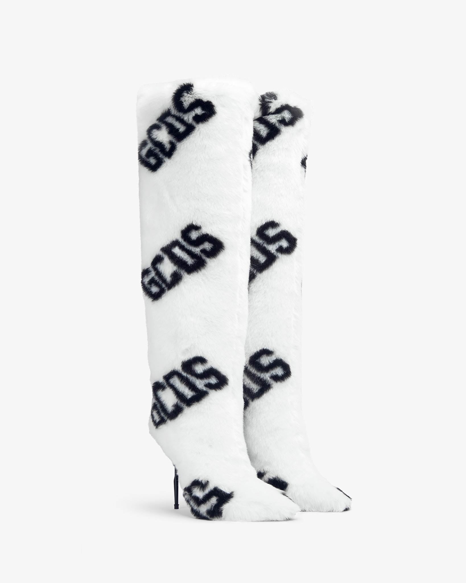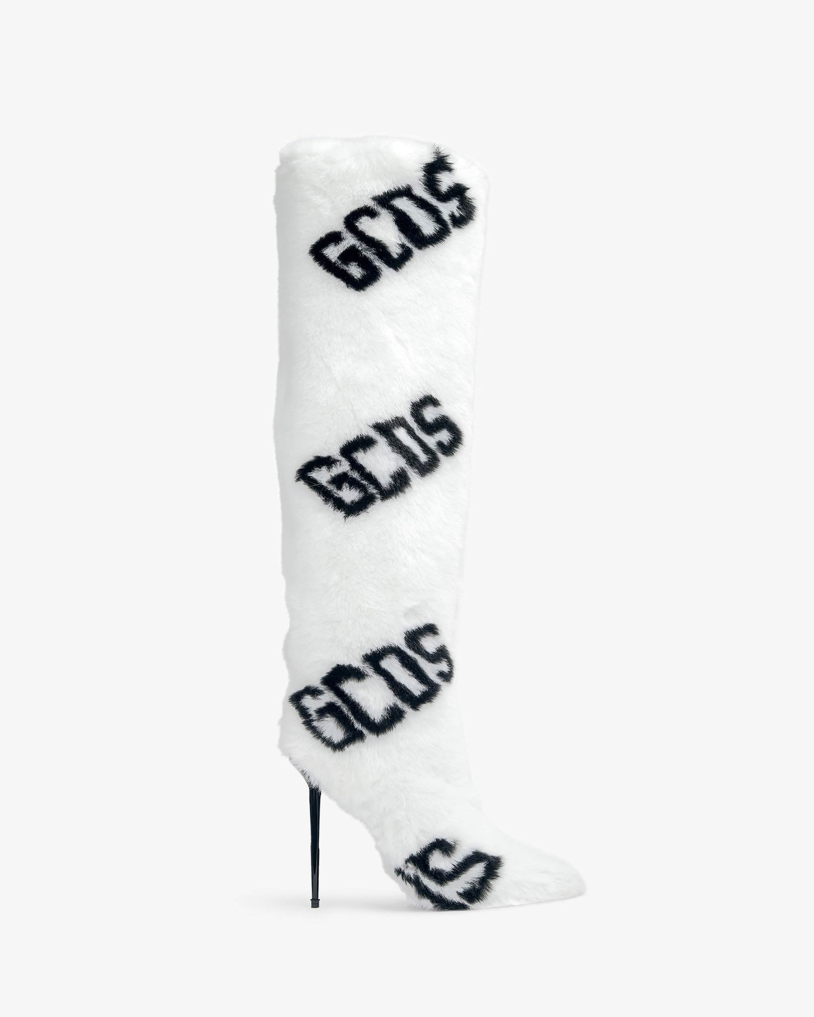 Knee-high faux fur stiletto boots with GCDS logo. The internal micro platform provides comfort and support while walking. Tube fit.