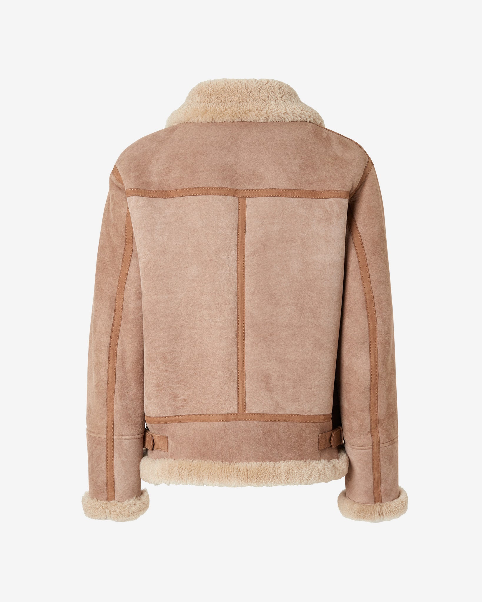 Shearling jacket with high collar and long sleeves. Front welt pockets and tone-on-tone side loop detail adjustable with buckle. Metal zipper closure with logoed zipper pull. The garment offers a timeless look with faux fur detailing around the collar, cuffs and bottom. Loose fit.
