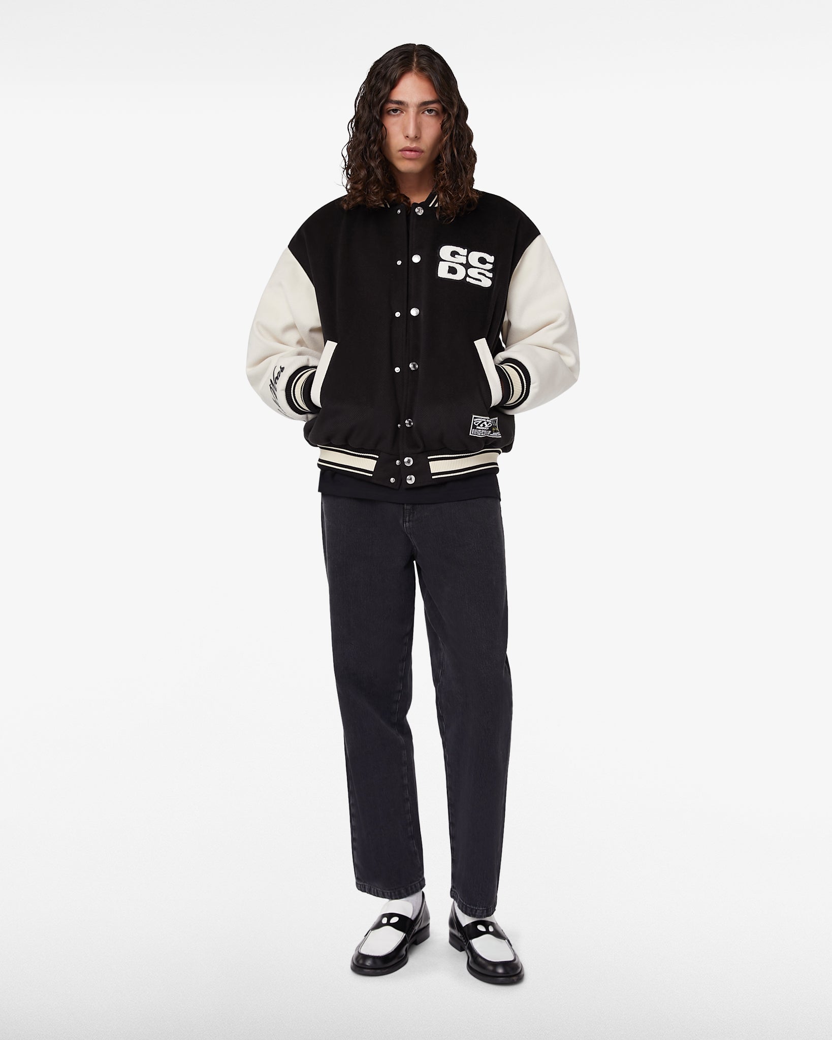 Bomber jacket with round neck and long sleeves with epaulettes. Made from a soft wool and cotton blend and finished with ribbing at the collar, waist and cuffs. The garment is embellished with contrasting sleeves, side welt pockets and a front snap closure. The "GCDS Signature" patch is placed on the front, along with an all-over Wirdo patch on the back.