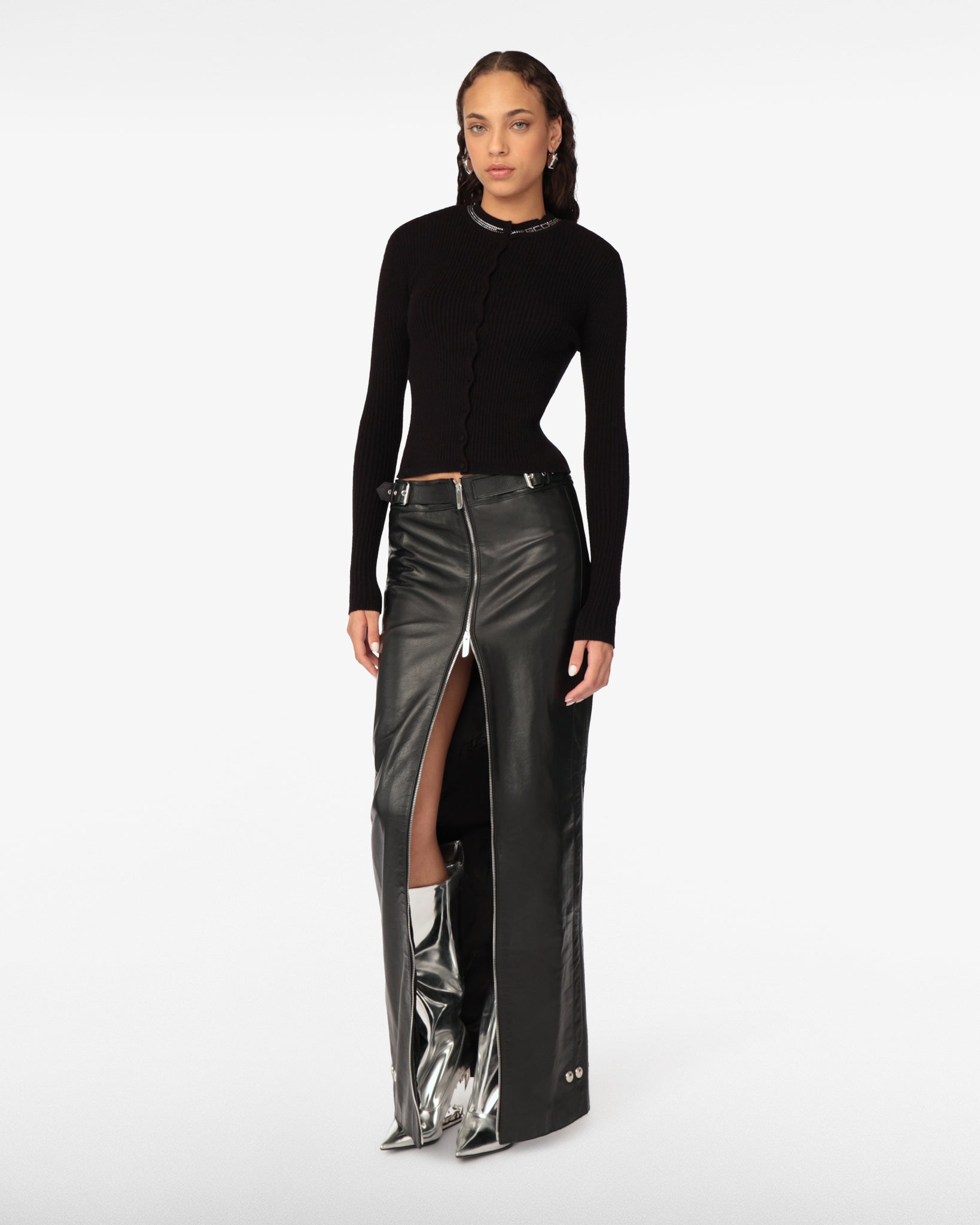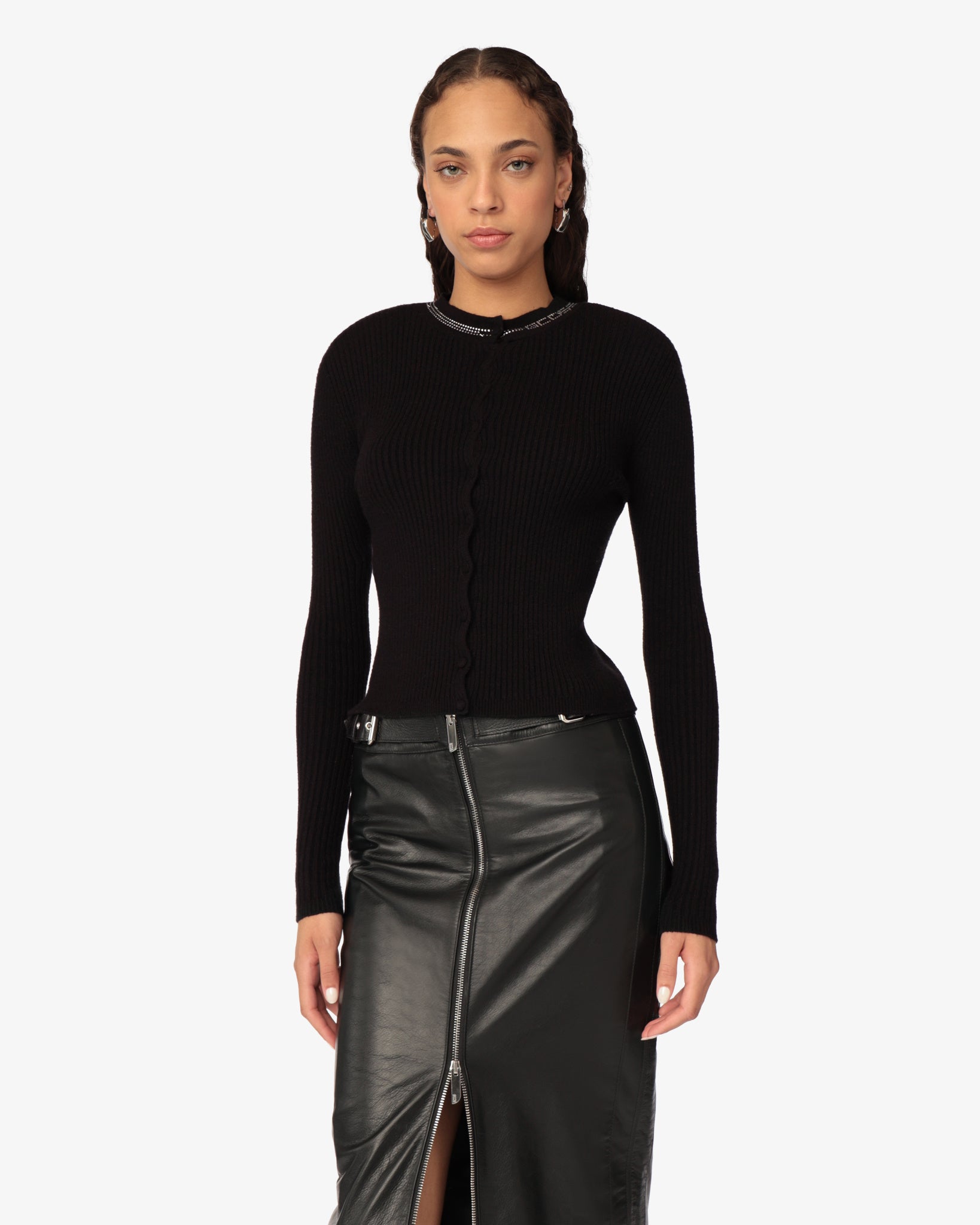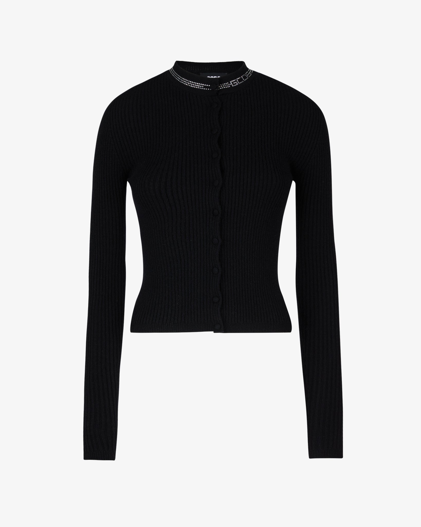 Ribbed cardigan made from a soft viscose with a slim silhouette. An eye-catching detail of three rows of rhinestones and the GCDS logo decorates the neckline. Finished with tone-on-tone covered buttons and internal shoulder pads.