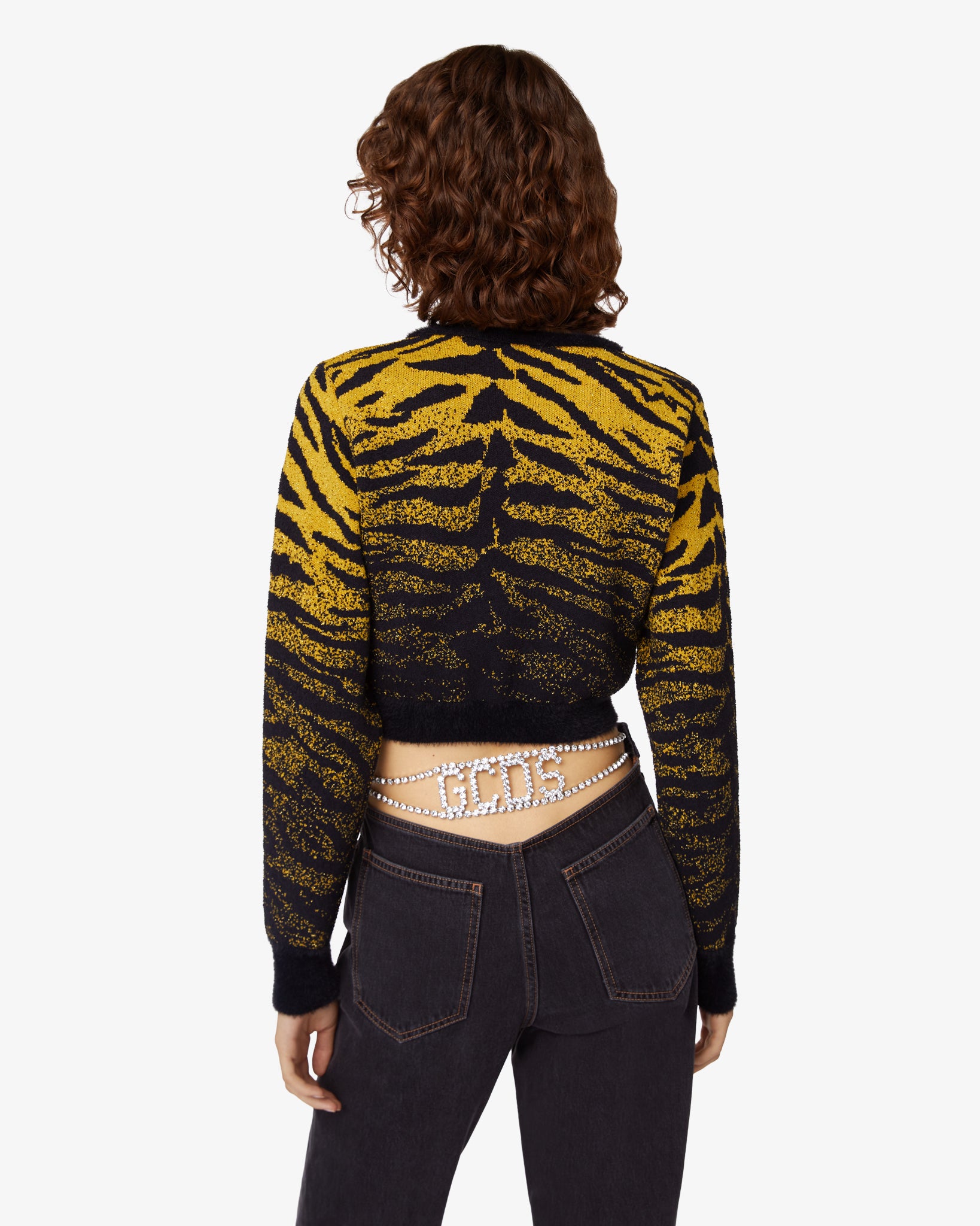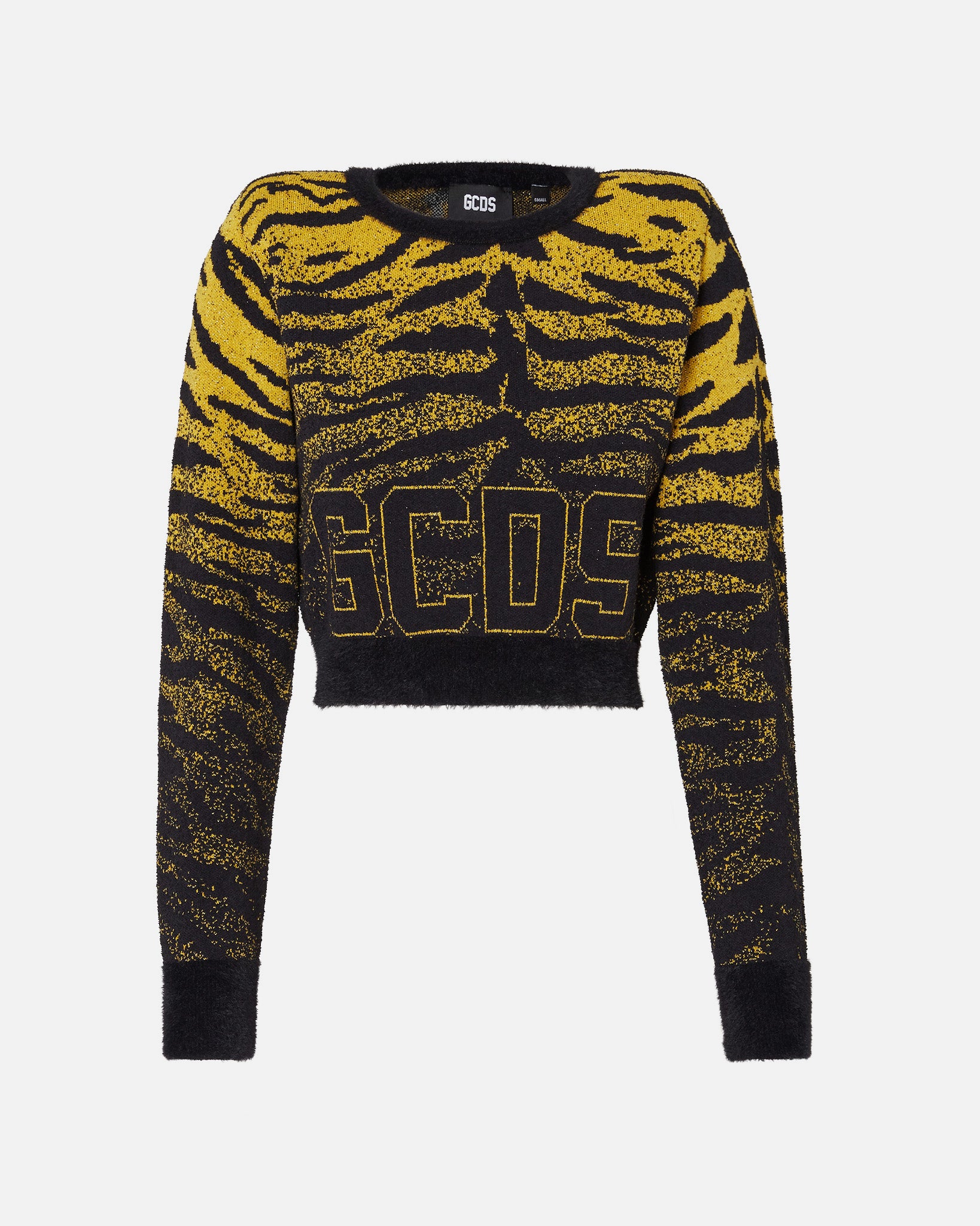 Lurex sweater with degradé effect jacquard Zebra pattern. Contrasting black fur effect trim. GCDS logo positioned at the bottom front completes the garment. Fit Crop.
