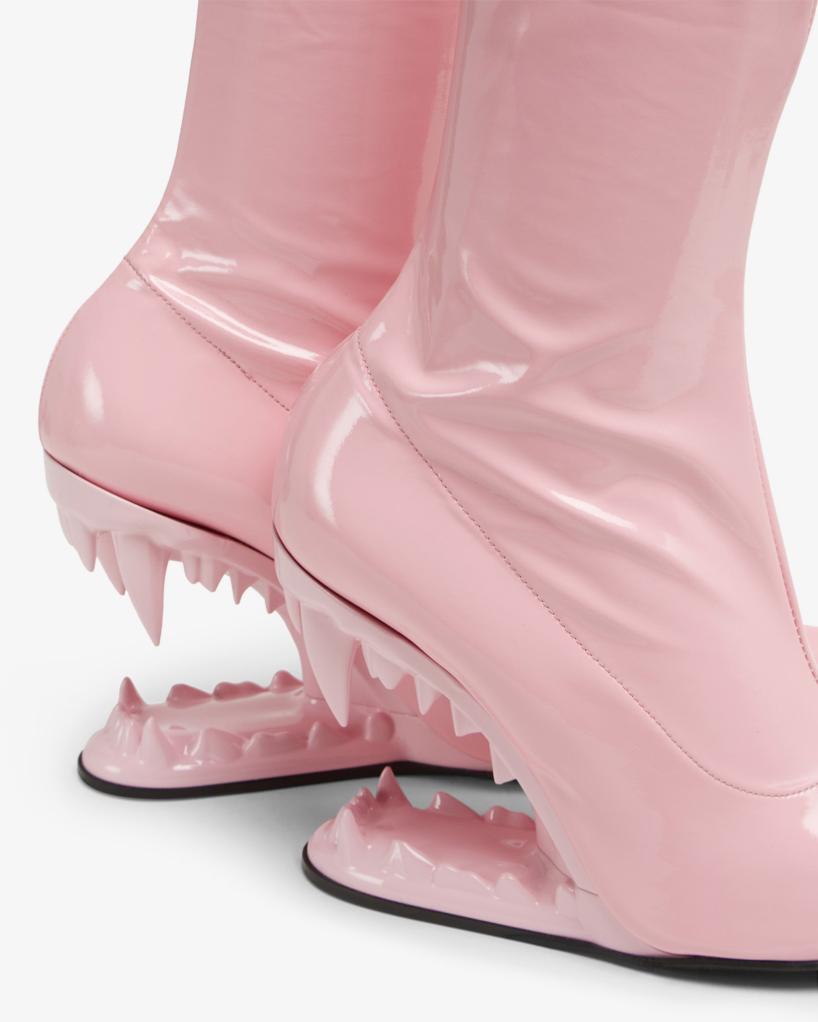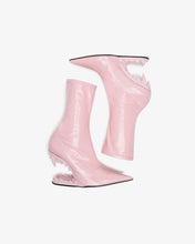 Ankle stretch socks boots made from pink vinyl, and featuring the iconic Morso heel with a glossy finish and tonal stitching. Constructed with leather insole and characterized by a pointed toe. Legs reach to mid-calf.