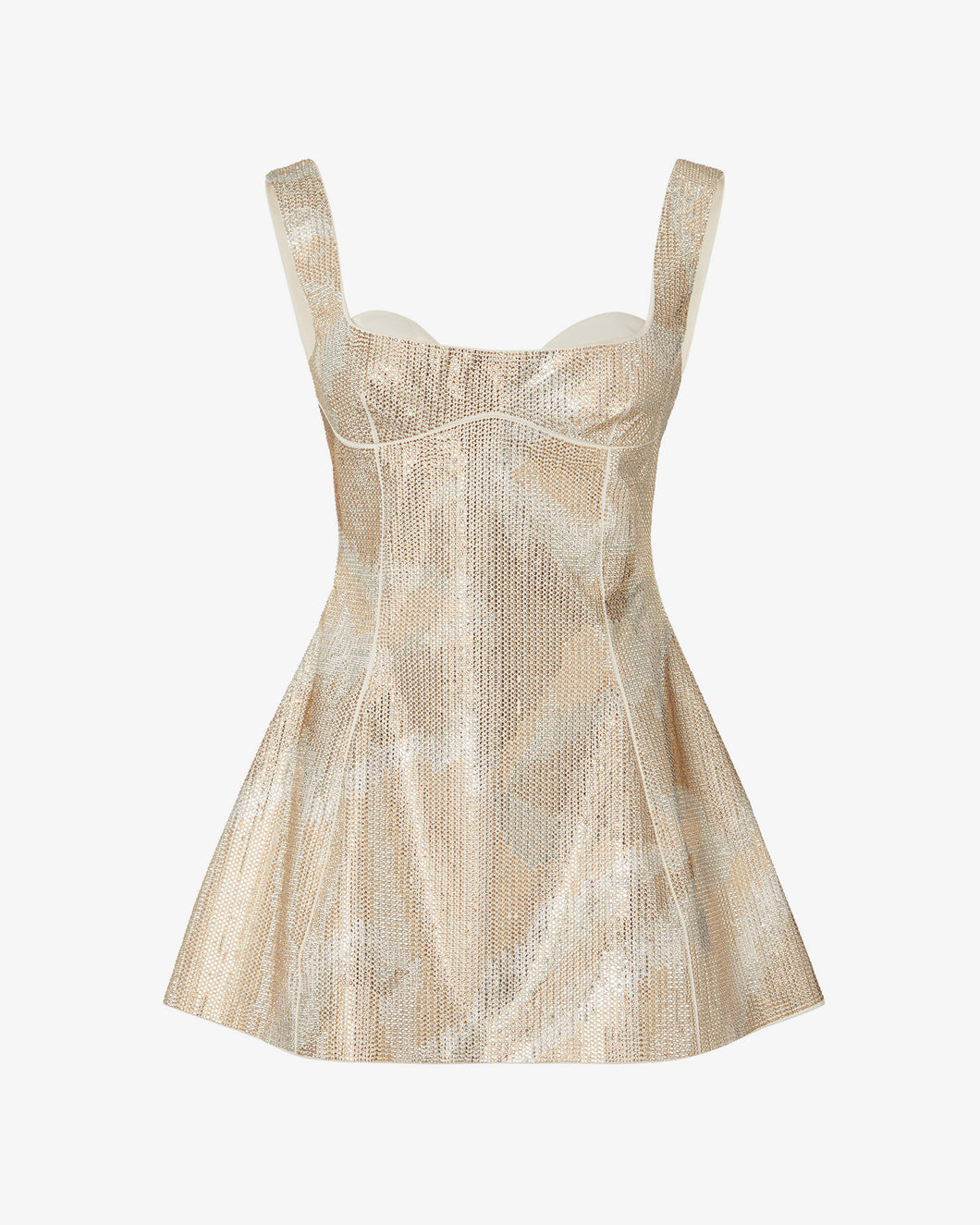 Hourglass cut mini dress embellished with small rhinestones in a Zebra pattern. Featuring thin straps and a square neckline highlighted by a built-up cup at the front.